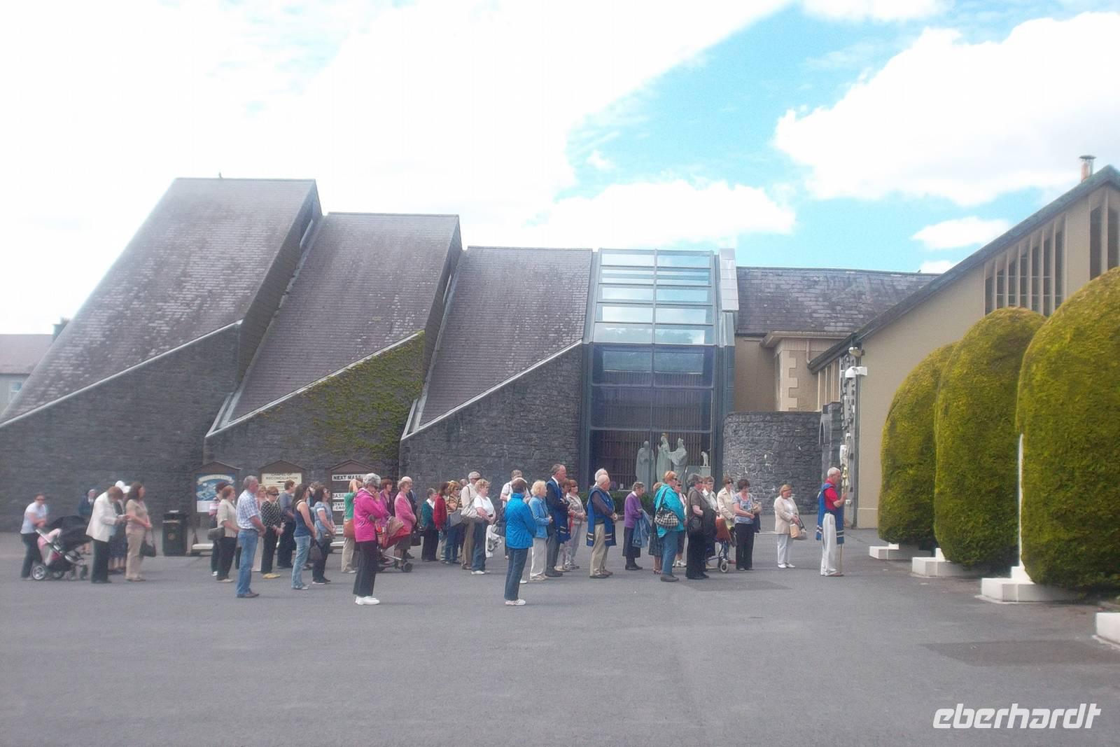 Nach der Mittagspause konnten wir als Extra einen Abstecher in Irlands bedeutendsten Wallfahrtsort Knock einbauen. Einst wurde hier sogar für den Papstbesuch 1979 ein Flughafen gebaut, denn der Ort ist in der katholischen Kirche durch seine Marienerscheinungen im vorigen Jahrhundert bekannt. Hunderttausende Gläubige, und Heilungsbedürftige und Neugierige aus Irland und der ganzen Welt kommen jährlich zu einer zu einer Wallfahrt hierher.