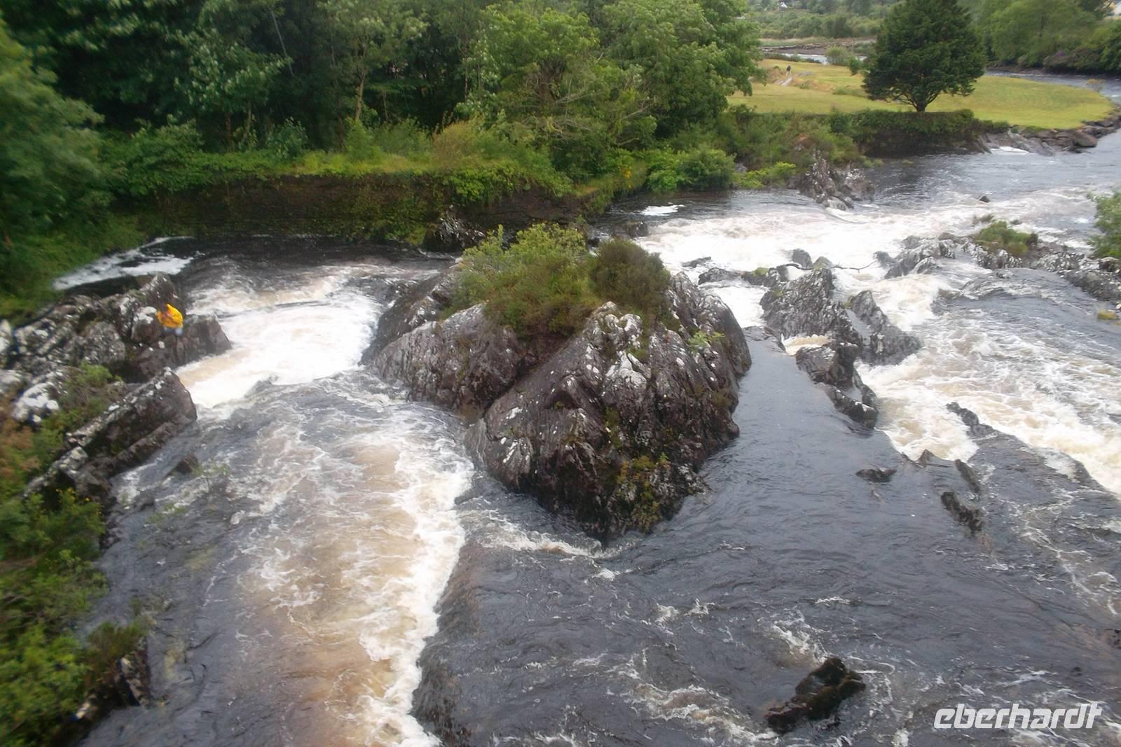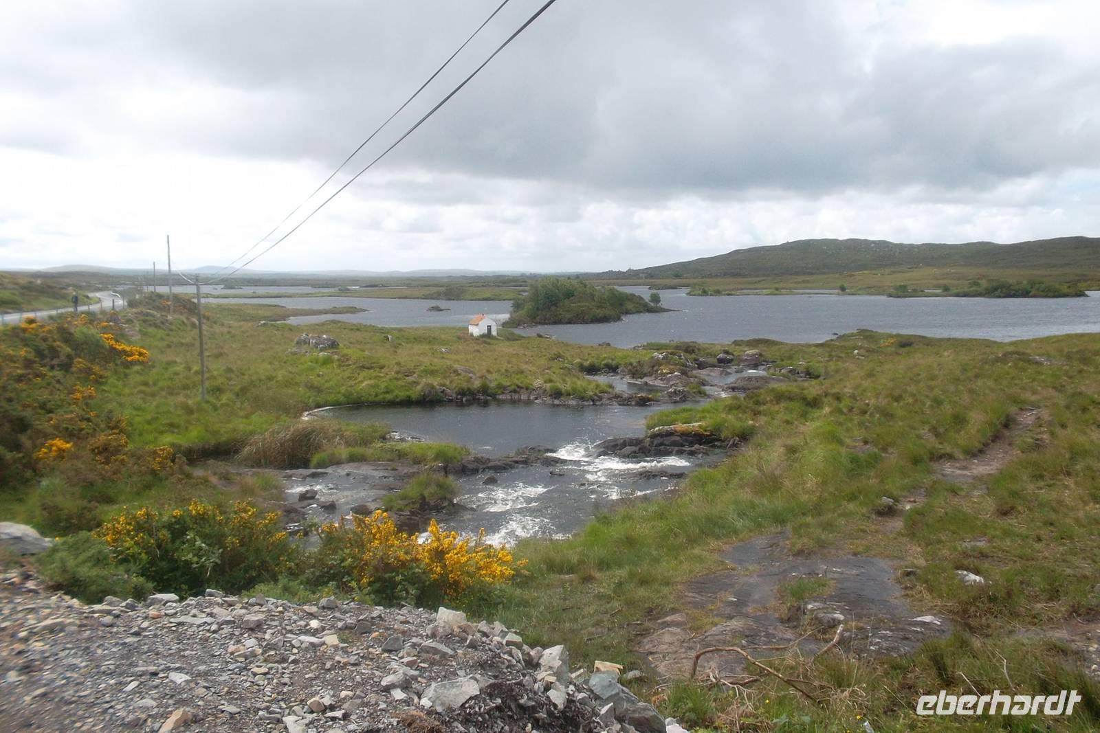 Andreas Marx, unsedr Buschauffeur, hatte heute seinen geplanten und in den Lenk- und Ruhezeiten vorgesehenen freien Tag. Dennoch stand morgens ein irischer Bus vor der Tür, gesteuert vom freundlichen, sehr ruhigen Chauffeur John. Wie immer mußten sich unsere Gäste von der Bequemlichkeit unseres 5-Sterne-Busses erst auf das anders gestaltete Fahrzeug umgewöhnen, aber dann statteten wir zu einer Connemara-Rundfahrt. Es soll hier „am grünsten“ in ganz Irland sein und dieses Mal hatten wir mehr Glück mit dem Wetter als in den Vorjahgen. John brachte uns erst einmal zu einem Fotostop an das malerisch gelegene Dunguaire Castle mit dem Erscheinungsbild aus dem 16. Jahrhundert unbd dann ging es auf der Küstenstraße nördlich der Galway Bay an der bereits gestern besuchten Stadt vorbei. In Spideal konnten wir einen Stopp für „natürliche Bedürfnisse“ einlegen und wir folgten der Küstenstraße. Sie scheint ins Landesinnere abzubiegen, bleibt aber weitgehend in der Nähe der Buchten, was man ab und zu am Wasserstand erkennen konnte. Wie überall an der irischen Küste gibt es hier einen großen Unterschied zwischen der Wasserhöhe bei Flut und bei Ebbe. Vorbei an „Radio Gaeltacht“, das nur in Gälisch sendet, und an Meeresbuchten, Torfmooren und Felslandschaften gelangten wir zum ersten großen Fotostopp. Malerisch fließen hier Stromschnellen in einen See, der von wilder Felsenlandschaft und windzerzausten Bäumen gerahmt wird