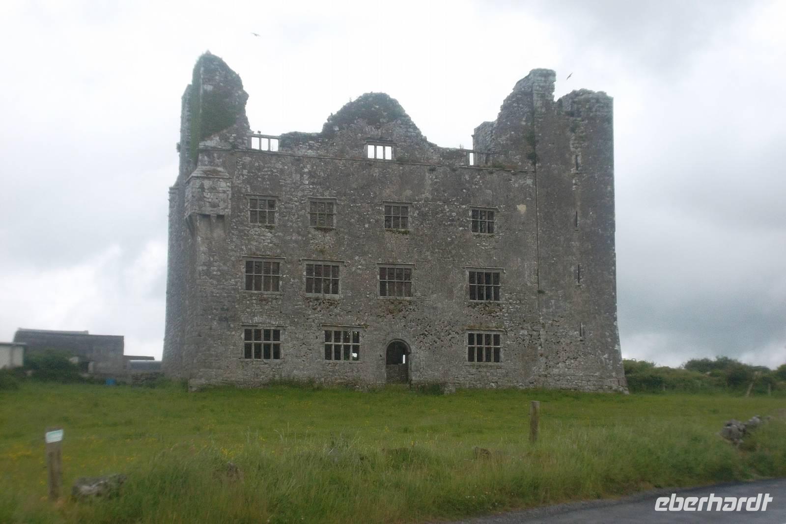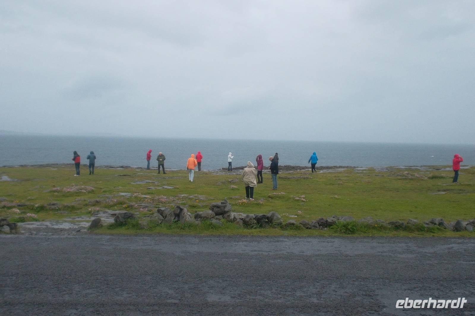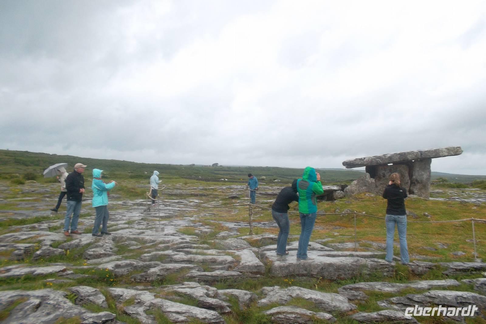 Heute Vormittag ging es aber vor allem um die zerklüftete Steinlandschaft des Burren. Diese Region, gebildet aus einzigartiger Karstlandschaft zeigt eine unverwechselbare Oberfläche. Mitunter knietiefe Rinnen und Gräben durchziehen die Oberfläche, zwischen den „Turloughs“. So werden die Tümpel genannt die durch ihr gesammeltes Regenwasser den Kalk im Gestein lösen und dadurch für die „Klüftung“ sorgen - bei der sich auch waagerecht die große Steinplatten abspalten. Sie bestimmen als „Clints“ zusammen mit den „Grykes“, den Gräben, das Bild des Burren. Einige Straßen durchziehen die knapp 300 m² große Region und führen zu den wenigen kleinen Orten wie Corofin oder Kilfenora und zu alten Denkmälern wie den „Tower Houses“ - den befestigten Clansitzen oder dem berühmten Pulnabrone Dolmen, einem steinzeitlichen Grab, zu dessen Bau man vor tausenden Jahren eben diese abgeklüfteten Kalksteinplatten verwendet hatte..