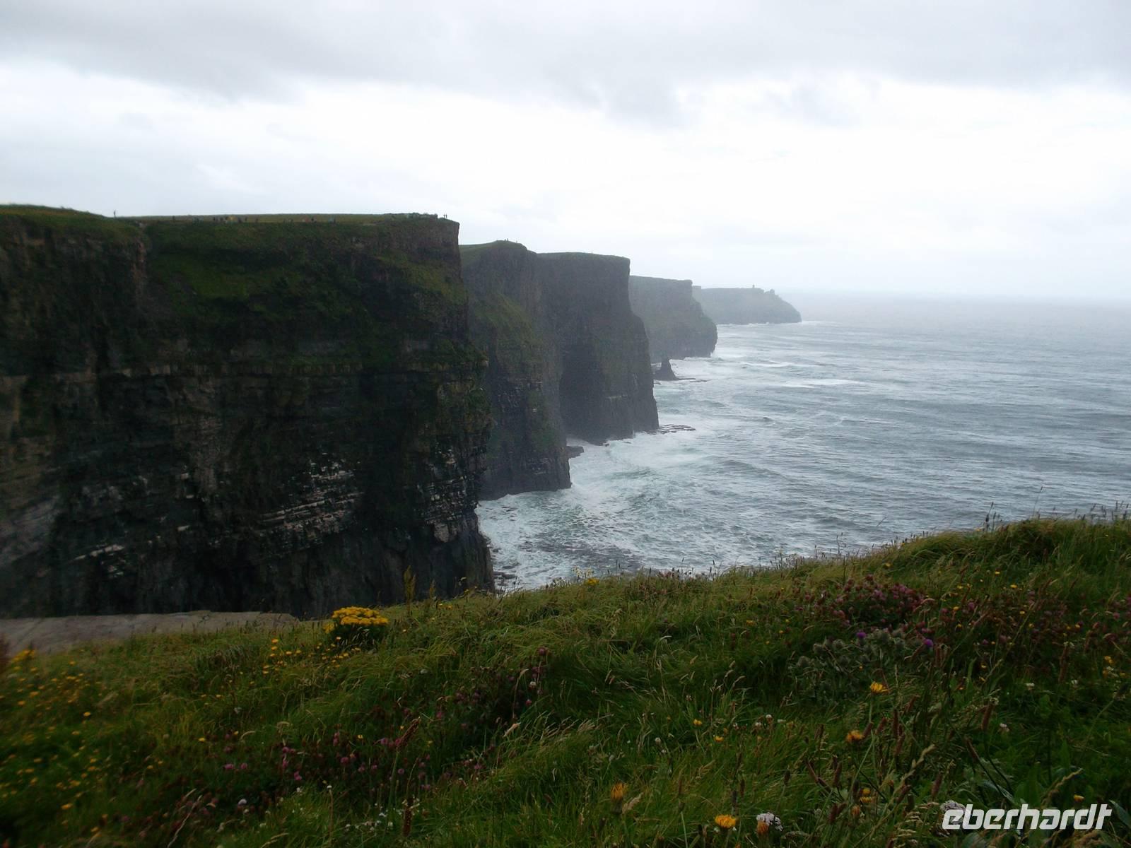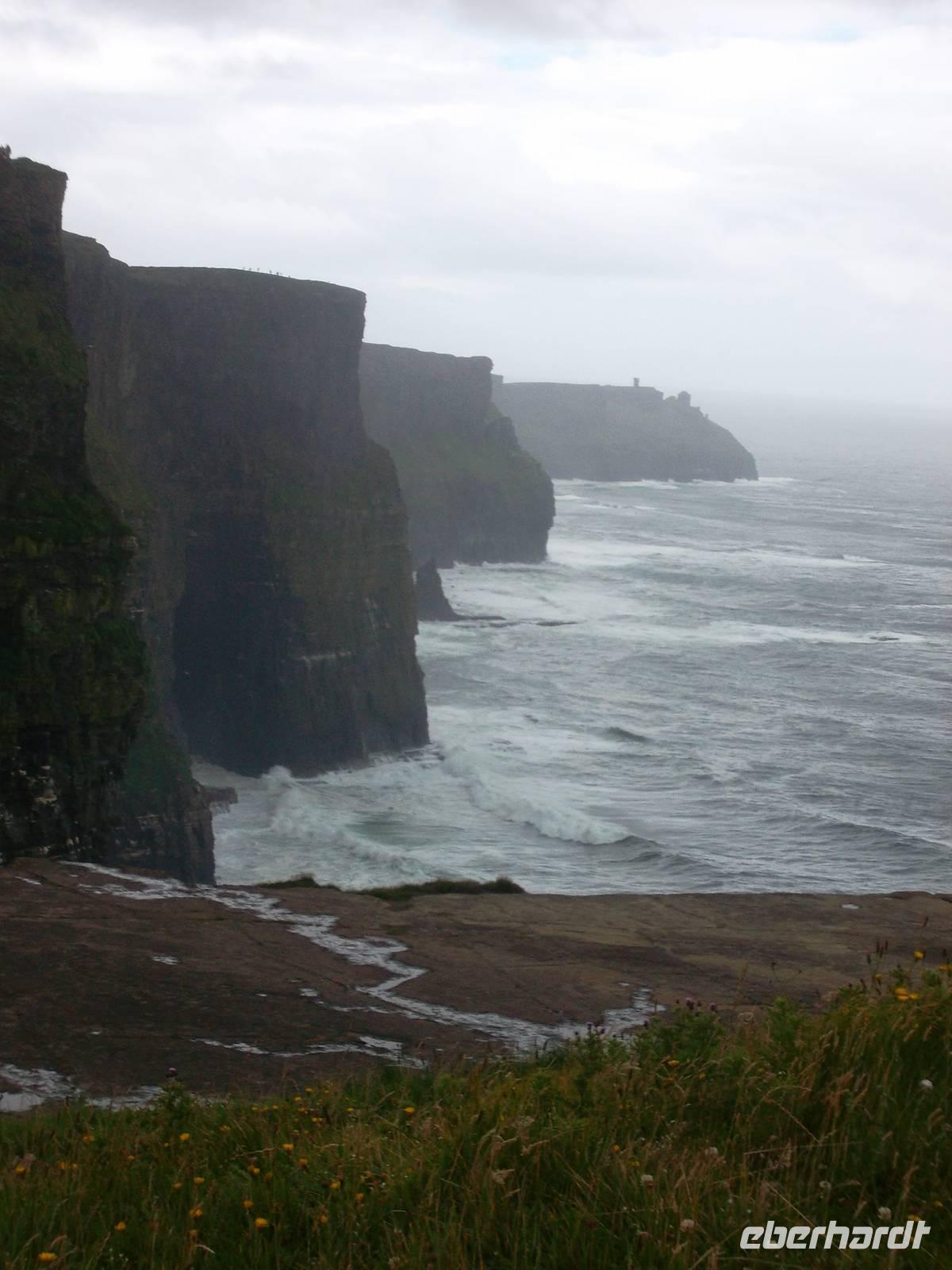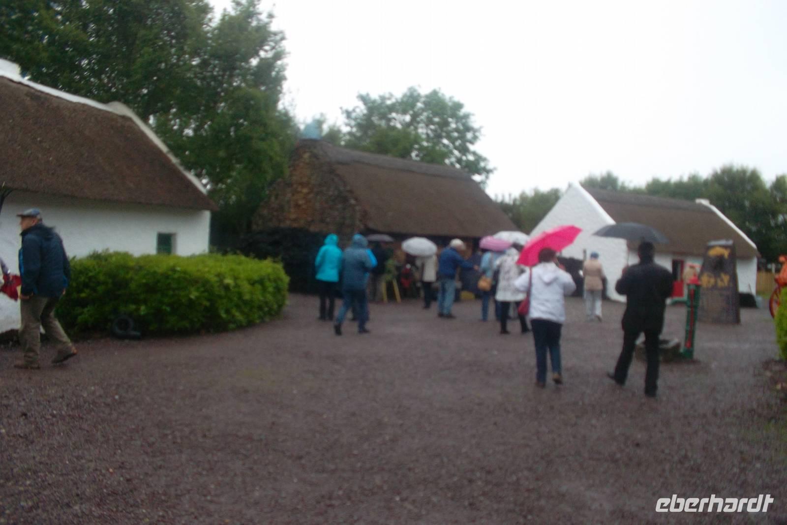 Trotz schlechtem Wetter fuhren wir ab Ballyvaughn auf der schönen Küstenstraße, die den Burren zum Meer hin abschließt. Am Rande der Region erstrecken sich die Klippen von Moher, eine der bekanntesten Sehenswürdigkeiten und größten landschaftlichen Schönheiten Irlands. Leider war das Wetter an den „Cliffs of Moher“ schlecht und wir konnten nur weniges von der eigentlichen Schönheit erahnen: Nahezu senkrecht steigen die Cliffs aus dem atlantischen Ozean , sind zwischen 120 und 180 m hoch. Sie reichen weit acht Kilometer am Meer entlang und schwingen sich, nahe dem neuen Besucherzentrum, am O'Brien's Tower sogar auf 214m hinauf. Seit 2007 gibt es hier neue, gesicherte Spazierwege, die herrliche Ausblicke bieten - wenn denn das Wetter mitspielt. Wir hatten einen der häßlicheren irischen Tage erwischt und haben nicht allzuviel sehen können, denn für längere Spaziergänge und tolle Fotos war es zu ungemütlich. Nach der Mittagspause, am Bus setzten wir unseren Weg fort und besuchten das Bunratty Castle. Hier gibt es einen Folk Park bei der einstige Normannenburg: in Bunratty zeigt ein Freilichtmuseum der besonderen Art die Burg als Museum mit der einstigen Bankett- und Audienzhalle und im Burgpark errichtete man aus traditionellen irischen Bauern- und Stadthäusern eine Art „Typisches“ irisches Dorf des 19. Jahrhunderts, dessen Häuser man betreten und wo man auch einmal Torfrauch schnuppern kann. Bei immer noch schlechtem Wetter ging es weiter, vorbei an Limerick, der Stadt der bekannten Fünfzeiler, in die Hauptstadt der Grafschaft Kerry, nach Tralee. Hier wohnten wir wieder traditionell im größten Hotel der Stadt gegenüber dem irischen Volkstheater.