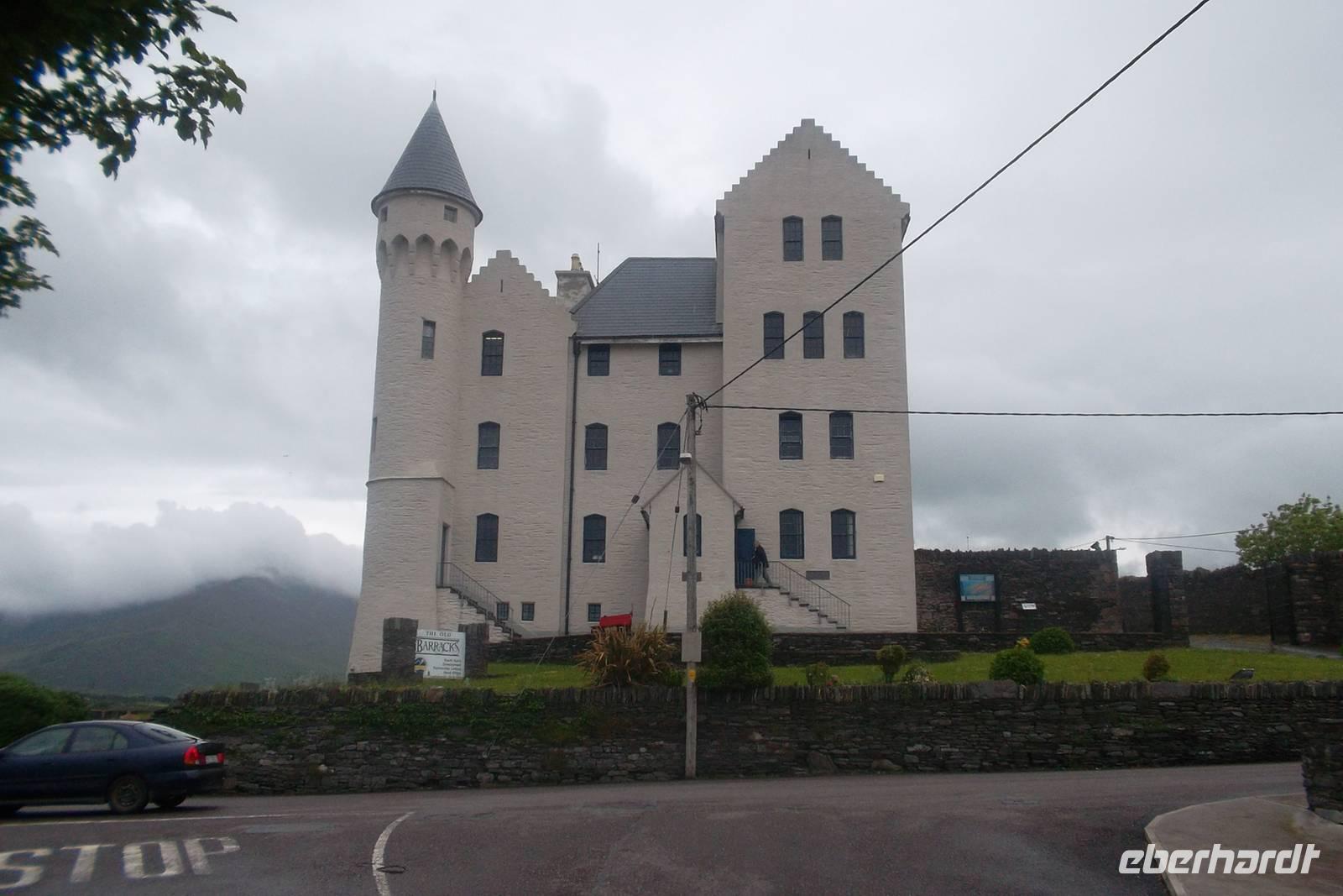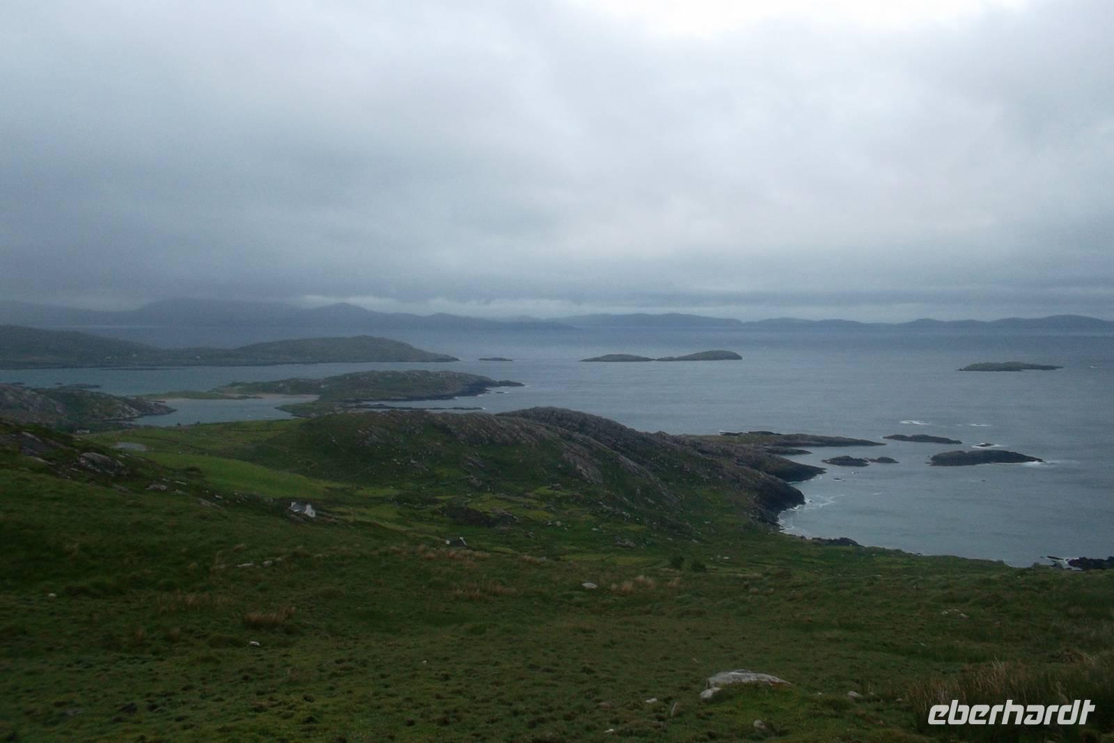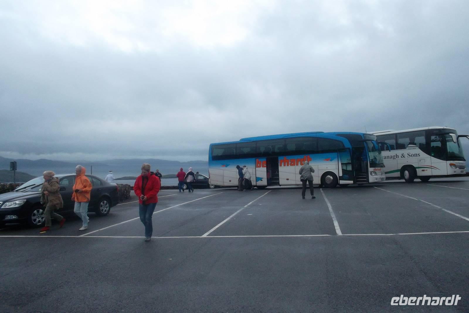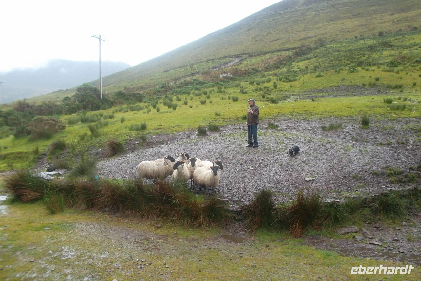 Die Küstenstraße von Kerry, rings um die Halbinsel Iveragh wird zumeist „Ring of Kerry“. Genannt und gehört zu den berühmtesten und schönsten Küstenstraßen Europas. Im Allgemeinen wird die Ringstraße „gegen die Uhrzeigerrichtung“ gefahren und beginnt am Ort Killorglin, bekannt für seine „Puck Fair“ im August, bei der traditionell ein Ziegenbock zum König gewählt wird. Hier beginnen riesige Torffelder, die in den letzten Jahrhunderten „abgeerntet“ wurden und es gibt das letzte erhaltene „bog village“. In diesem, ein Torf-Dorf, heute Museum lebten alle traditionell vom Torfstechen und dem Handel mit diesem Material. Originelle Cottages und viel Gerät um den Torf bilden das Flair des Ortes, der durch den danebenliegende Gasthof, dem typischen Pub „Red Fox Inn“ zusätzlich bekannt wurde. Fast alle Busse halten an diesem touristischen Punkt, denn hier gibt es nicht nur Souvenirs, sondern der Wirt behauptet, den besten Irish Coffee herzustellen. In wiederum hässlich-nassen Wetter fuhren wir weiter zum Schäfer Brendan. Der ist an zahllose Besucher gewöhnt und zeigt ihnen, wie er mit seinen Hunden arbeitet und sie ausbildet, Schafe zusammenzutreiben. Eine regelrechte Show, gewürzt mit echten irischen Humor hat er daraus gemacht, in der alle in Irland verwendeten Schafsrassen vorführt und erklärt, sowie Ruf.- und Pfeifsignale beim Arbeiten mit seinen Hunden aus der Rasse der Bordercollies. gehören. Trotz des Regens ging alles ganz gut, denn unsere, eine weitere deutsche und eine französische Gruppe konnten die Vorführung aus einem überdachten Unterstand heraus beobachten, während ich die Erläuterungen des Schäfers übersetzte. Als nächster Anlaufpunkt am Ring of Kerry erwartet den Besucher der hübsche Ort Cahersiveen. Nach dem Fotostopp an einer alten Polizeiwache erlaubte uns ein Abstecher die Besichtigung eines typischen alten „stoneforts“. Die aus Trockenmauerwerk errichteten Ringforts waren einst Fluchtburgen und Adelssitze. Ausnahmsweise ließ ich meine Gäste allein zum Besichtigen des Cahergall stone fort - restauriert und begehbar marschieren, denn unser Chauffeur Andreas und ich brauchten die Zeit: Wir hatten ein Picknick vorbereitet, nachdem viele Gäste dies kannten und uns darauf angesprochen hatten. Zwar braucht man dazu eigentlich gutes Wetter, aber wir hatten nicht mit der Fortsetzung des Dauerregens gerechnet. Dennoch hatten wir wohlweislich nur ein „abgespecktes“ Picknick eingekauft, um notfalls den leeren Bus als „Restaurant“ nutzen zu können. Aufgrund des anhaltend miesen Wetters wurde die auch nötig und wir bauten die Leckereien im Bus auf - denn unser 5-Sterne-Bus verfügte über eine regelrechte Küche mit großer Dachfläche. Also ließen es sich die Gäste schmecken, wir tranken Rotwein und alle wurden wirklich satt - was wollten wir mehr?