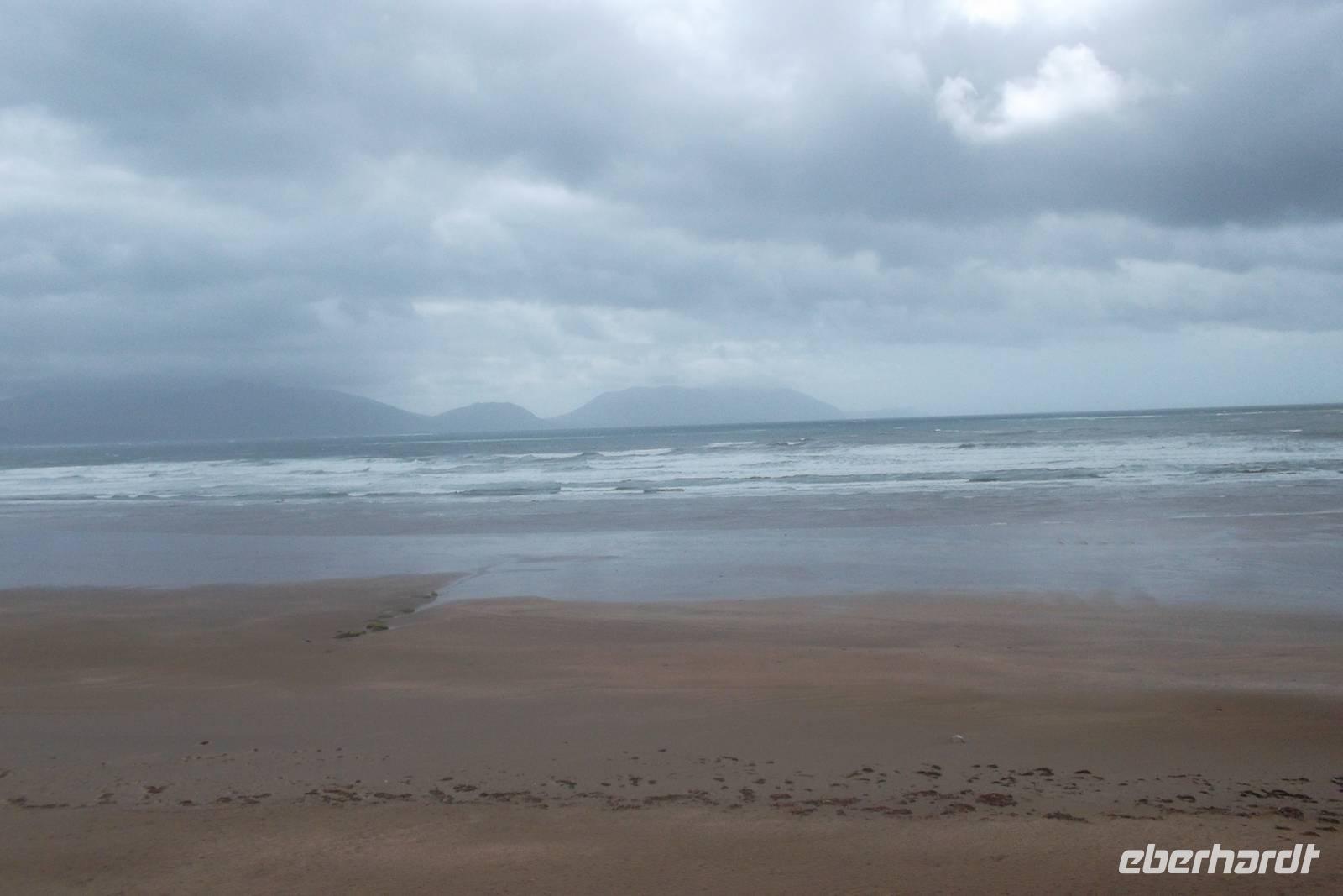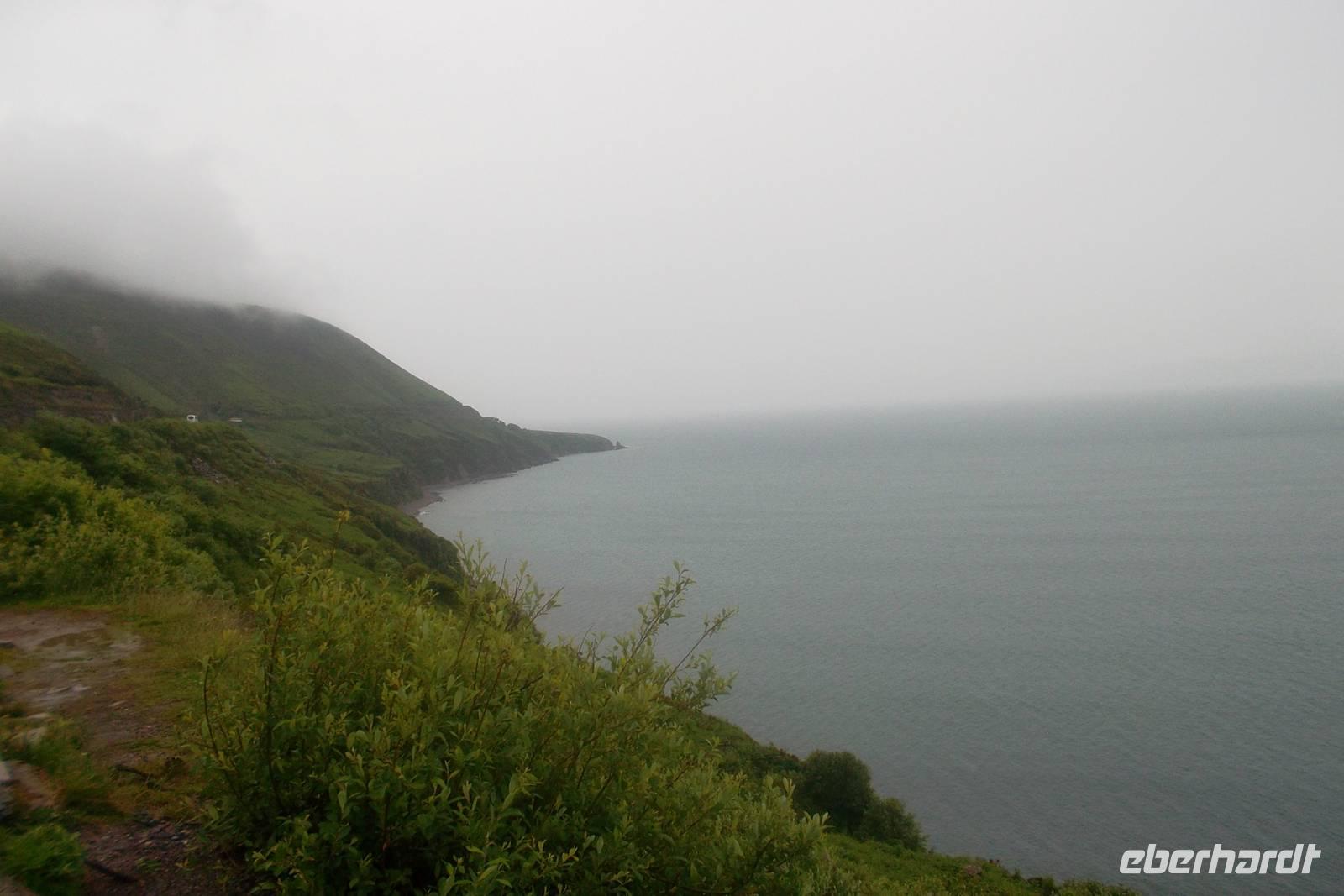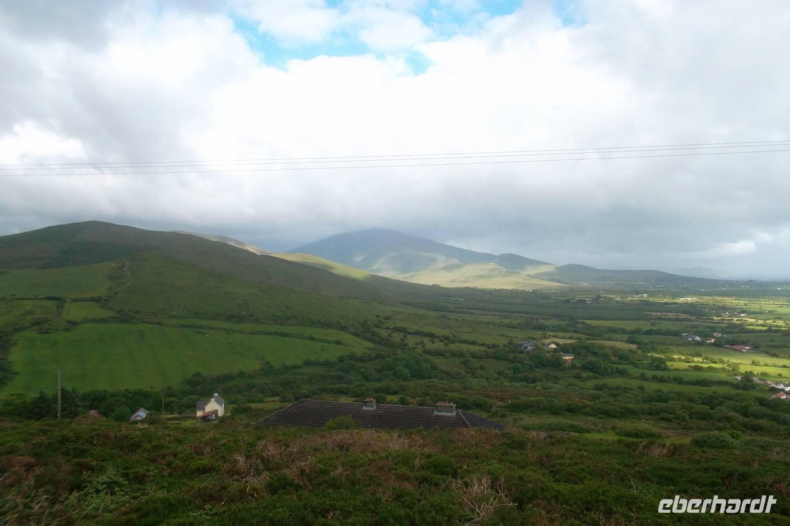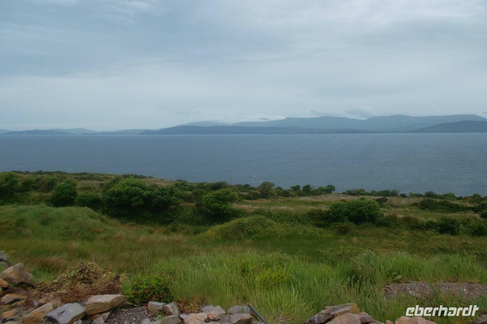 Die Küstenstraße von Kerry, rings um die Halbinsel Iveragh wird zumeist „Ring of Kerry“. Genannt und gehört zu den berühmtesten und schönsten Küstenstraßen Europas. Im Allgemeinen wird die Ringstraße „gegen die Uhrzeigerrichtung“ gefahren und beginnt am Ort Killorglin, bekannt für seine „Puck Fair“ im August, bei der traditionell ein Ziegenbock zum König gewählt wird. Hier beginnen riesige Torffelder, die in den letzten Jahrhunderten „abgeerntet“ wurden und es gibt das letzte erhaltene „bog village“. In diesem, ein Torf-Dorf, heute Museum lebten alle traditionell vom Torfstechen und dem Handel mit diesem Material. Originelle Cottages und viel Gerät um den Torf bilden das Flair des Ortes, der durch den danebenliegende Gasthof, dem typischen Pub „Red Fox Inn“ zusätzlich bekannt wurde. Fast alle Busse halten an diesem touristischen Punkt, denn hier gibt es nicht nur Souvenirs, sondern der Wirt behauptet, den besten Irish Coffee herzustellen. In wiederum hässlich-nassen Wetter fuhren wir weiter zum Schäfer Brendan. Der ist an zahllose Besucher gewöhnt und zeigt ihnen, wie er mit seinen Hunden arbeitet und sie ausbildet, Schafe zusammenzutreiben. Eine regelrechte Show, gewürzt mit echten irischen Humor hat er daraus gemacht, in der alle in Irland verwendeten Schafsrassen vorführt und erklärt, sowie Ruf.- und Pfeifsignale beim Arbeiten mit seinen Hunden aus der Rasse der Bordercollies. gehören. Trotz des Regens ging alles ganz gut, denn unsere, eine weitere deutsche und eine französische Gruppe konnten die Vorführung aus einem überdachten Unterstand heraus beobachten, während ich die Erläuterungen des Schäfers übersetzte. Als nächster Anlaufpunkt am Ring of Kerry erwartet den Besucher der hübsche Ort Cahersiveen. Nach dem Fotostopp an einer alten Polizeiwache erlaubte uns ein Abstecher die Besichtigung eines typischen alten „stoneforts“. Die aus Trockenmauerwerk errichteten Ringforts waren einst Fluchtburgen und Adelssitze. Ausnahmsweise ließ ich meine Gäste allein zum Besichtigen des Cahergall stone fort - restauriert und begehbar marschieren, denn unser Chauffeur Andreas und ich brauchten die Zeit: Wir hatten ein Picknick vorbereitet, nachdem viele Gäste dies kannten und uns darauf angesprochen hatten. Zwar braucht man dazu eigentlich gutes Wetter, aber wir hatten nicht mit der Fortsetzung des Dauerregens gerechnet. Dennoch hatten wir wohlweislich nur ein „abgespecktes“ Picknick eingekauft, um notfalls den leeren Bus als „Restaurant“ nutzen zu können. Aufgrund des anhaltend miesen Wetters wurde die auch nötig und wir bauten die Leckereien im Bus auf - denn unser 5-Sterne-Bus verfügte über eine regelrechte Küche mit großer Dachfläche. Also ließen es sich die Gäste schmecken, wir tranken Rotwein und alle wurden wirklich satt - was wollten wir mehr?