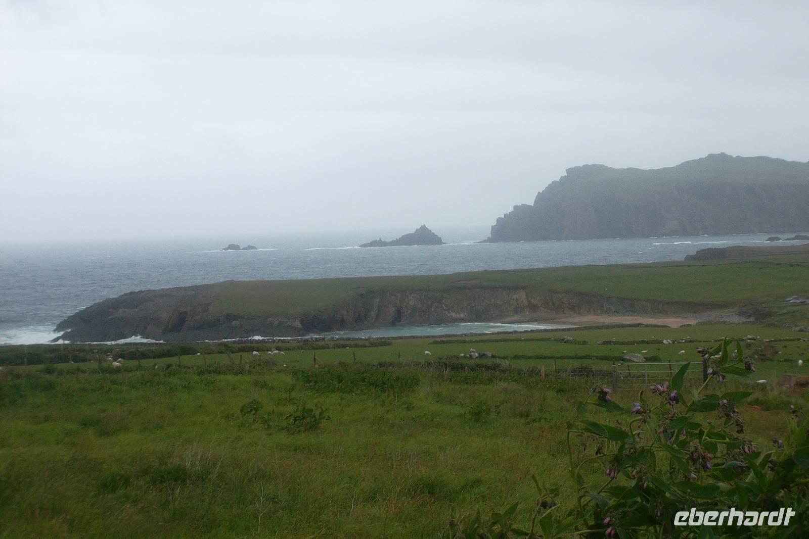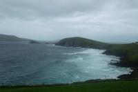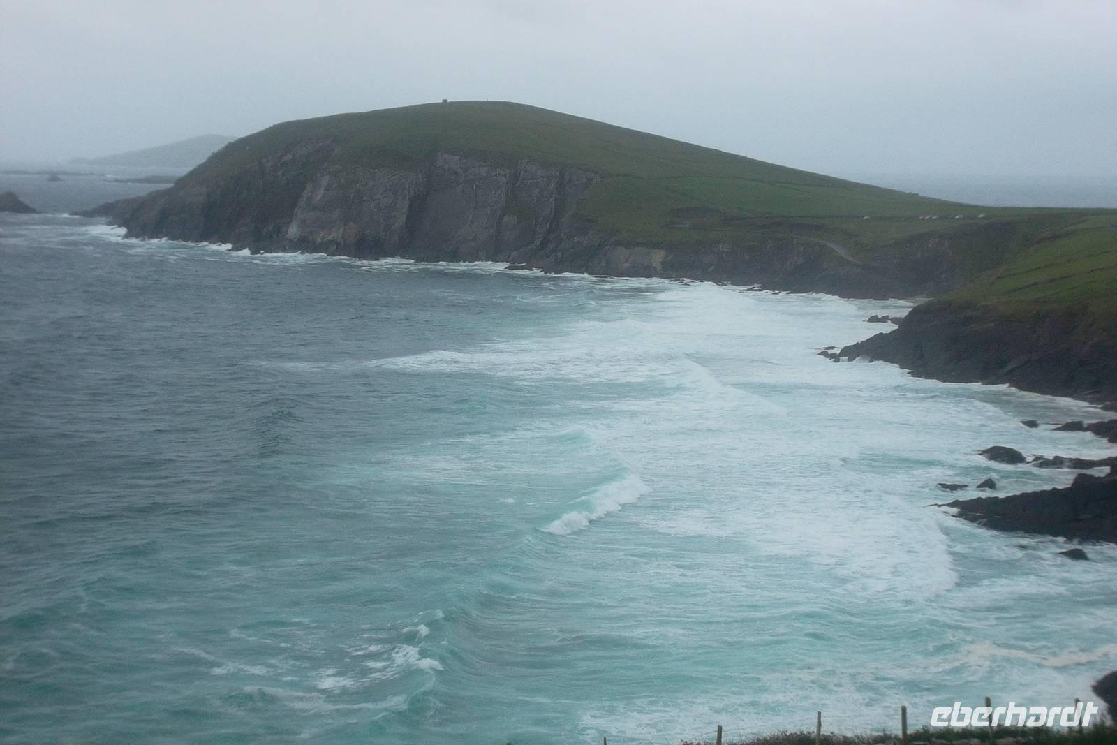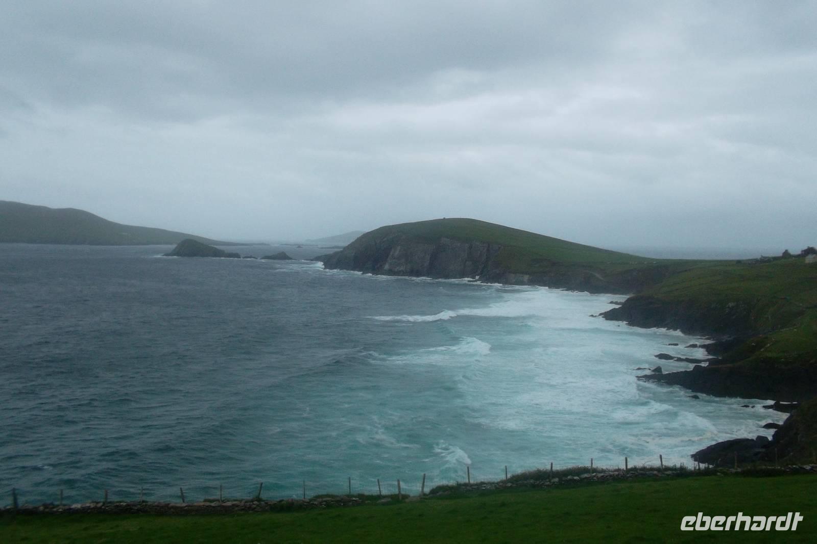 Heute war das Wetter auch nicht viel besser als gestern, doch wir machten uns gespann auf den Weg zur Halbinsel Dingle. Zwei Fotostopps - ein erster kurz hinter Tralee an der Mühle von Blennerville, einst so etwas wie der Kern eines kleinen Industriegebietes und ein zweiter nach einigen Kilometern zu einem herrlichen Panoramablick auf die Bucht von Tralee. Der erste längere Stopp zeigte uns Dingle. Die „westlichste Stadt Europas“ hat etwa 2000 Einwohner und mit ihren buntbemalten Häuschen, traditionellen Pubs und Souvenirläden und den hübschen Ladenschildern fast noch malerischer als Clifden, das wir zwei Tage zuvor kennengelernt hatten und das etwa ebenso groß ist. Nach Freizeit an der Dingle Bay, in der Stadt und am hübschen Hafen von Dingle folgten wir per Bus der Küstenstraße des „Slea Head Drive“. Er ist einer der schönsten, aber auch am schwersten zu befahrenden der Küstenwege Irlands. Obwohl er eng und schwierig zu fahren ist, wird er gern genutzt, denn enthält traumhafte Ausblicke auf Küstenszenerien und jede Menge herrliche Fotomotive. Wie immer hielten wir zuerst an den unweit der Straße befindlichen uralten Unterkünften der Einsiedlermönche. Im Englischen werden sie „beehive-huts“, auf Deutsch Bienenkorbhütten genannt, wozu natürlich die seltsame Form der im 6. und 7. nachristlichen Jahrhundert aus Trockenmauerwerk aufgeschichteten Behausungen geführt hat. .