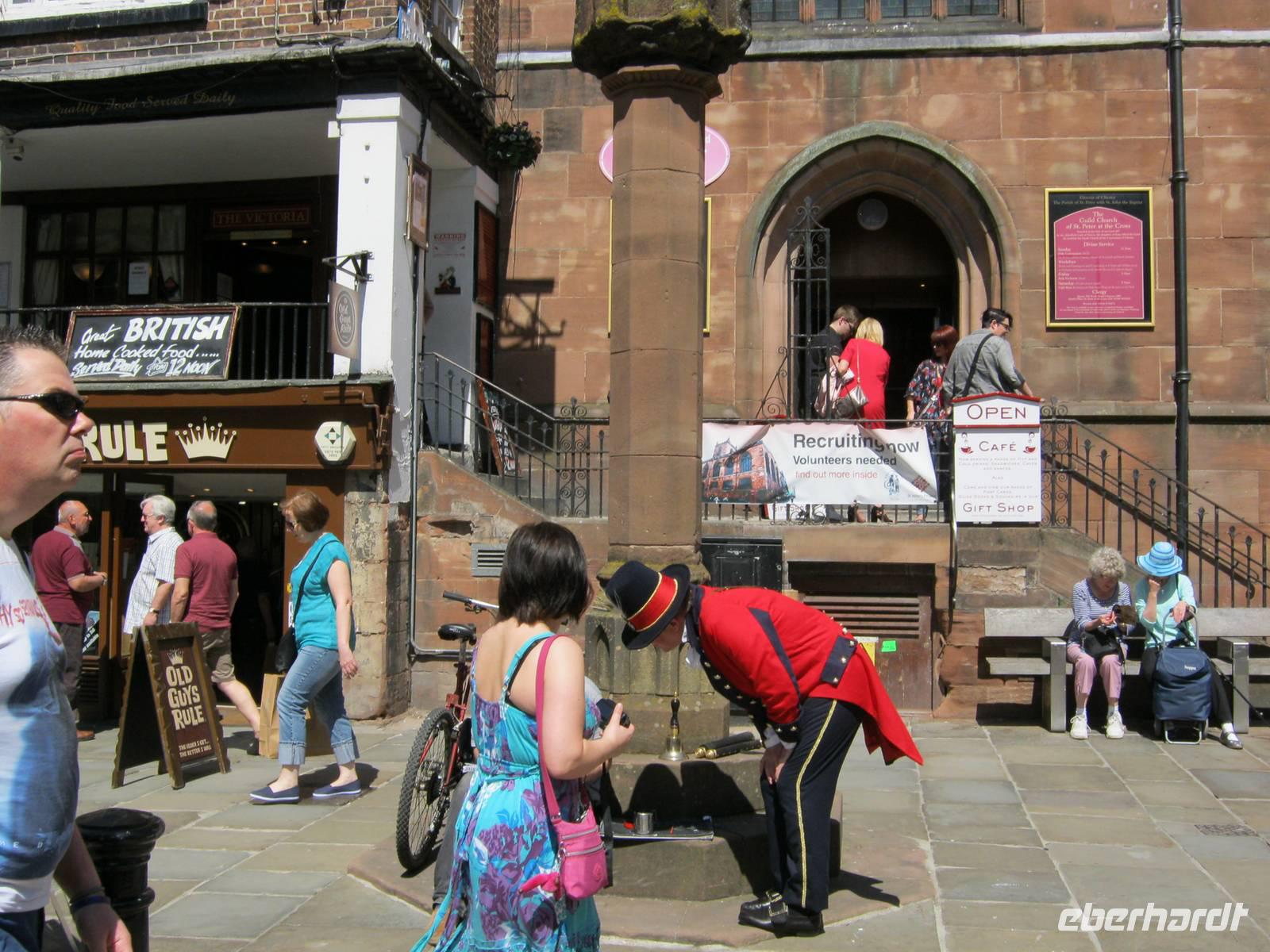 Am Morgen in Hull angekommen, Muss man sich erst einmal an den Linksverkehr und die Entfernungsangaben in Meilen gewöhnen. Eines der ersten Gebäude, die man in dieser Stadt, die früher schon bessere Tage gesehen hat, erblickt, ist HMP - das Gefängnis ihrer Majestät, der ich mit dem Singen der Hymne Reverenz erweise. Kurz danach passiert man auf dem Weg in die Midlands die elegante Humber Bridge. Durch das ehemalige industrielle Herz der Welt - wo man dem Zusammenhang zwischen Schafzucht, Textilproduktion, Dampfkraft, Eisenbahnbau sowie Kohle und Stahl sehr nahe kommt, gelangt man dann in die schmucke Stadt Chester. Leider haben wir den humorvollen Auftritt des Town-Cryers verpasst, aber dafür hatten wir die Gelegenheit ein paar persönliche Worte mit ihm zu wechseln. Er trägt übrigens dieses Jahr eine funkelnagelneue Uniform. Chesters Wurzeln reichen bis in die Römerzeit hinab und davon ist in der Stadt noch viel zu sehen, u.a. das Amphitheater. Ein Spaziergang auf der mittelalterlichen Stadtmauer schließt den Kreis und bringt uns zurück zum Parkplatz.
