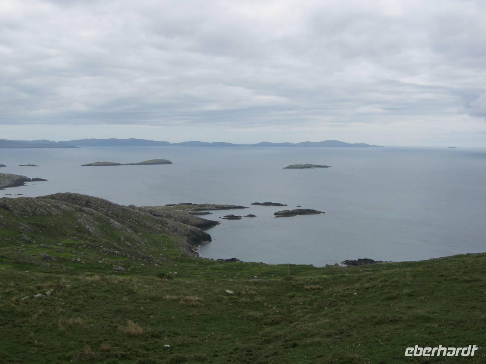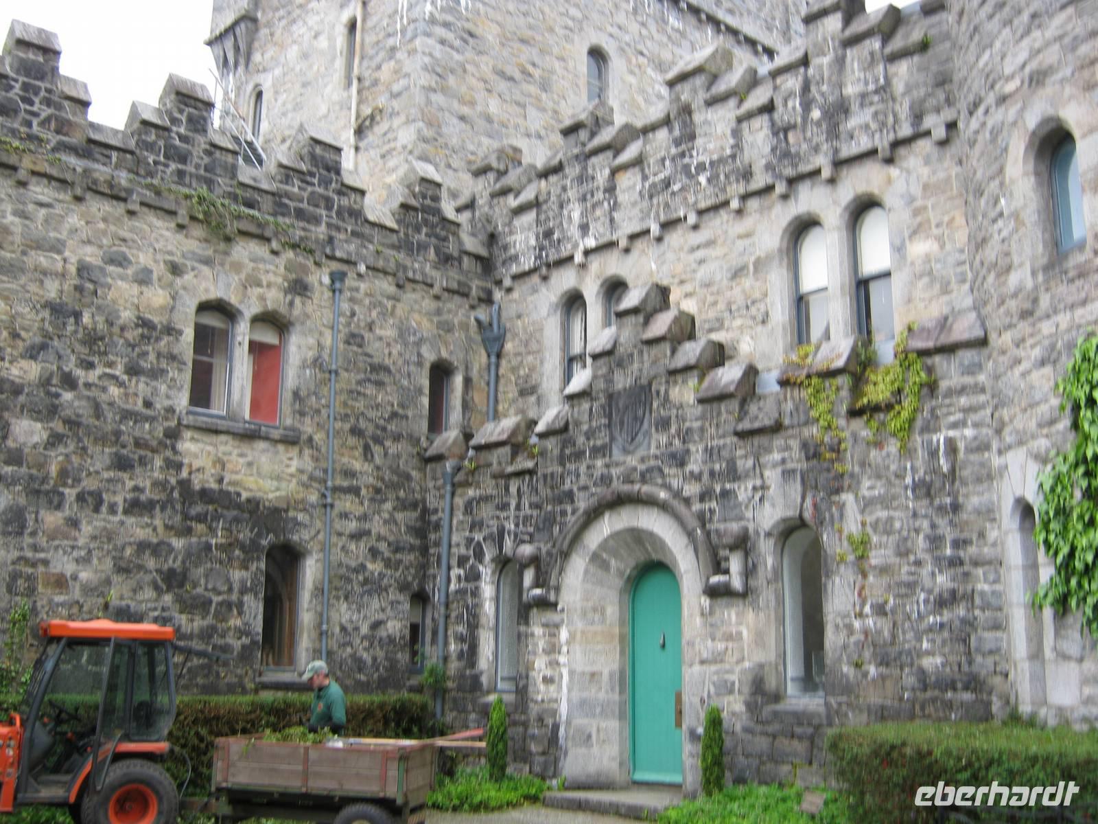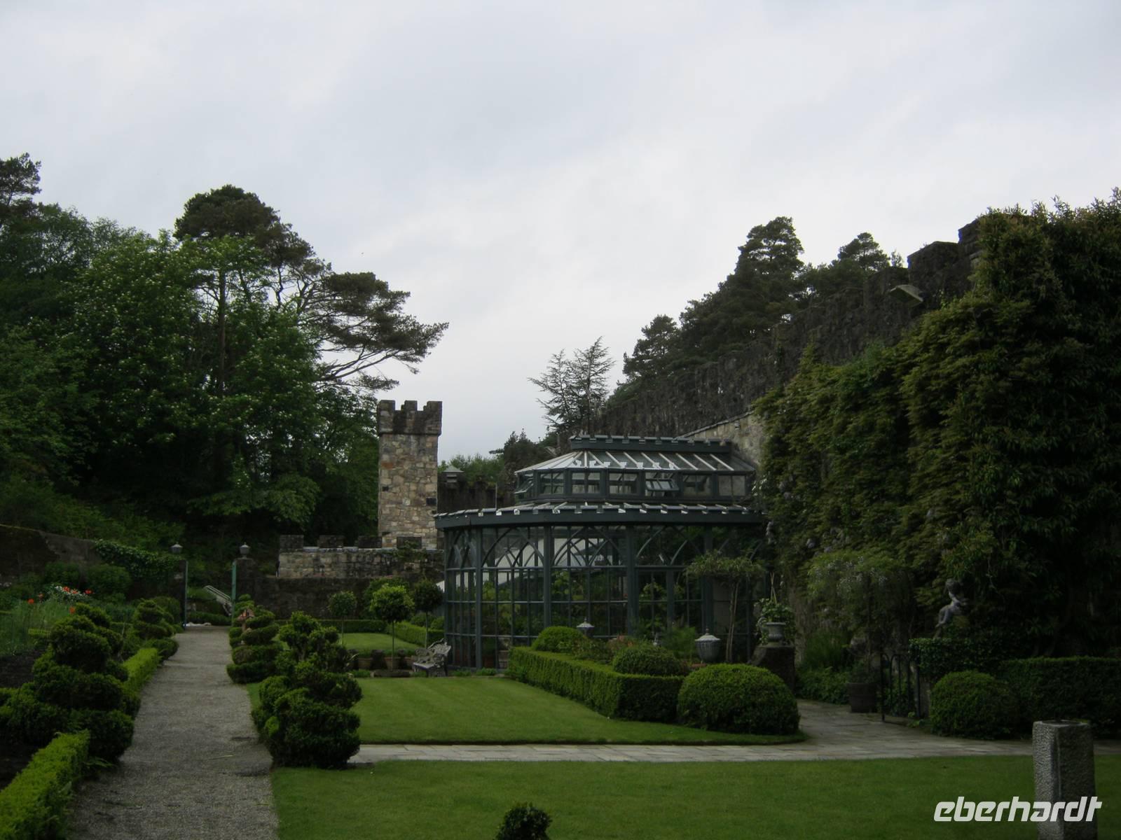 Unser erster fakultativer Ausflug führte in den Glenveagh Nationalpark. Dort hatte in der zweiten Hälfte des 19. Jahrhunderts ein reicher und grausamer Tyrann in einem windgeschützten Winkel der Bergeinöde sich sein eigenes kleines Paradies mit nachgebautem Ritterschloß und umliegendem Park geschaffen. Die Besitzung erlebte wechselvolle Schicksale und gehört heute dem Staat. Bei der Innen-Besichtigung erfährt man viel über den Lebensstil der ehemaligen Bewohner und über die Blütezeit der Gastfreundschaft als Greta Garbo und Yehudi Menuhin hier weilten. Zum selbstversorgenden Gutsbetrieb gehörten neben Stallungen und Gewächshäusern auch ein ausgedehnter Blumen-, Obst-, Gemüse- und Kräutergarten. Immerhin mussten siebzig Vasen im Haus täglich frisch bestückt werden. Die Pleasure Grounds mit ihren teilweise exotischen Gewächsen gehören heute zu einem botanischen Forschungsverbund.