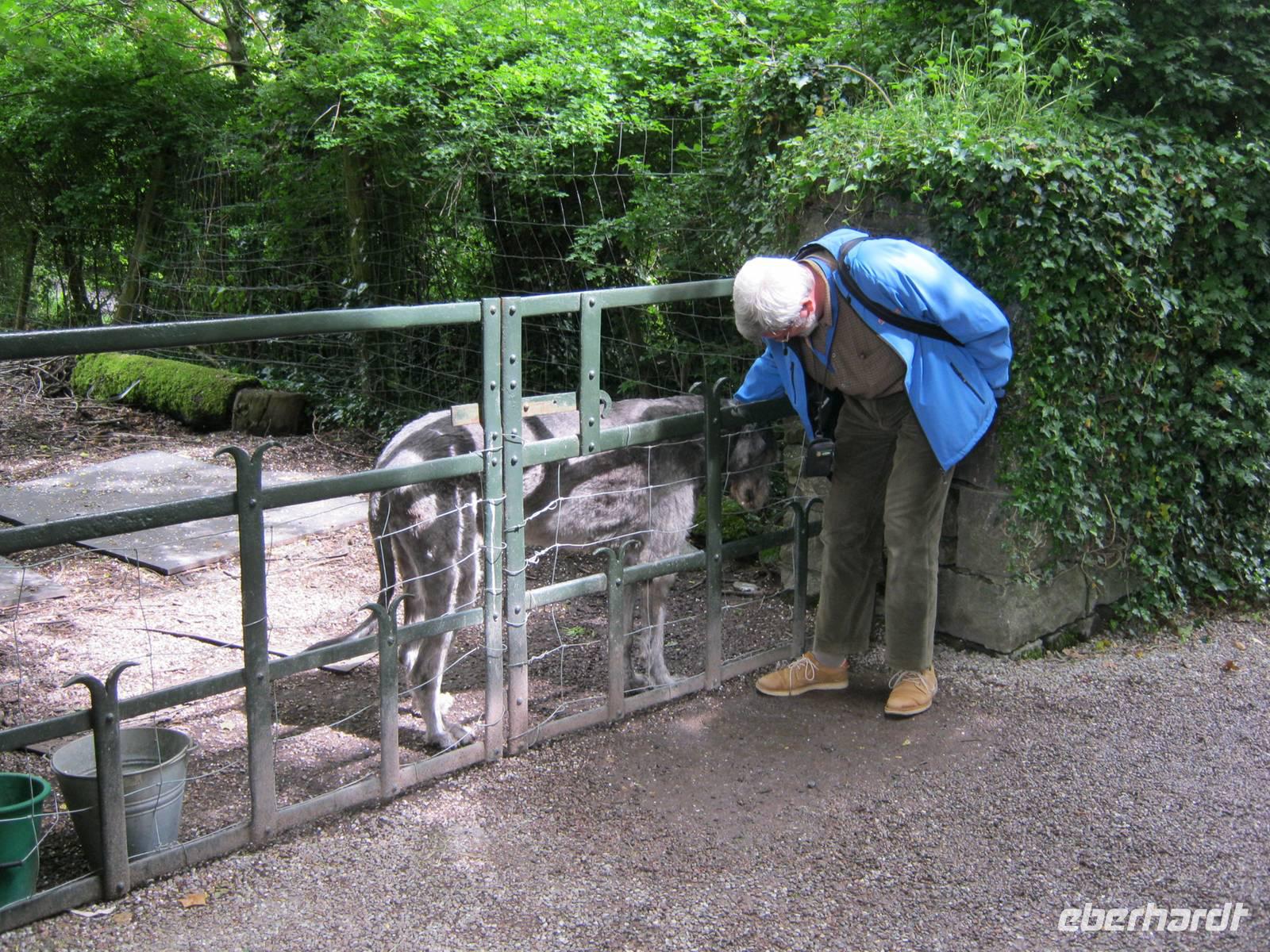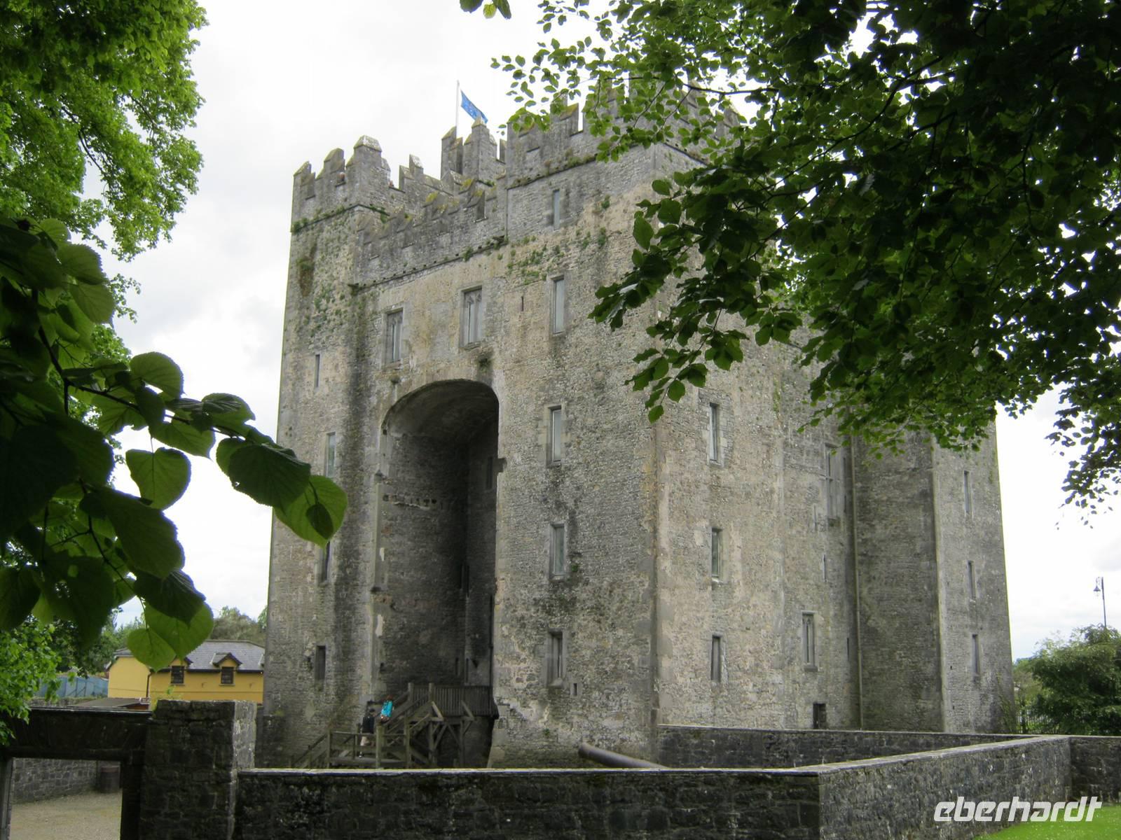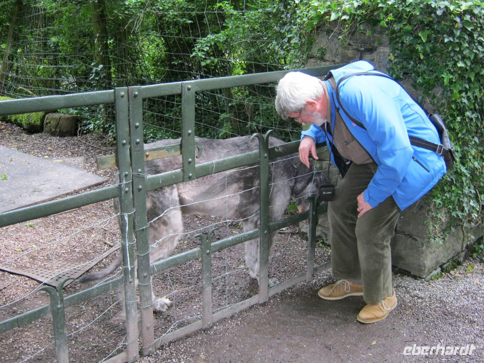 Das sächsische Burgfräulein Anja hieß uns auf Bunratty Castle im Rittersaal, der auch für abendliche Bankette als stimmungsvolle Kulisse dient, willkommen und erklärte uns den bedeutenden Adelssitz aus dem 15. Jahrhundert, inzwischen restauriert durch die Großzügigkeit eines englischen Lords und seiner Lady, deren Konterfeis man in dem schönsten der Gemächer finden kann. In so einem Wohnturm führen Wendeltreppen in den Ecktürmen ganz nach oben auf den Wehrgang von wo man einen grandiosen Ausblick in alle Richtungen und auch den breiten Shannon hat. Am anderen Ende des riesigen Parks steht das neue Herrenhaus, errichtet vor rund zweihundert Jahren, als es in der alten Burg doch zu unbequem geworden war. Dazwischen dehnt sich ein grandioses Freilichtmuseum aus mit Gebäuden aus allen Teilen des Landes, darunter ein komplettes Dorf mit Schule, Landarztpraxis, Post, Läden und - natürlich - einem Pub, wo so mancher von uns einen echten Irish Coffee genossen hat. Die ausgedehnte Anlage beherbergt viele Tierarten: neben Hühnern und Enten auch Hirsche, Ponys, Esel, Schweine und zwei Exemplare der größten Hunderasse der Welt - dem irischen Wolfshund. Von mir, einem alten Bekannten, ließ sich der eine sogar streicheln.