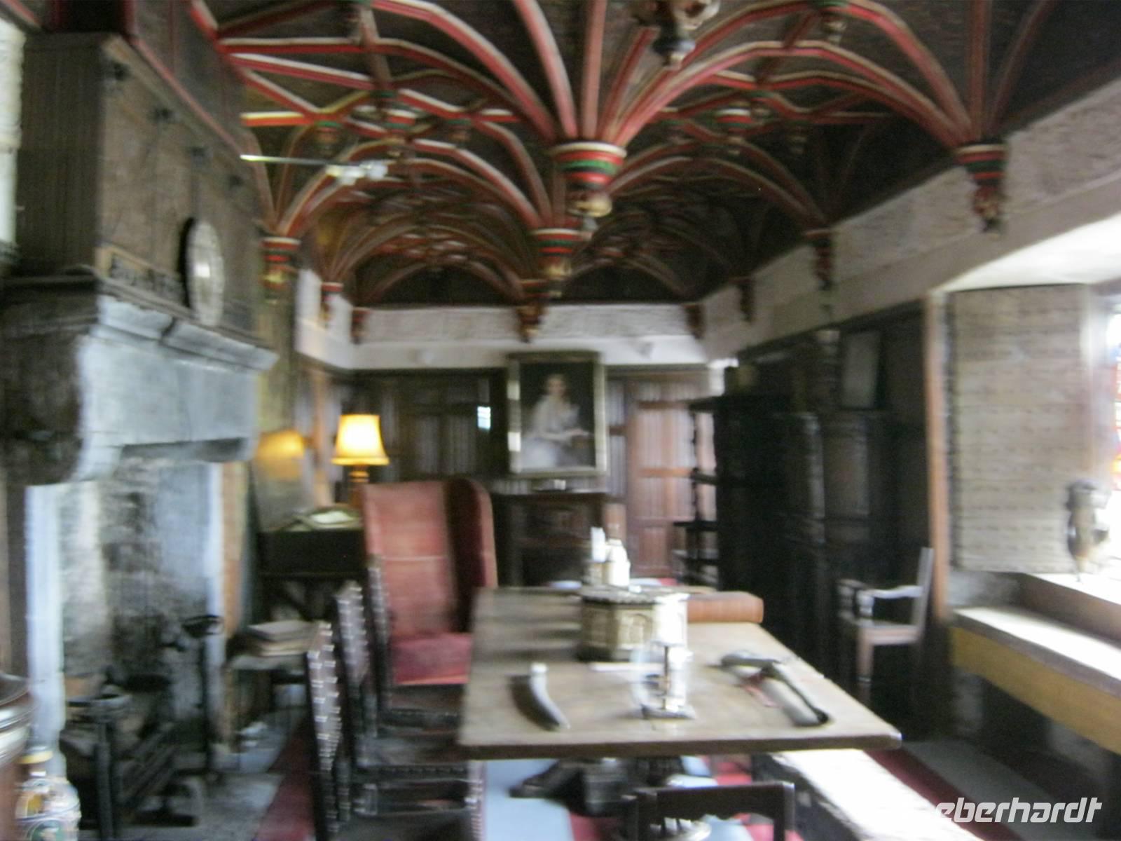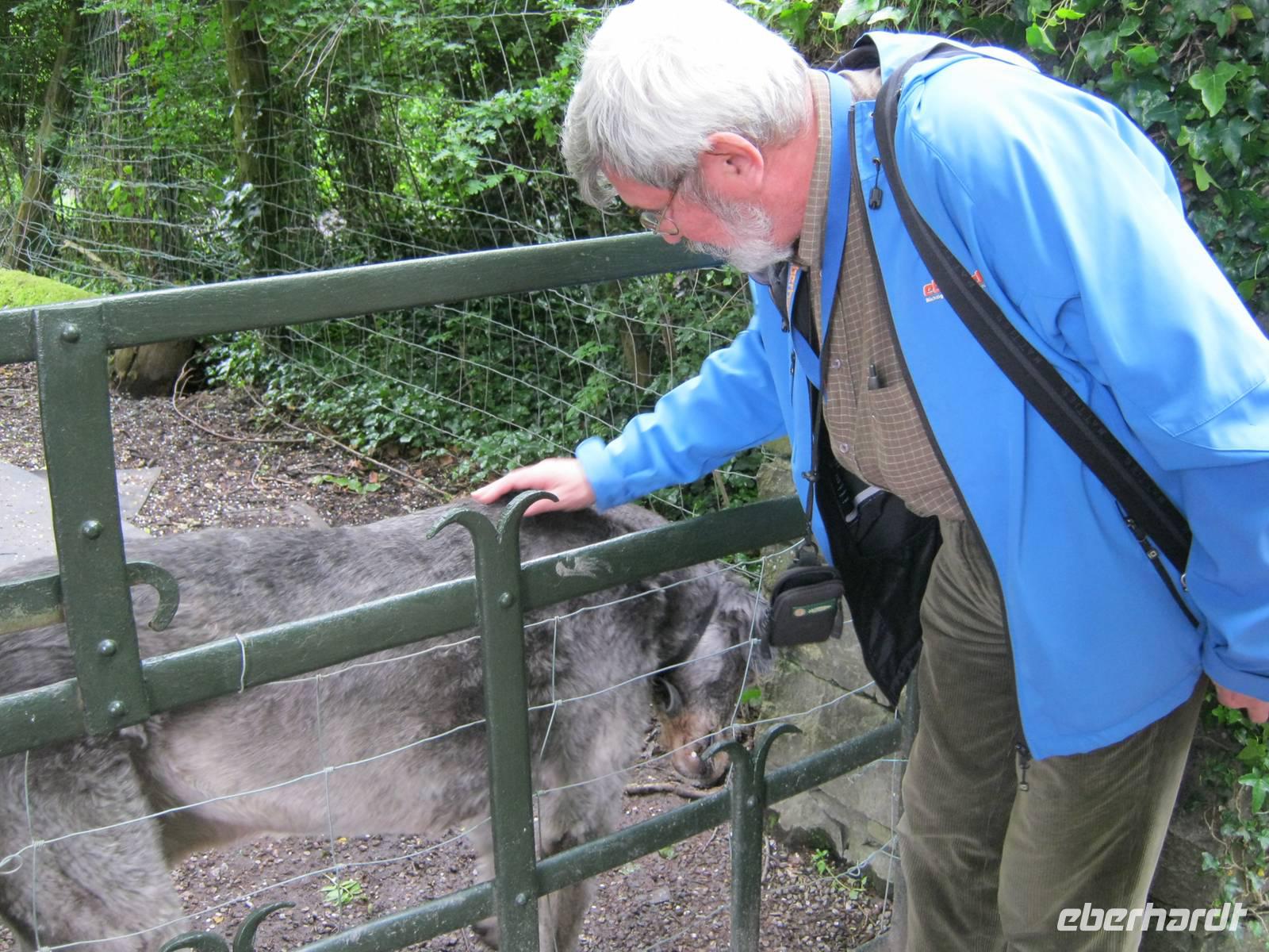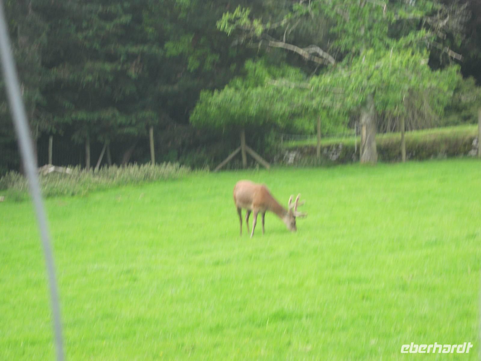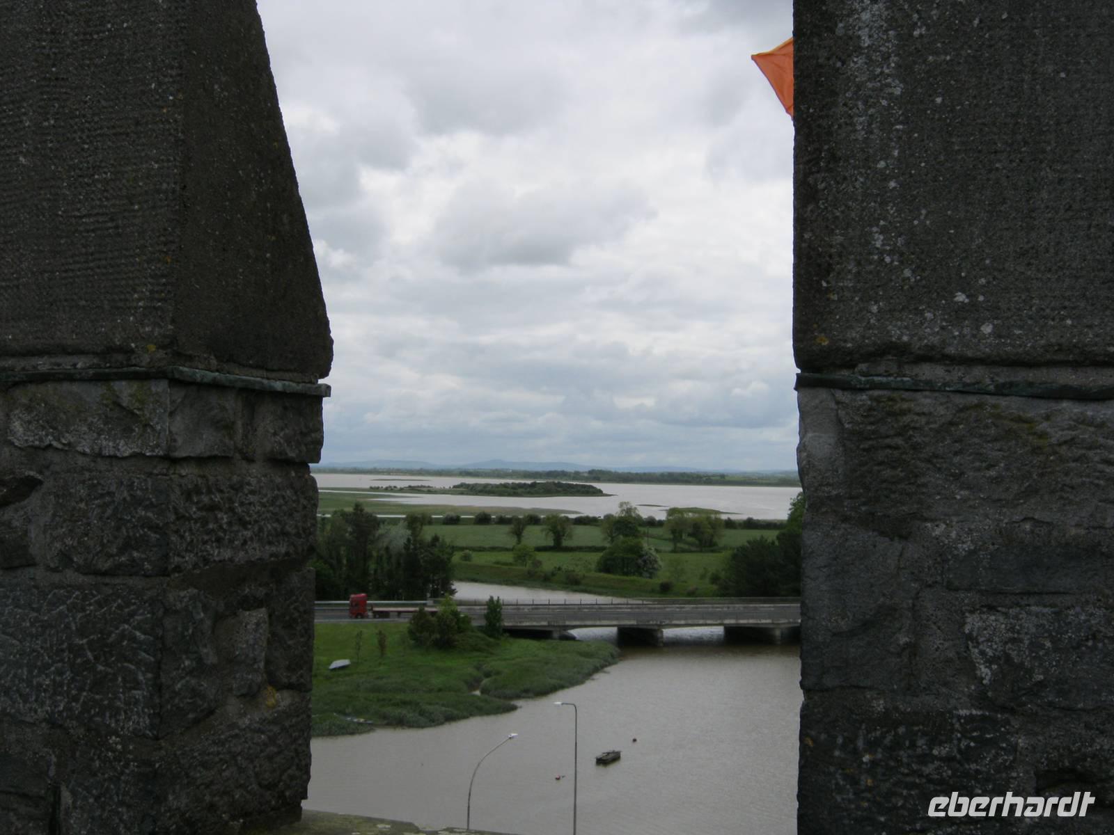 Das sächsische Burgfräulein Anja hieß uns auf Bunratty Castle im Rittersaal, der auch für abendliche Bankette als stimmungsvolle Kulisse dient, willkommen und erklärte uns den bedeutenden Adelssitz aus dem 15. Jahrhundert, inzwischen restauriert durch die Großzügigkeit eines englischen Lords und seiner Lady, deren Konterfeis man in dem schönsten der Gemächer finden kann. In so einem Wohnturm führen Wendeltreppen in den Ecktürmen ganz nach oben auf den Wehrgang von wo man einen grandiosen Ausblick in alle Richtungen und auch den breiten Shannon hat. Am anderen Ende des riesigen Parks steht das neue Herrenhaus, errichtet vor rund zweihundert Jahren, als es in der alten Burg doch zu unbequem geworden war. Dazwischen dehnt sich ein grandioses Freilichtmuseum aus mit Gebäuden aus allen Teilen des Landes, darunter ein komplettes Dorf mit Schule, Landarztpraxis, Post, Läden und - natürlich - einem Pub, wo so mancher von uns einen echten Irish Coffee genossen hat. Die ausgedehnte Anlage beherbergt viele Tierarten: neben Hühnern und Enten auch Hirsche, Ponys, Esel, Schweine und zwei Exemplare der größten Hunderasse der Welt - dem irischen Wolfshund. Von mir, einem alten Bekannten, ließ sich der eine sogar streicheln.