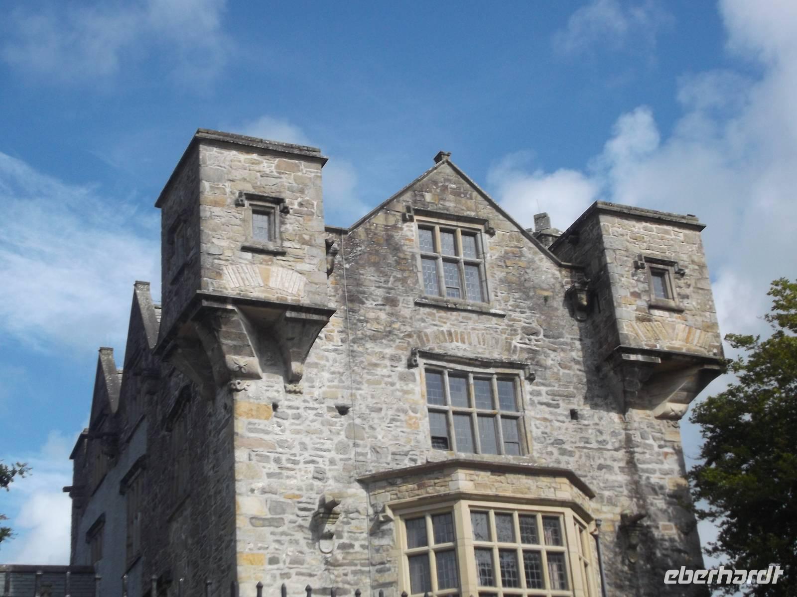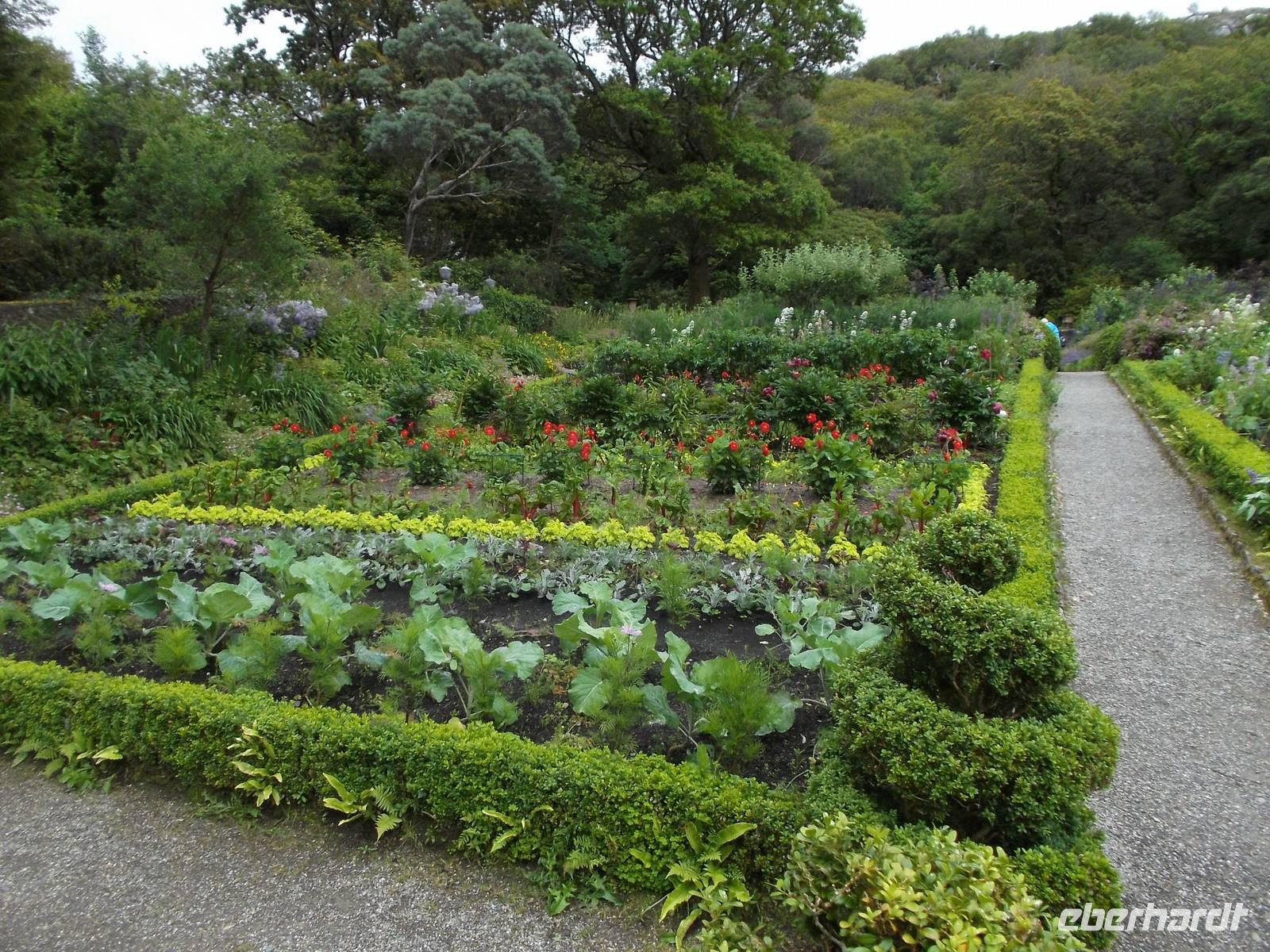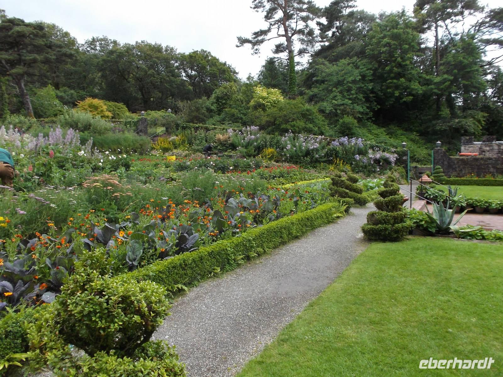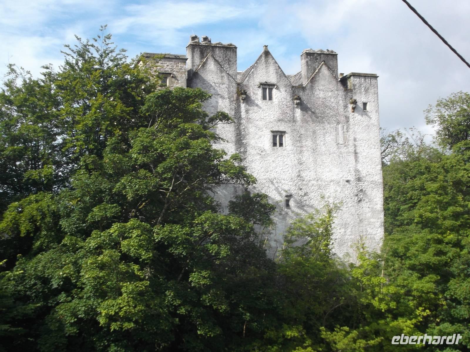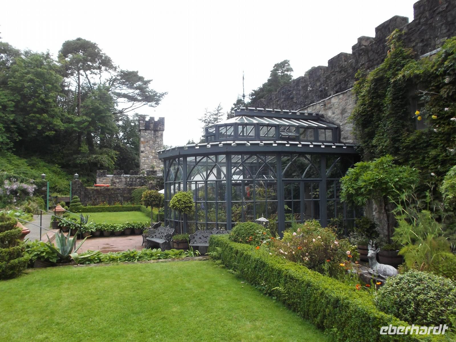 Heute stand der fakultative Ausflug in den Glenveagh Nationalpark auf dem Programm. Wir fuhren nach dem Frühstück vom zum Vereinigten Königreich gehörenden Nordirland in die Republik Irland, vorbei an Letterkenny und dem Seengebiet um Gartan. Von hier soll der in Irland und Schottland sehr verehrte Heilige Kolumban stammten, der in Irland Mönch und Missionar wurde und dem später die Christianisierung Schottlands zu verdanken war. Angekommen im Glenveagh Nationalpark lernten wir mit diesem eines der idyllischsten Täler im Norden Irlands kennen. Ein Landspekulant hatte Mitte des 19. Jahrhunderts alles hier aufgekauft und zu einem Jagdrevier gemacht. Glenveagh heißt „Tal des Lebens" - im Gegensatz zum benachbarten Tal, das von giftigen Wolfsmilchgewächsen bestanden wird. Beim Entstehen des Reviers ließ der neue Besitzer John George Adair 244 Pächter aus dem Gebiet vertreiben und ihrer Existenz berauben und ein burgähnliches Herrenhaus am malerischen See errichten Das 1873 fertiggestellte Glenveag Castle wechselte später mehrmals die Besitzer, bis der letzte von ihnen das Gelände dem irischen Staat vermachte. So entstand daraus ein Nationalpark, dessen Schloss mit der originalen Einrichtung heute noch besichtigt werden kann. Natürlich machten wir von dieser Möglichkeit Gebrauch, den größten der sechs irischen Nationalparks mit der imponierenden Größe von 16.550 Hektar kennenzulernen. Er liegt neben den beiden höchsten Bergen der Grafschaft Donegal und wir bekamen zunächst einen Film über Geschichte und Natur des Nationalparks zu sehen. Anschließend fuhren wir mit kleinen Shuttlebussen zum Schloss und hatten Muße, die Innenräume aber auch die schon um das Schlösschen angelegten Blumengärten zu besuchen. Wer wollte, konnte dann durch den Park wandern und zu Fuß zum Bus zurückzukehren oder die Shuttlebusse nutzen.