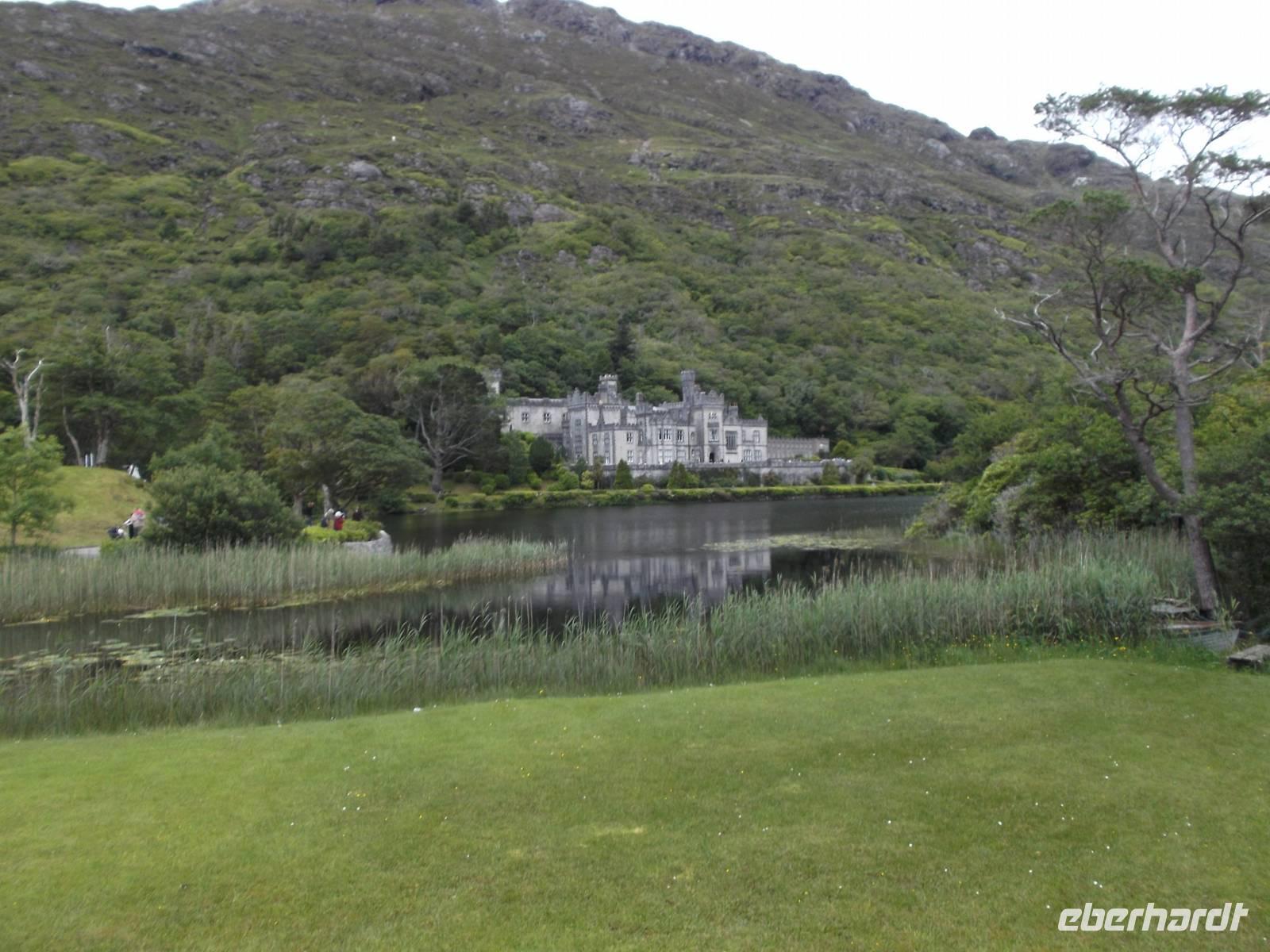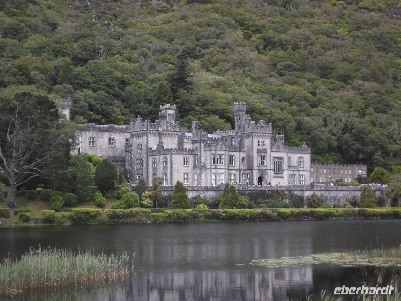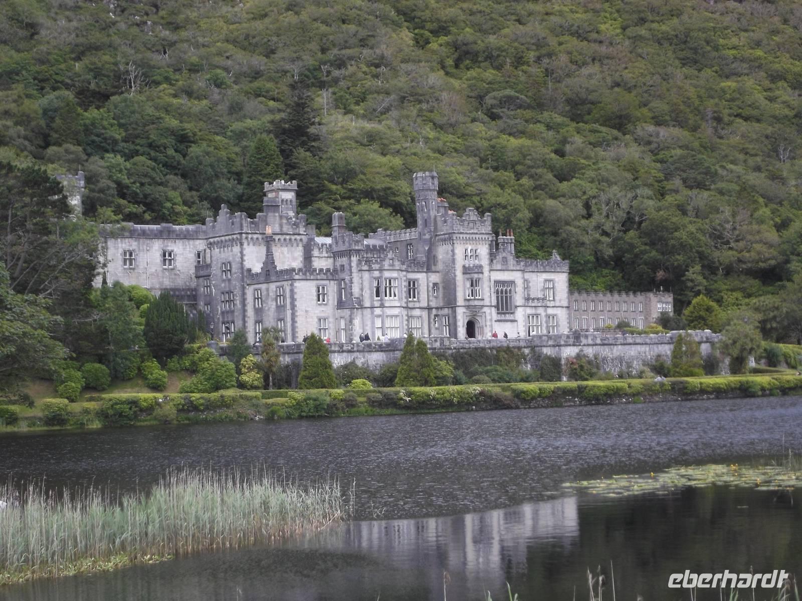 Danach setzten wir unsere Rundfahrt um die „Twelve Bens" fort, wie das nördliche Gebirge Connemaras heißt, dessen höchste Erhebung, der Benbaum, 730 m über dem Meeresspiegel liegt. Eine Pause legten wir in der malerische am See gelegenen Abtei von Kylemore ein. Deren Geschichte reicht zurück auf die älteste irischen Benediktinerinnenabtei, 1665 gegründet und nach vielfachen Umzügen hierher gelangt. Seit 1920 haben die Nonnen ihr Domizil in dem 1871 fertiggestellten Schloss Kylemore gefunden. Das war um 1870 von einer Industriellenfamilie erbaut worden und nach mehrfachem Besitzerwechsel zusammen mit dem riesigen Park vom Benediktinerorden erworben worden.
