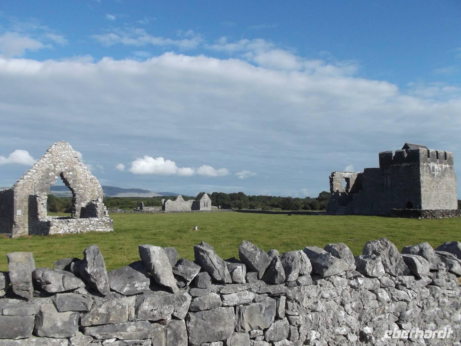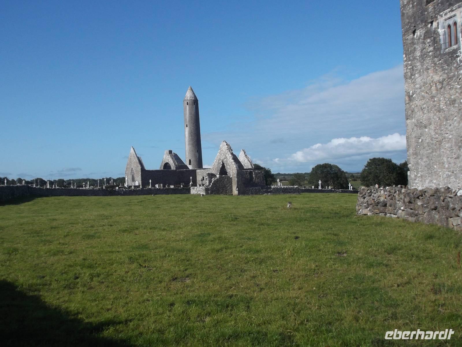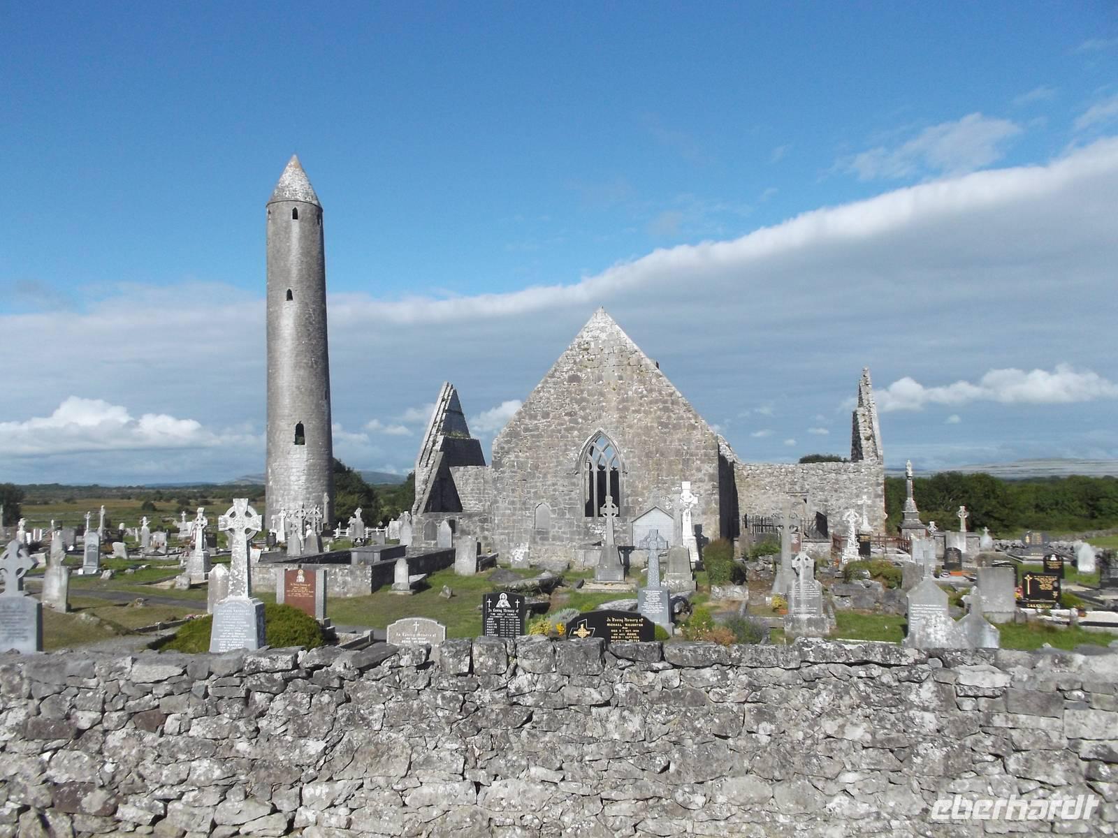Unser bequemer 5-Sterne-Bus und Chauffeur Jörg Hoffmann waren heute wieder bei uns und brachten uns zunächst zur nahe an Gort gelegenen alten Klostersiedlung Kilmacduagh. Paradestück ist der leicht schiefe, hervorragend bewahrte 30 m hohe Rundturm inmitten der Kirchenruinen. Von denen gibt es mehrere, was die einstige Bedeutung der Klostersiedlung unterstreicht, die zeitweise sogar Bischofssitz war. Die Reste gehen bis aufs 11. Jh. zurück, der Rundturm stammt aus dem 12. Jh. insgesamt ist Kilmacduagh Monastery eines der malerischsten Ruinenensembles in Irland.