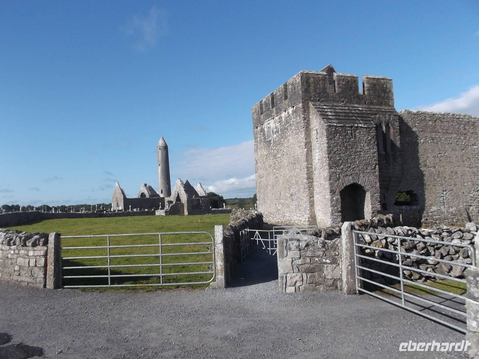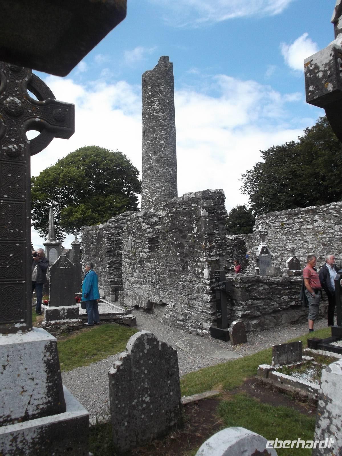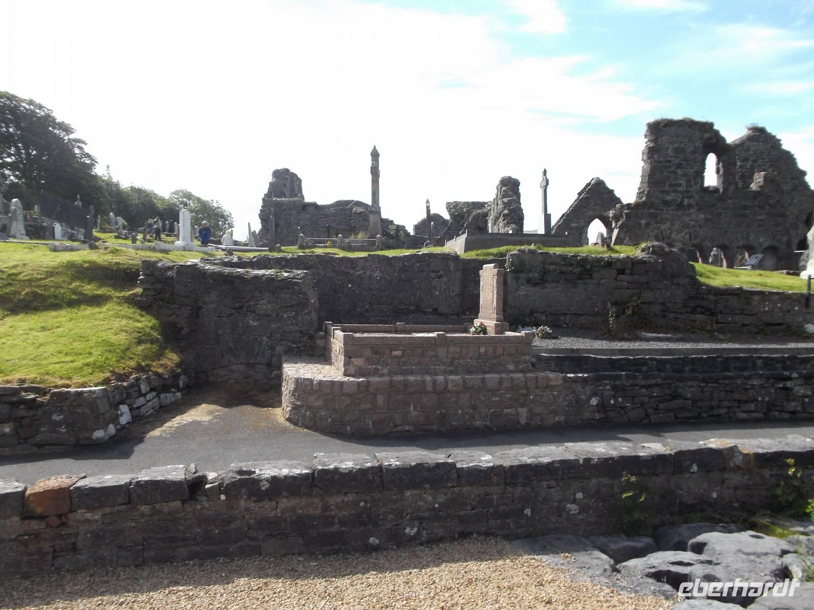 Unser bequemer 5-Sterne-Bus und Chauffeur Jörg Hoffmann waren heute wieder bei uns und brachten uns zunächst zur nahe an Gort gelegenen alten Klostersiedlung Kilmacduagh. Paradestück ist der leicht schiefe, hervorragend bewahrte 30 m hohe Rundturm inmitten der Kirchenruinen. Von denen gibt es mehrere, was die einstige Bedeutung der Klostersiedlung unterstreicht, die zeitweise sogar Bischofssitz war. Die Reste gehen bis aufs 11. Jh. zurück, der Rundturm stammt aus dem 12. Jh. insgesamt ist Kilmacduagh Monastery eines der malerischsten Ruinenensembles in Irland.