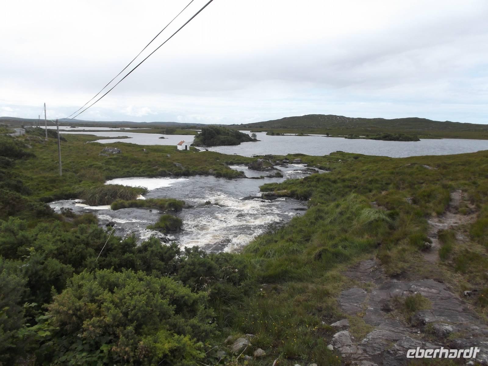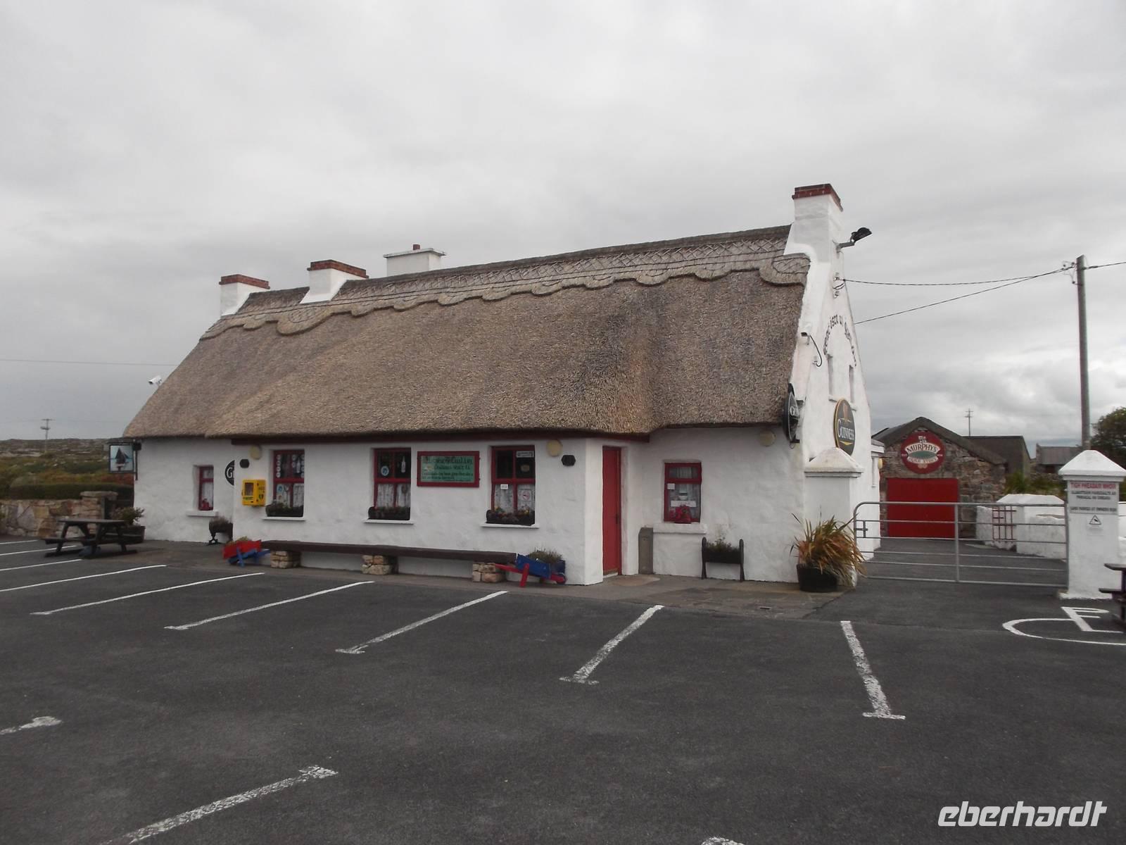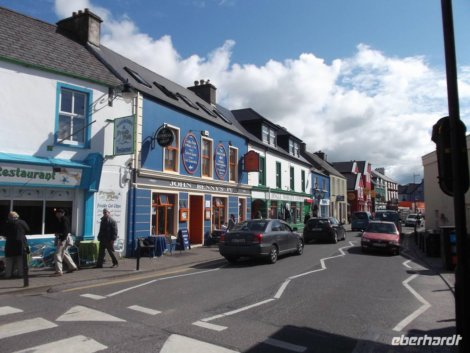 Den heutigen Ausflug, eine Rundfahrt auf der Halbinsel Connemara, machten wir mit einem irischen Bus, denn heute war die übliche Lenk- und Rhepause für unseren Buschauffeur Jörg Hoffmann. Fahrer P.G. brachte uns zunächst an Galway vorbei zur Küstenstraße an der nördlichen Galway Bay. Der erste Stopp in Spideal brachte nicht nur eine Toilettenpause sondern auch einen interessanten großen Souvenirladen. Danach gingt es zum Fotostopp an einem typischen „thatched house", einem reetgedeckten, weißgetünchten Cottage, in unserem Fall ein sehr malerischer Pub. Das Herz von Connemara, eine der „grünsten" Regionen im irischen Westen, wird geprägt von Moor- und Heideflächen und den Bergen im Norden. Eine merkwürdige, von Felsen und Teichen durchsetzte Landschaft begleitete uns, während die Küstenstraße ins Landesinnere abbog. Fotostopps erlaubten uns, Aufnahmen von der typischen Connemara-Landschaft aus Torfmooren, Sumpf- und Felslandschaften, malerischen Stromschnellen und baumbestandenen Felseninselchen zu machen, bevor wir gegen Mittag das Hafenstädtchen Clifden erreichten. Das Städtchen mit vielleicht 2700 Einwohnern ist die inoffizielle „Hauptstadt" der Region Connemara und ein sehr beliebter Touristenort. Seine Hauptstraße mit den buntbemalten Häusern wird von Geschäften, Pubs und zahlreichen Restaurants geprägt - gerade richtig für unsere Mittagspause.