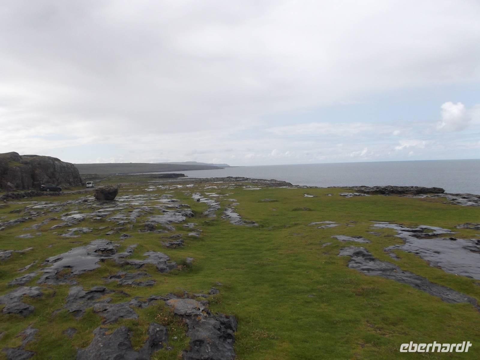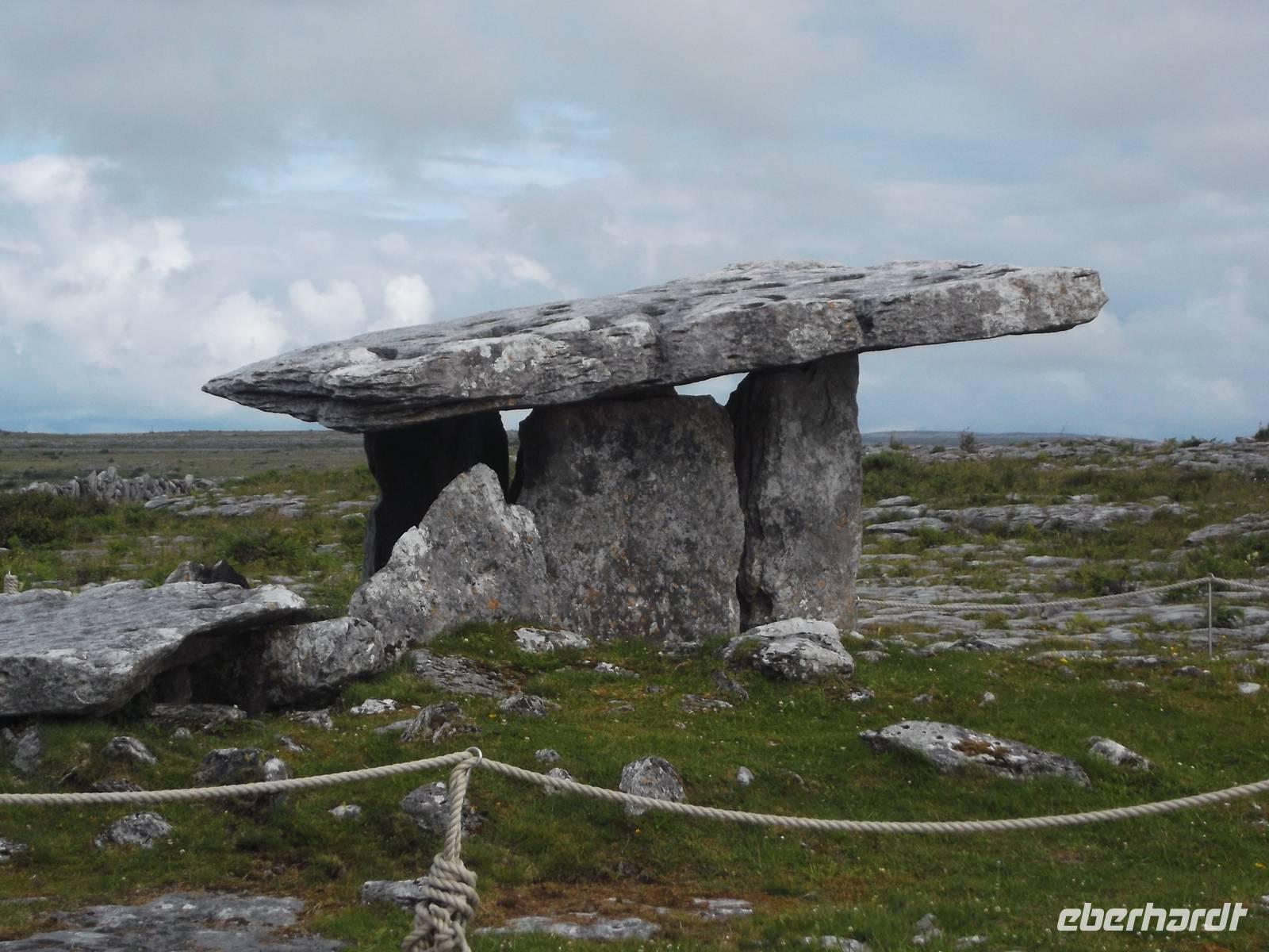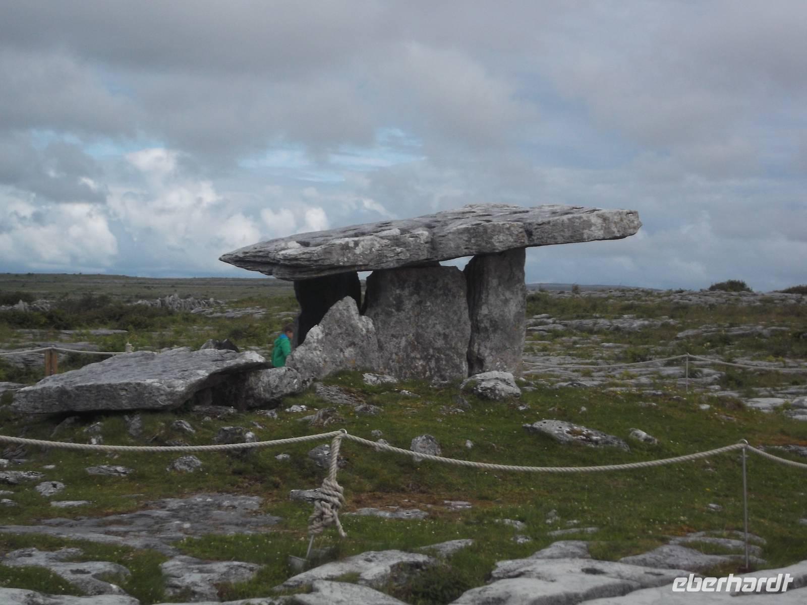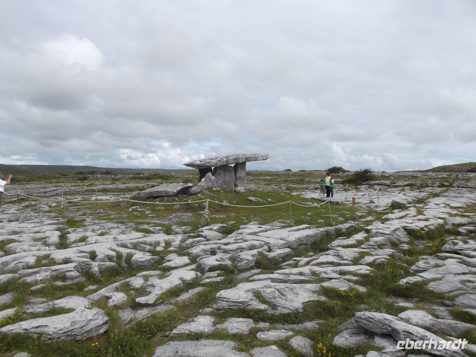 Nach einem ausgedehnten Stopp hier begaben wir uns in die einzigartige Landschaft des Burren. Die seltsam anmutende Karstlandschaft ist aus der Eiszeit und mehreren Jahrtausenden von Erosion hervorgegangen. Sie ist über 250 km² groß und durch allmähliche Auflösung des unterschiedlich dichten Kalksteins, der den Untergrund bildet, entstanden. Durch diese Erosion trennten sich vertikal einzelne Steinbrücken durch Gräben voneinander und auch horizontal die Platten durch Klüftung. „Clints" nennt man hier die teilweise losen Kalkplatten auf der Oberfläche, die etwa knietiefen Gräben heißen „Grykes" und die durch Oberflächenwasser gebildeten Tümpel und flachen Seen werden als „Turloughs" bezeichnet. Zahlreiche prähistorische Denkmäler finden sich in dieser Steinwüste, bei deren Bau oft die beschriebenen Kalksteinplatten verwendet wurden. Weithin bekannt ist z.B. der Pulnabrone Dolmen, ein mehr als 5000 Jahre altes Steinzeitgrab aus Kalksteinplatten, das früher vermutlich von einem Hügel bedeckt war.