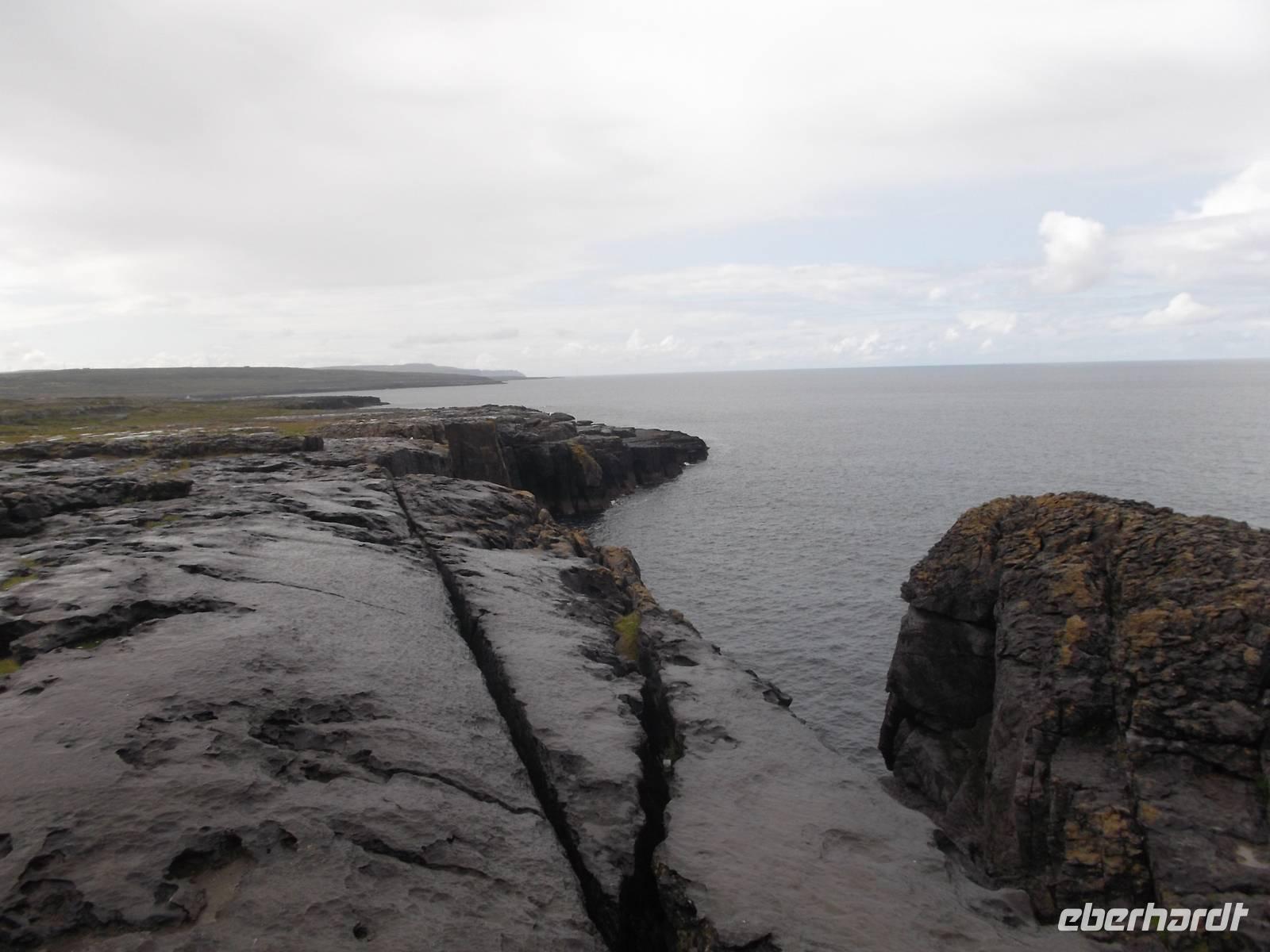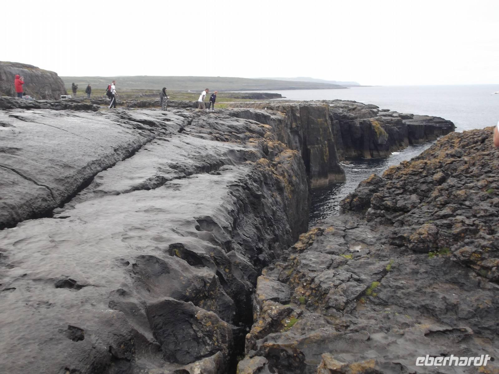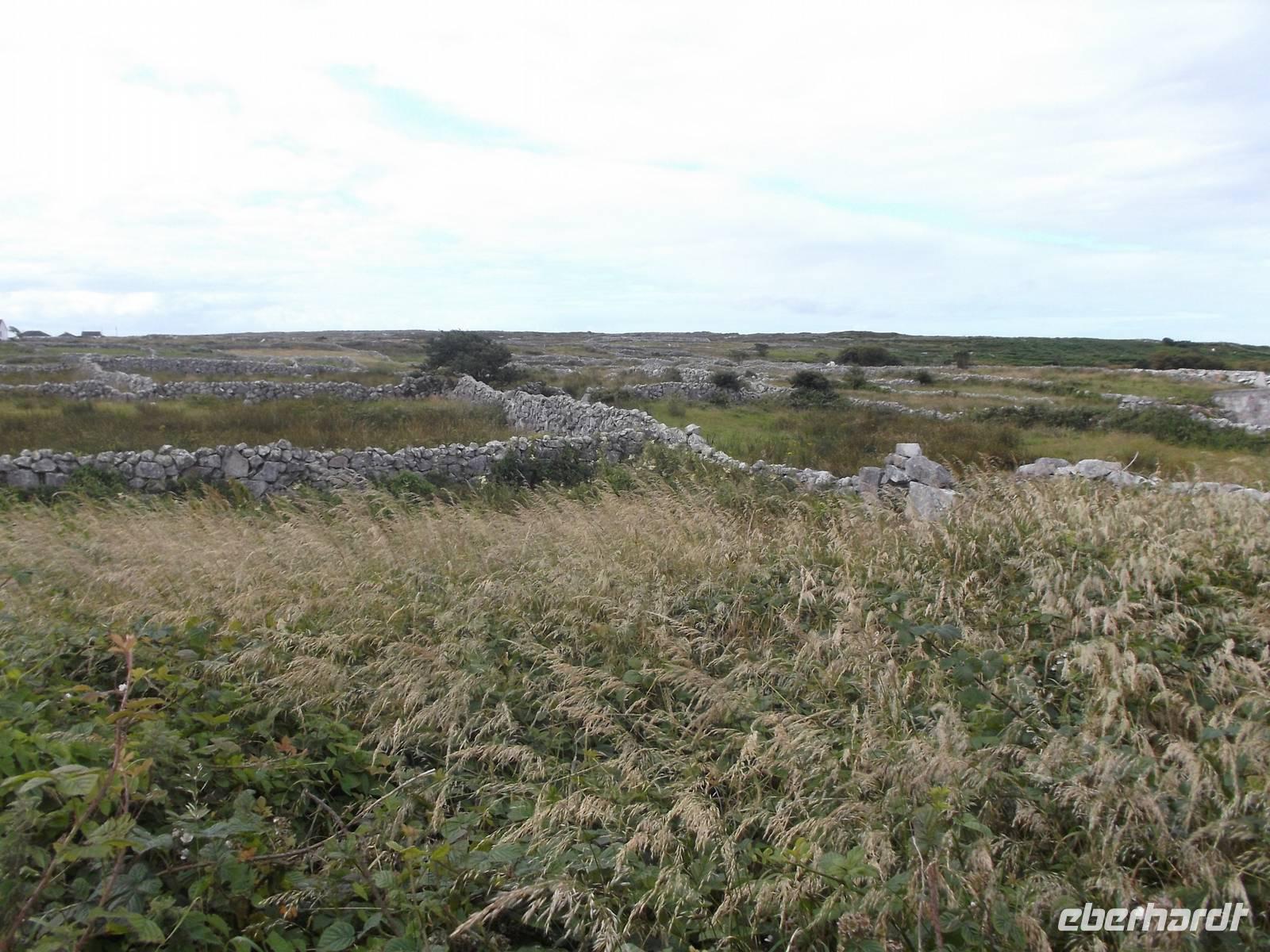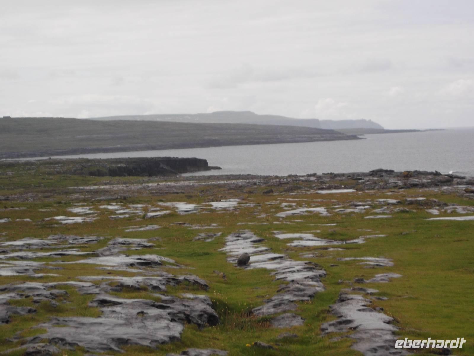 Nach einem ausgedehnten Stopp hier begaben wir uns in die einzigartige Landschaft des Burren. Die seltsam anmutende Karstlandschaft ist aus der Eiszeit und mehreren Jahrtausenden von Erosion hervorgegangen. Sie ist über 250 km² groß und durch allmähliche Auflösung des unterschiedlich dichten Kalksteins, der den Untergrund bildet, entstanden. Durch diese Erosion trennten sich vertikal einzelne Steinbrücken durch Gräben voneinander und auch horizontal die Platten durch Klüftung. „Clints" nennt man hier die teilweise losen Kalkplatten auf der Oberfläche, die etwa knietiefen Gräben heißen „Grykes" und die durch Oberflächenwasser gebildeten Tümpel und flachen Seen werden als „Turloughs" bezeichnet. Zahlreiche prähistorische Denkmäler finden sich in dieser Steinwüste, bei deren Bau oft die beschriebenen Kalksteinplatten verwendet wurden. Weithin bekannt ist z.B. der Pulnabrone Dolmen, ein mehr als 5000 Jahre altes Steinzeitgrab aus Kalksteinplatten, das früher vermutlich von einem Hügel bedeckt war.