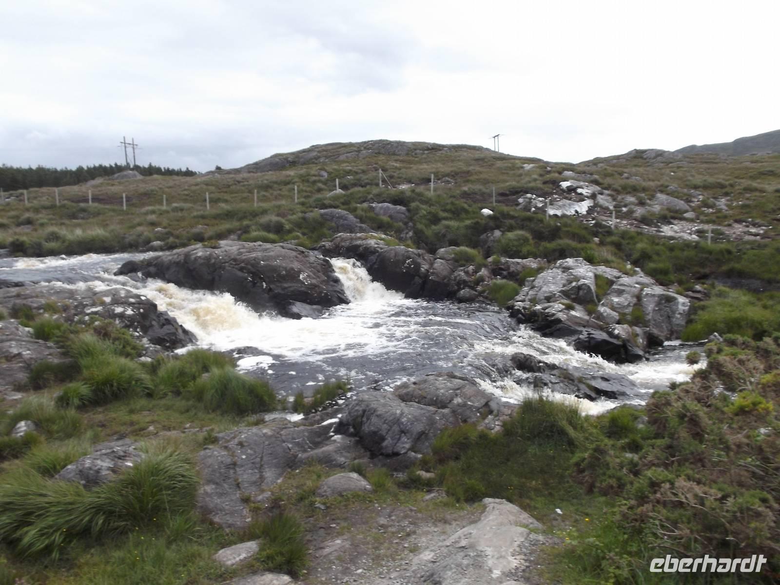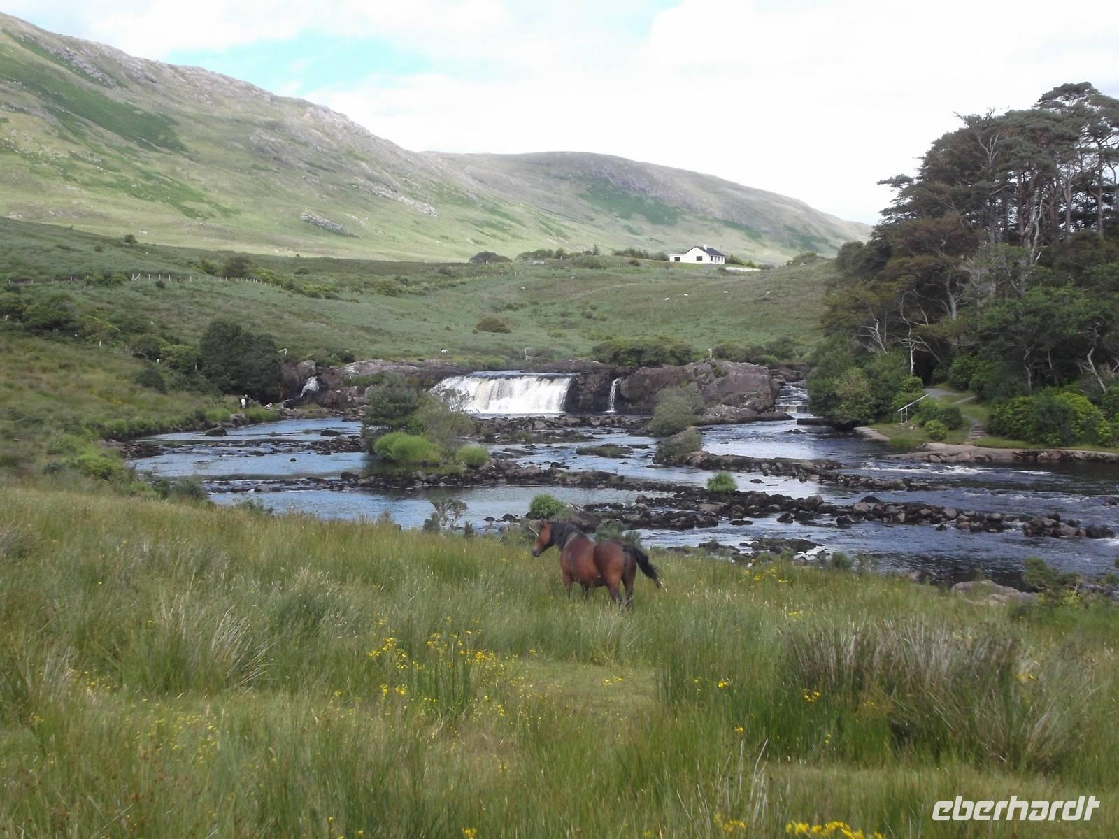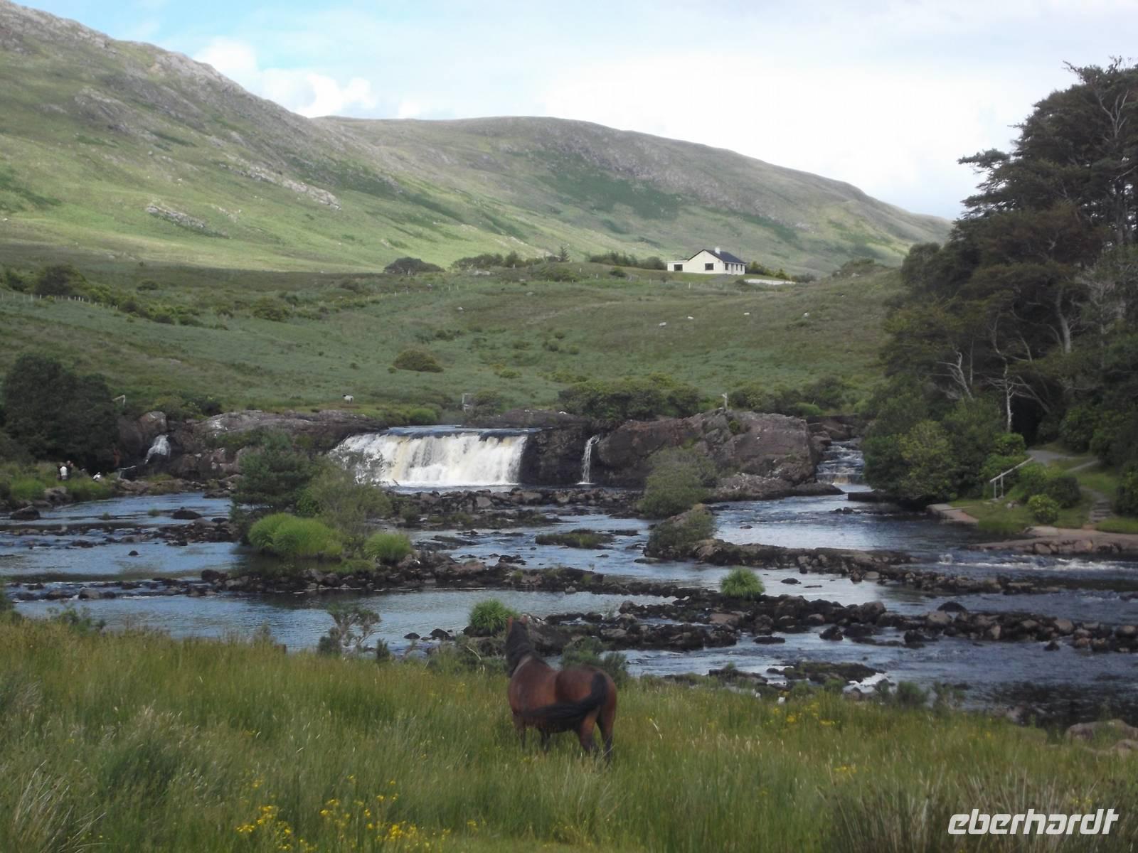 Weiter ging es dann, bis wir Irlands einzigen echten Fjord, Killary Harbour, erreichten. An ihm und seinen überall gut sichtbaren Muschelzuchten entlang zeigte uns hinter dem Örtchen Leenane der nächste Fotostopp die malerischen Aasleagh Falls. Gespeist vom kleinen, für seine Lachse bekannten Fluß Erriff, der hier einige Meter über die Felsen springt, ist der Wasserfall ein beliebtes Fotomotiv. Zudem taucht er in irischen Legenden auf und diente als eine der schönsten Filmkulissen in dem 1990 mit Richard Harris gedrehten Film „The Field" Von hier ging es um das zweite bedeutende Gebirge von Connemara, die Maumturk Mountains herum, zum letzten heutigen Stopp. Maam Cross, die wichtigste Kreuzung der großen Straßen in Connemara, liegt ziemlich genau im Zentrum der Halbinsel. Zum Abendessen kehrten wir zurück nach Gort ins „Lady Gregory Hotel".