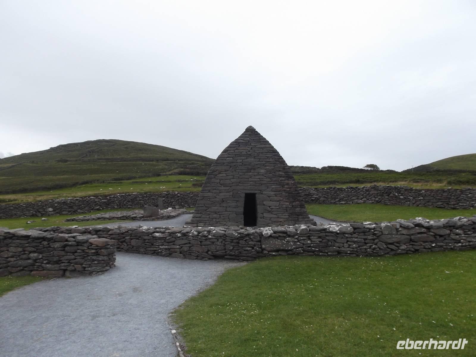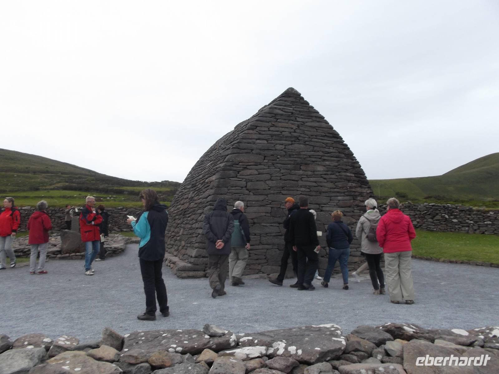 Von hier aus befanden wir uns schon auf dem Rückweg nach Tralee, fuhren aber noch am „Gallarus Oratory" vorbei. Das Bauwerk gilt als eine der ältesten erhaltenen Kirchen Europas, mit einer Form, die an ein umgedrehtes Schiff erinnert. Das Kirchlein bot wohl nur wenigen Gläubigen Platz, hat nur einen Eingang und ein winziges Fensterchen - sonst gibt es in dem mit glatten Wänden aus perfekt geschichtetem Trockenmauerwerk errichteten Raum keine Öffnungen für Luft oder Licht.