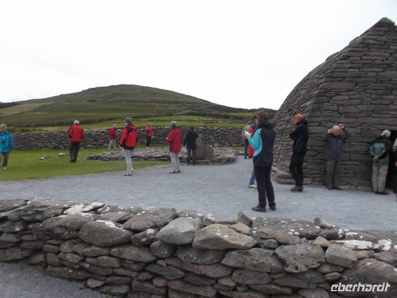 Unser heutiges Ausflugziel war die Halbinsel Dingle. Gleich hinter Tralee lag das einstige kleine Industriegebiet von Blennerville. In seinem Zentrum stand - als Kraftwerk sozusagen - die Windmühle von Blennerville, ein bekanntes Fotomotiv. Unsere Weiterfahrt brachte noch einen Fotostopp am Aussichtspunkt auf die Bucht von Tralee, bevor wir weiterfuhren zum Städtchen Dingle, den Hauport der Halbinsel. Als „westlichste Stadt Europas" wird das etwa 1800 Einwohner zählende Städtchen meist apostrophiert, das mit seinen buntbemalten Häuschen, seinen hübschen Ladenschildern und einer malerischen Hafenszenerie sehr reizvoll ist. Wir hatten hier natürlich Zeit für einen Bummel, bevor wir uns auf den Weg zu einer der hübschesten Aussichtsstraßen Irlands machten. Der „Slea Head Drive" umrundet die Westspitze der Dingle-Halbinsel, führt entlang der Küste und zeichnet sich durch enge Kurven und wundervolle Meerblicke aus. Neben zahlreichen Fotomotiven gibt es viele frühgeschichtliche Denkmäler - so die „beehive-huts", die sich unweit der Küstenstraße befinden. „Bienenkorbhütten" werden sie wegen ihrer Form genannt - aus Trockenmauerwerk errichtet waren solche Unterkünfte im 6 und 7. Jahrhundert die Behausungen von Einsiedler-Mönchen.