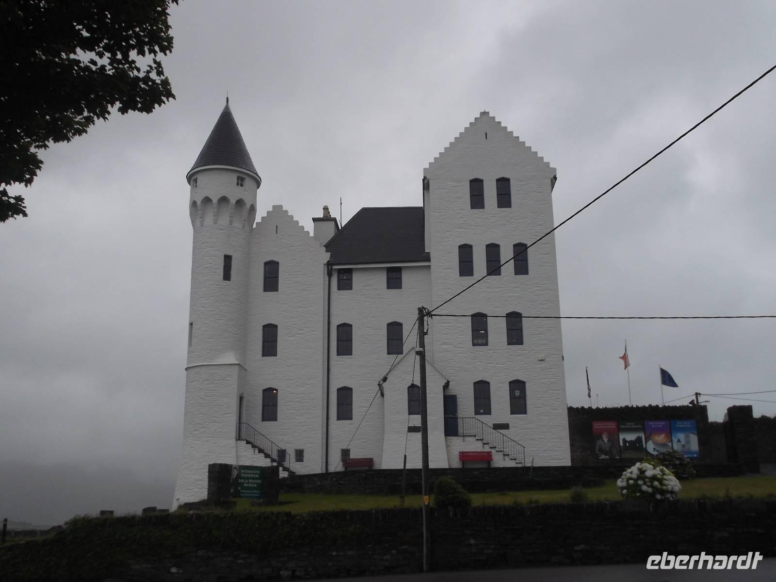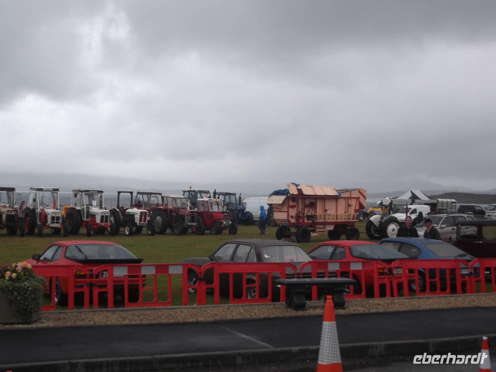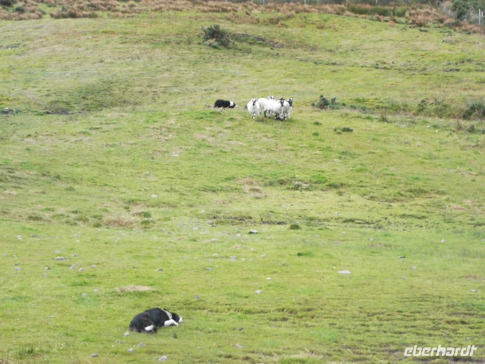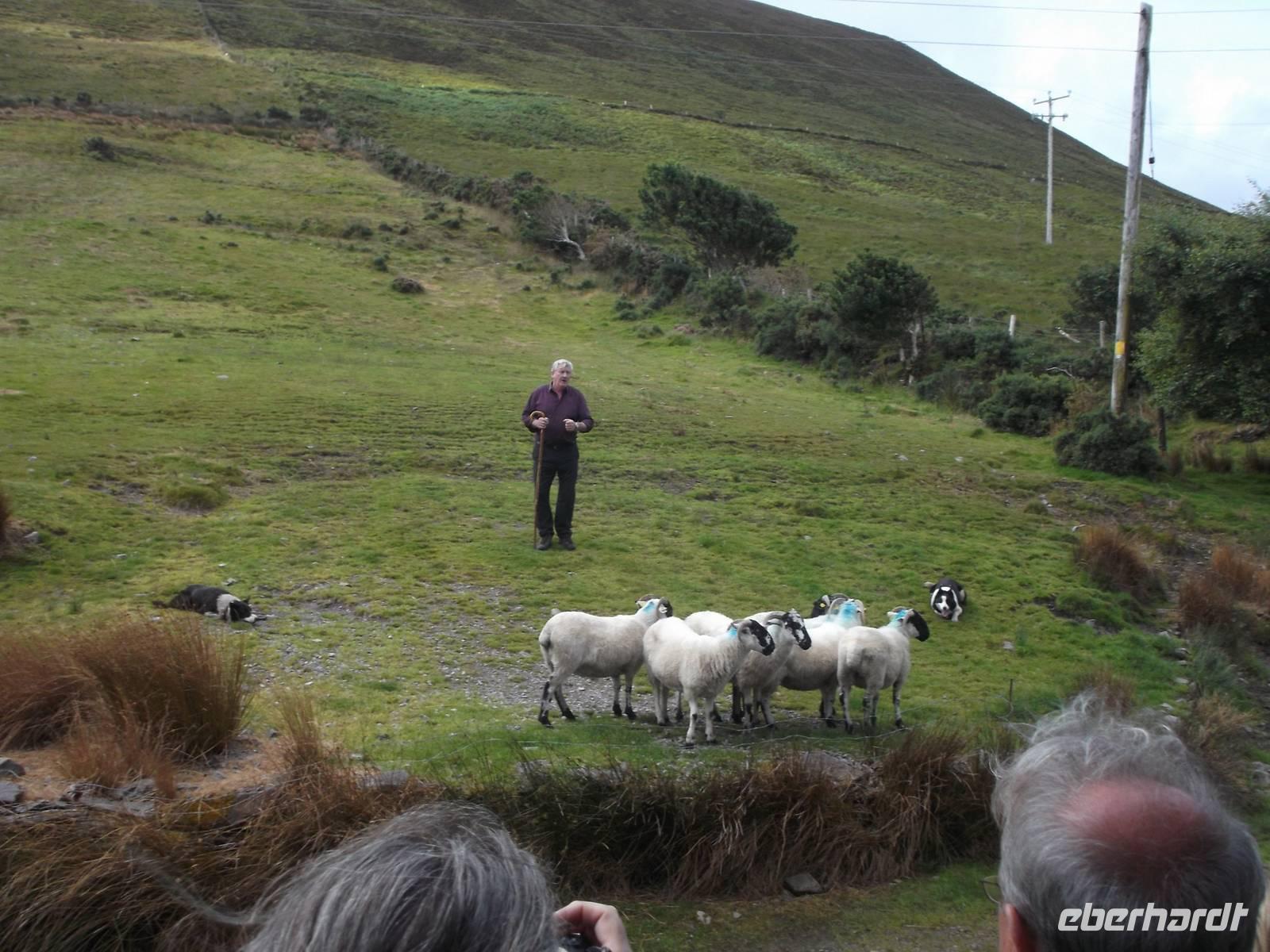 Durch Torfmoore, die teilweise durch Torfstechen der letzten Jahrhunderte bereits ausgebeutet sind, fuhren wir, vorbei am letzten erhaltenen „bog village" - jener Art von Dörfern, deren Bewohner einst komplett vom Torfstechen und -Handel lebten - auf die Küstenstraße und konnten bald noch einen Fotostopp einlegen, bei der wir die Dingle Bay diesmal von der anderen Seite als gestern sahen. Nächster Stopp war der Schäfer Brendan, dessen kleine Schaf-Show nicht nur meist überfüllt, sondern inzwischen weithin bekannt ist. In humorvoller Weise zeigt dieses irische Original den Gästen, wie er mit seinen Hunden arbeitet und Schafe zusammentreibt. Ruf- und Pfeifsignale und ein seltenes Verständnis der Schafhirten mit ihren Bordercollies gehören zu den Geheimnissen des Berufs, der seit Jahrhunderten die unbeaufsichtigt in den irischen Weiden grasenden Schafe zu bestimmten Zeiten zusammentreiben und zur Schur oder zum Verkauf auswählen muss. Eine Vorstellung aller in Irland zu findenden Schafsrassen vervollständigt Brendans Show, die fast immer alle Gäste fasziniert. Nachdem wir uns noch im danebenliegenden Souvenirshp umgesehen hatten, verabschiedeten wir uns von der Schaffarm und setzten unseren Weg fort über den Ring of Kerry nach Cahersiveen. Hier ist ein Fotostopp an der alten Polizeiwache obligatorisch und danach ging es weiter nach Waterville, früher einmal unter anderem bevorzugter Ferienort von Charlie Chaplin, dem man hier auch ein Denkmal errichtet hat. Leider machte der Ort seinem Namen alle Ehre, denn das Wetter verschlechterte sich und es wurde feucht. In Waterville hatten wir unsere Mittagspause und Gelegenheit - trotz Regen - zu einem Bummel in dem kleinen Ort, der gerade am heutigen Tag auf der zentral gelegenen Uferpromenade eine Landwirtschafts-Schau bot.