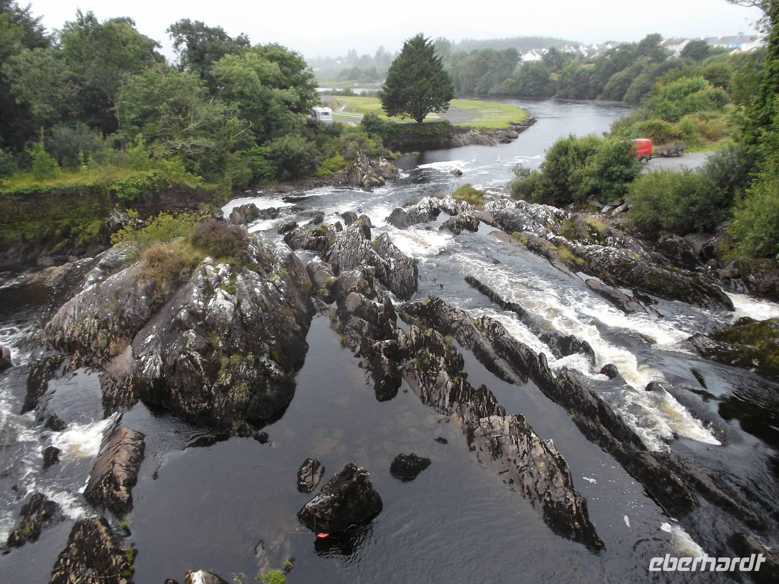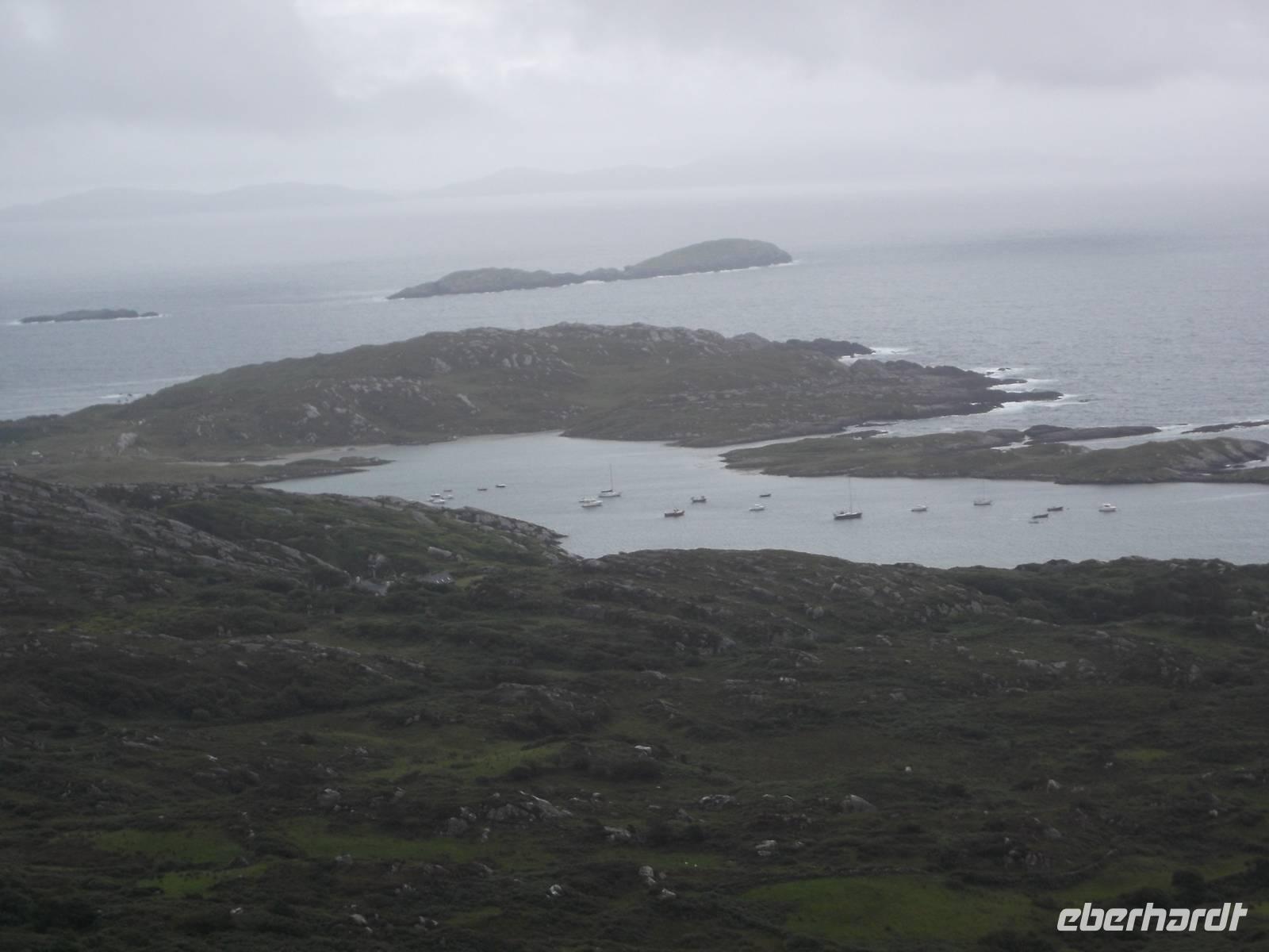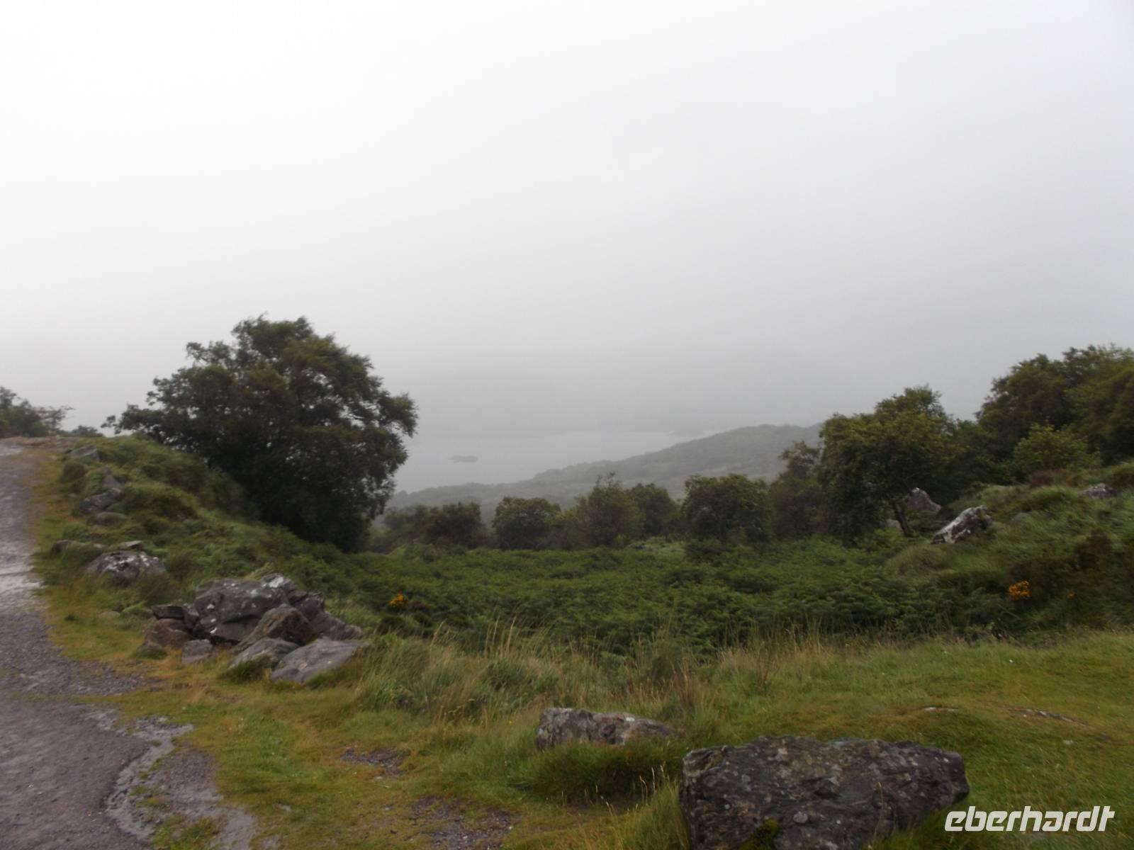 Etwas besser wurde es dann in Sneem, einem kleinen Ort am südlichen Ring of Kerry, in der Nähe der Kenmare-River-Bucht gelegen. Die beiden Teile des Städtchens werden durch einen Wasserfall getrennt. Danach fuhren wir weiter, vorbei an den MacGillicuddy Reeks, den Bergen in der Mitte der Halbinsel Iveragh, zu denen Irlands höchster Berg Carantuohill gehört. Am Rand der Berge gibt es noch den berühmten Ausblick „Ladies View" auf die herrlichen Seen von Killarney, die aber diesmal infolge des schlechten Wetters kaum zu erkennen waren. Über den Touristenort Killarney kehrten wir zur vorletzten Übernachtung in Irland nach Tralee zurück.