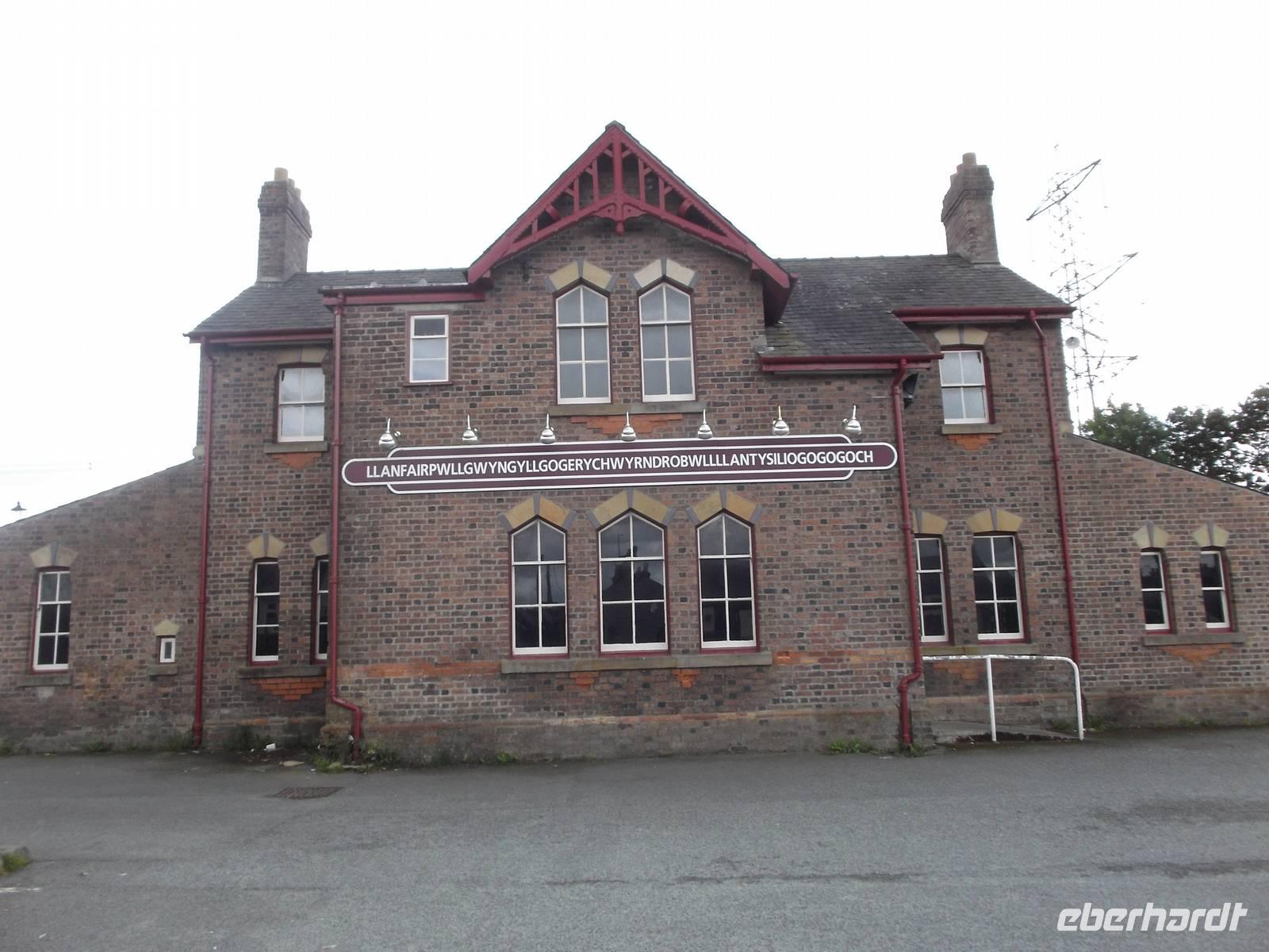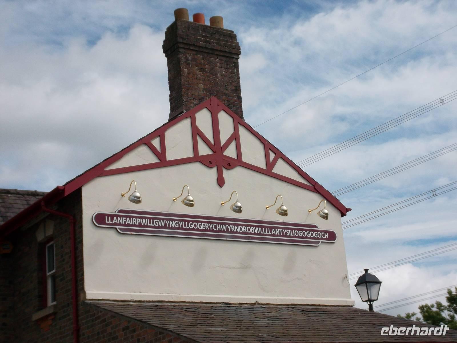 Der Aufbruch für die Busreisegäste erfolgte nach einem sehr frühen Frühstück, denn das Fährschiff „Ulysses" verläßt morgens den Dubliner Hafen recht früh. Kurz nach sieben waren wir schon an Bord des großen Schiffes, das etwa dreieinhalb Stunden vom Dubliner Hafen bis nach Holyhead in Wales braucht. Pünktlich kamen wir dort an und befanden uns nun wieder auf britischem Boden. Diesmal hatten wir mehr Zeit als bei der Durchquerung Großbritanniens auf der Hinfahrt, denn die Fähre nach Rotterdam verlässt Hull erst abends. So konnten wir noch das eine oder andere Reise-Extra einbauen und hielten schon nach wenigen Kilometern an einem ungewöhnlichen Ort. Zum Touristenzentrum wurde er allein wegen seines Namens, des längsten Ortsnamen in Europa. Bahnhof und am Besucherzentrum kann man Llanfairpwllgwyngyllgogerychwyrndrobwllllantysiliogogogoch fotografieren. Es erübrigt sich zu erwähnen, dass er nicht ganz einfach auszusprechen ist. Wir verbrachten ein paar Minuten hier am Besucherzentrum, in dem man allerlei Souvenirs erwerben und mehr über Llanfair PG - wie der Ort der Einfachheit halber von allen genannt wird - erfahren konnte.