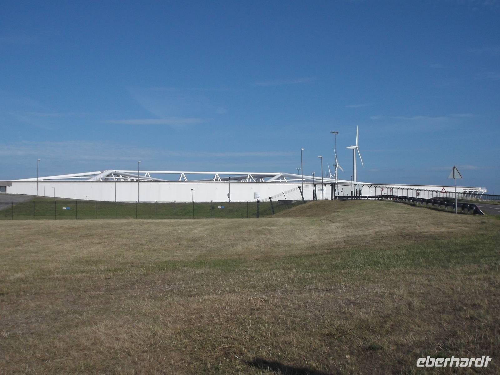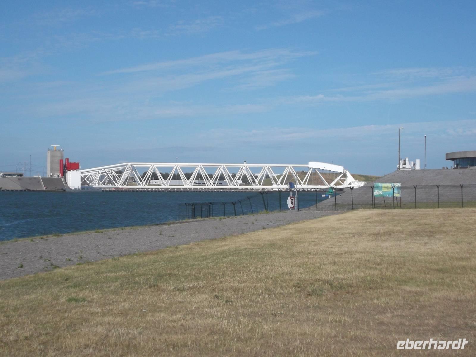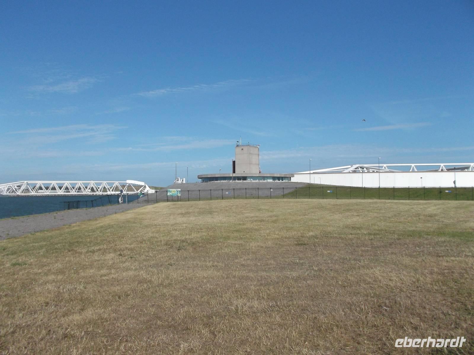 Schließlich hatten wir einen großen Teil des Hafens schon durchquert, so dass Buschauffeur Jörg Hoffmann und ich getreu der Eberhardt „Richtig Reisen!"-Philosphie noch ein kleines Extra für unsere Gäste bieten konnte. Unser Abstecher führte zu den gigantischen Fluttoren an der alten Maas, einem Meisterwerk menschlicher Architektur direkt im Europoort. Bis 1997 wurde dort das von den Einheimischen „Maeslantkering" genannte Wehr als Schutz vor den immer wieder auftretenden Sturmfluten, die vor allem Rotterdam bedrohen, errichtet und angeblich wurde hier dreimal so viel Stahl verbaut wie im Pariser Eiffelturm.
