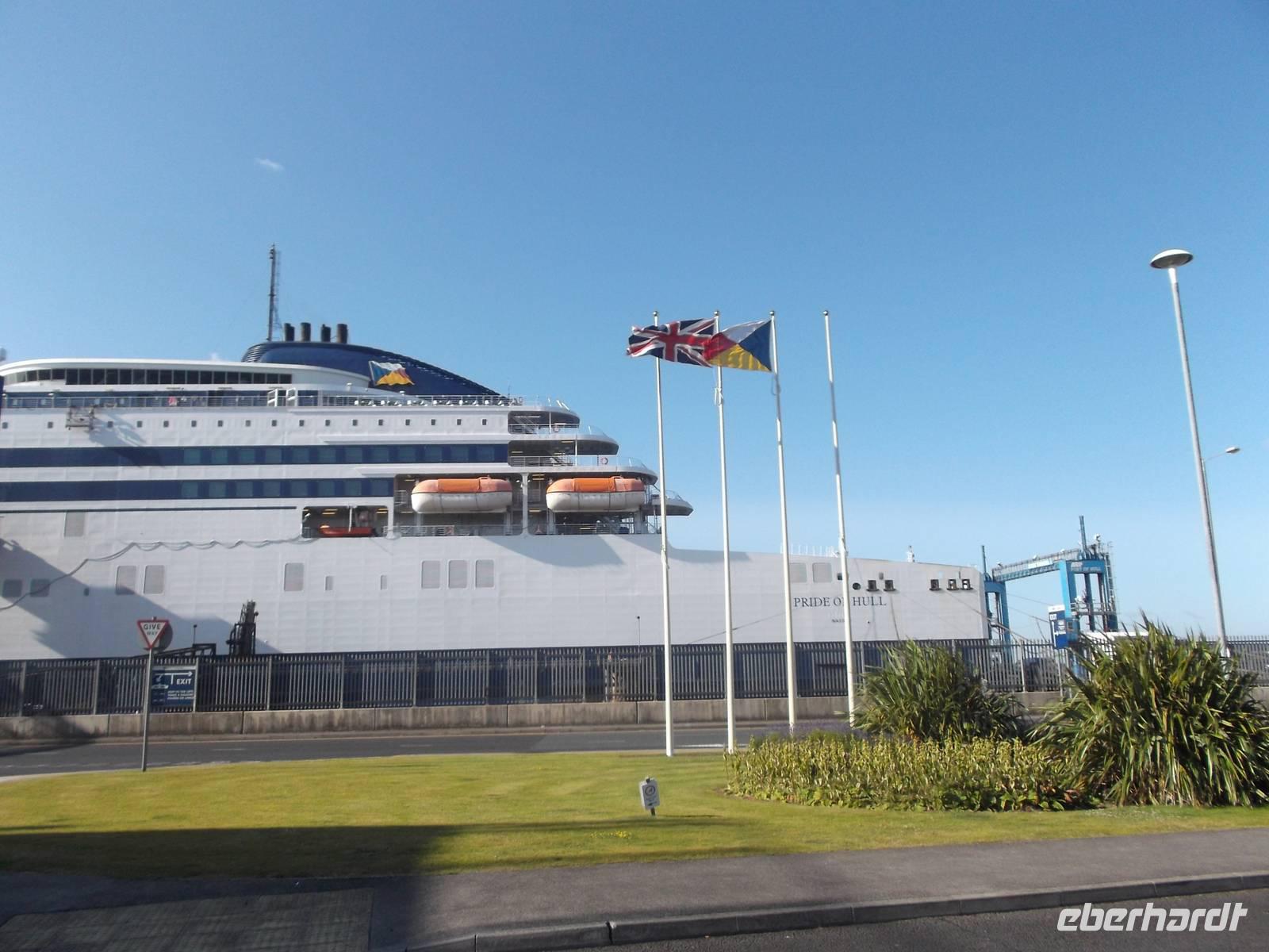 Dann ging es wieder weiter, den „Engeland"- Schildern folgend zum Hafen 5805, wo das Fahrschiff der P &O Fährlinie, die „Pride of Hull", die neben ihrem Schwesterschiff „Pride of Rotterdam" die Rotterdam - Kingston-upon-Hull - Überfahrt jede Nacht bedient. Nach kurzem Check in betraten wir das beeindruckend große Schiff mit seinen hunderten kleinen, aber komfortablen Kabinen. Alle von uns waren nur mit kleinem Gepäck an Bord gegangen, um in den doch recht engen Schiffsräumen nicht mit großen Koffern hantieren zu müssen. Ein Abendessen vom traditionellen und reichhaltigen Schiffsbuffet und vielleicht noch ein kurzer Besuch in der „Showlounge" oder einer der Schiffsbars beendeten den ersten Reisetag.