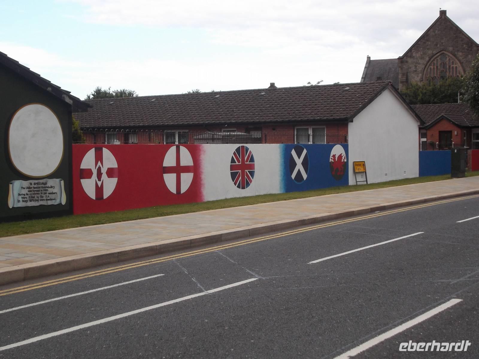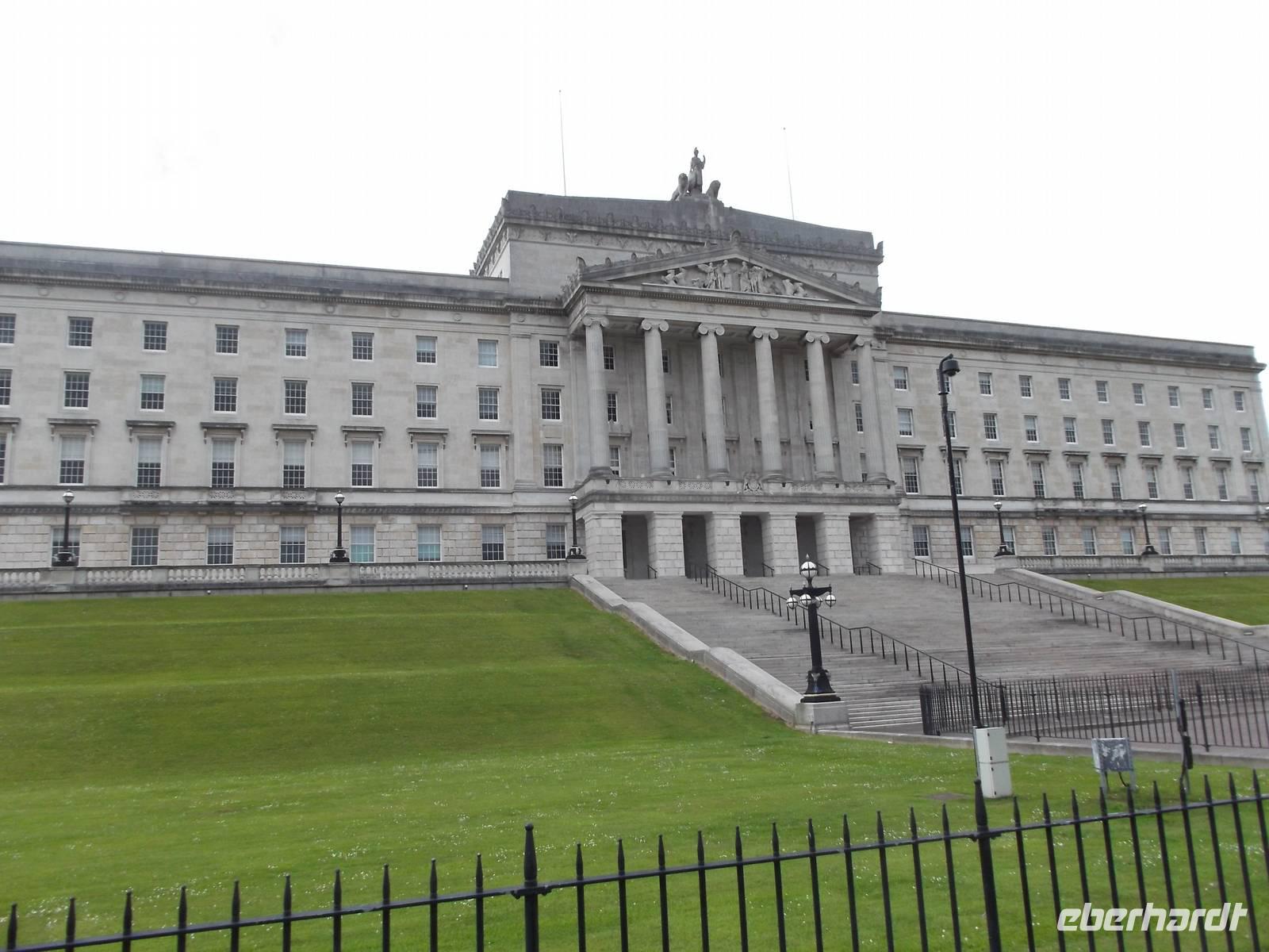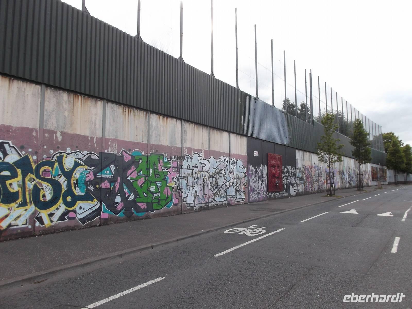 Stadtführer Willie Swann kenne ich schon lange und halte ihn für einen der versiertesten. Wir begannen wie immer mit dem ersten großen Highlight von Belfast: dem gewaltigen Rathaus aus viktorianischer Zeit, neben dem das Denkmal für die Opfer der Titanic-Katastrophe steht. Er fuhr mit uns hinaus zu den neogotischen Universitätsgebäuden und zeigt uns auch das das herrlich außerhalb der Stadt gelegene Parlamentsgebäude Stormont. Was sicher die größte Faszinations der nordirischen Hauptstadst ausmacht, ist eng mit der Geschichte des Landes und ihrer vorherrschenden Religionen verbunden. Unsere Fahrt führte durch einige der bekanntesten Straßen von West- und Ost-Belfast, wo noch heute durch bedeutende und teilweise einst durch die Nachrichten bekannte Wandmalereien ein Hinweis auf die vor knapp zwanzig Jahren überwundenen Unruhen in Nordirland erfolgt und sich Erklärungen für die teilweise bis heute nicht überwundene Teilung der Religionsgruppen in Belfast ergeben.