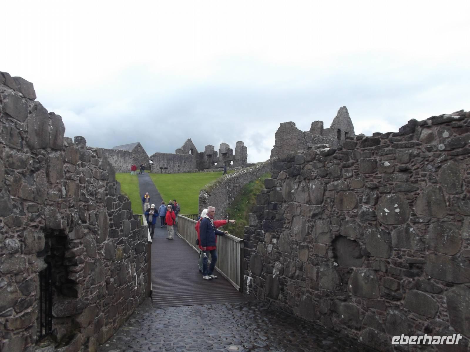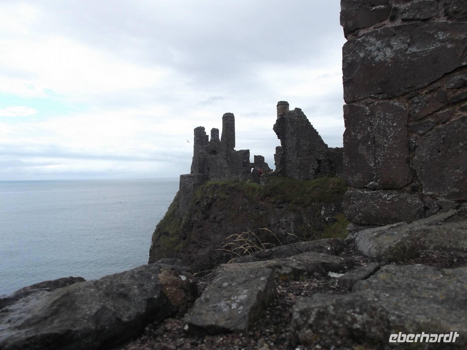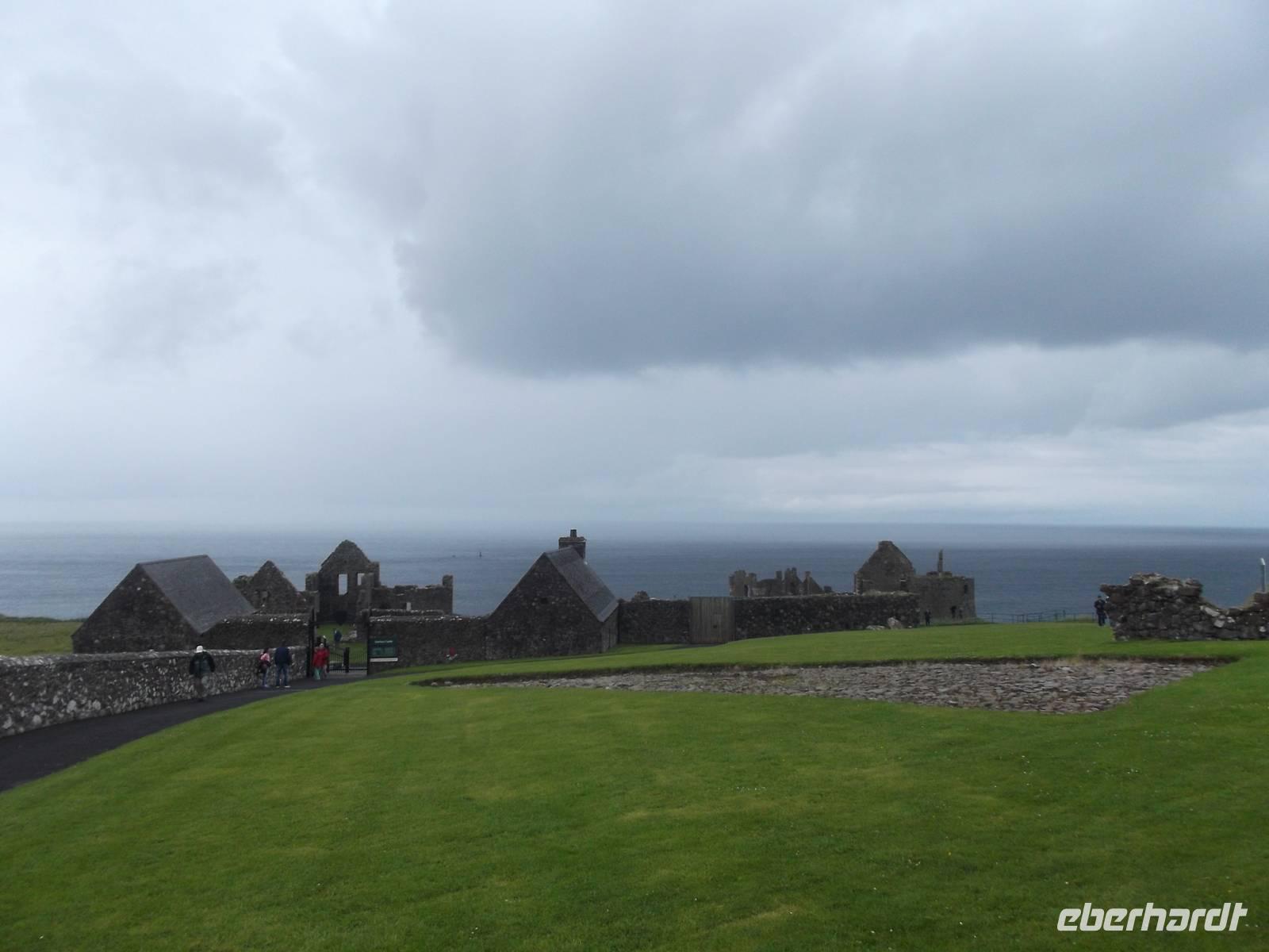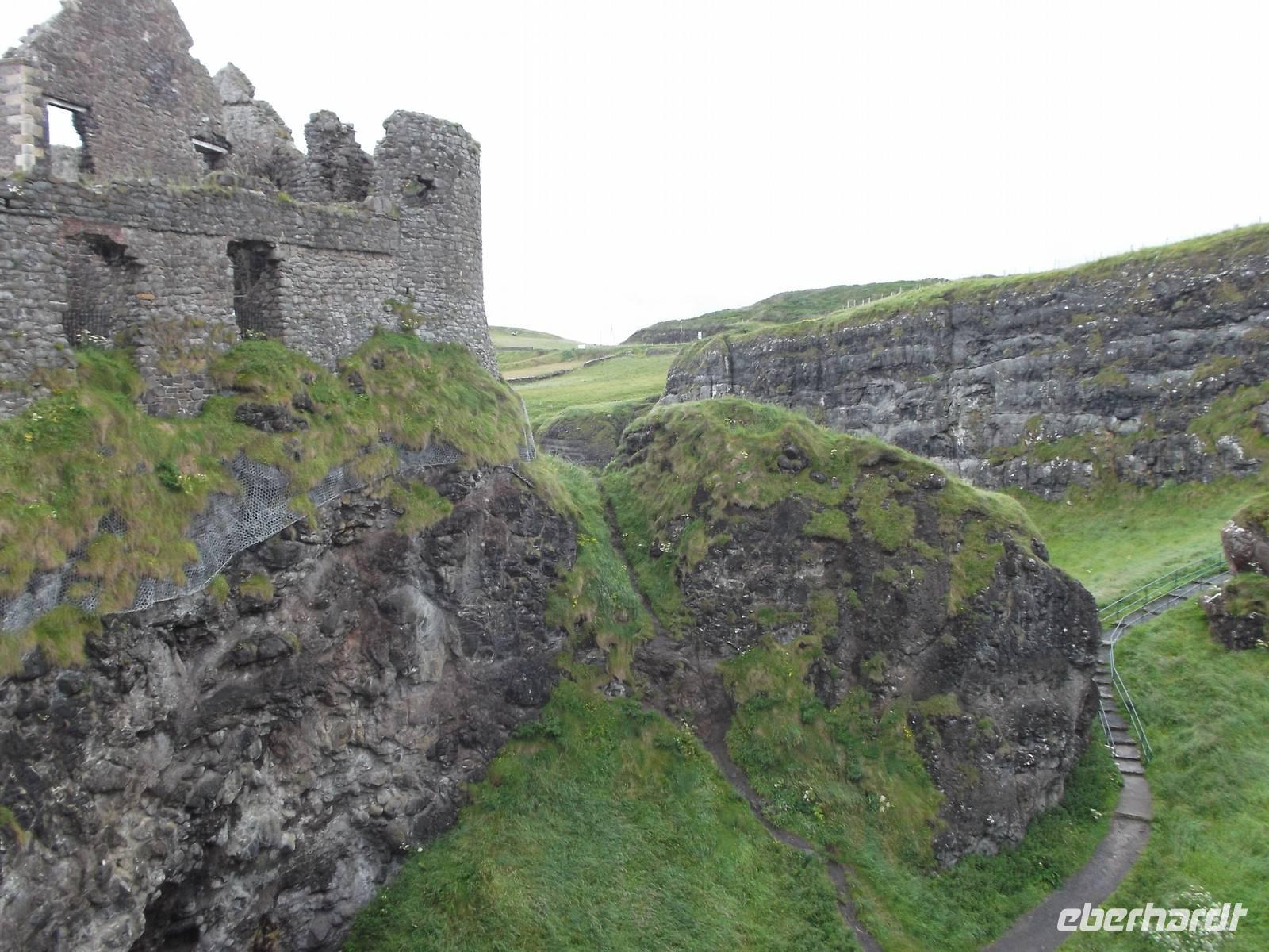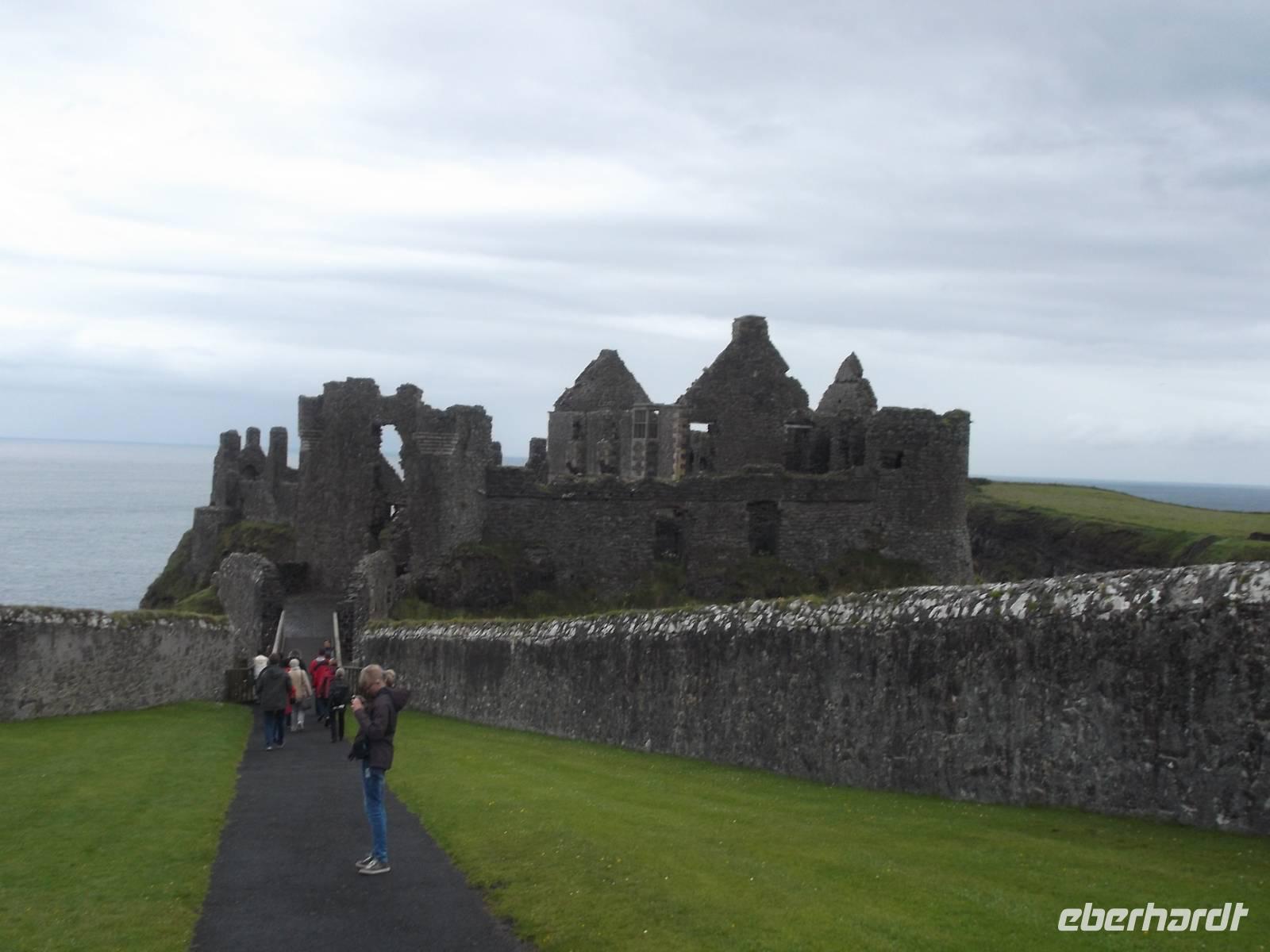 Auf unserem Weg vom Causeway nach Londonderry besuchten wir - als „Richtig Reisen!"-Extra noch Dunluce Castle. Die malerische Burgruine liegt auf einem zerklüfteten Basaltfelsen über der Causeway-Küste und ist mit Legenden über die Clans der Umgebung und die bewegte Geschichte Irlands verbunden. Ein Schatzschiff der Spanier soll direkt vor der Burg versunken sein, wurde geplündert und mit dem Erlös die Burg vergrößert. Später soll dann aber bei einem gefährlichen Sturm die neuerbaute Burgküche mitsamt Personal im Meer versunken sein.