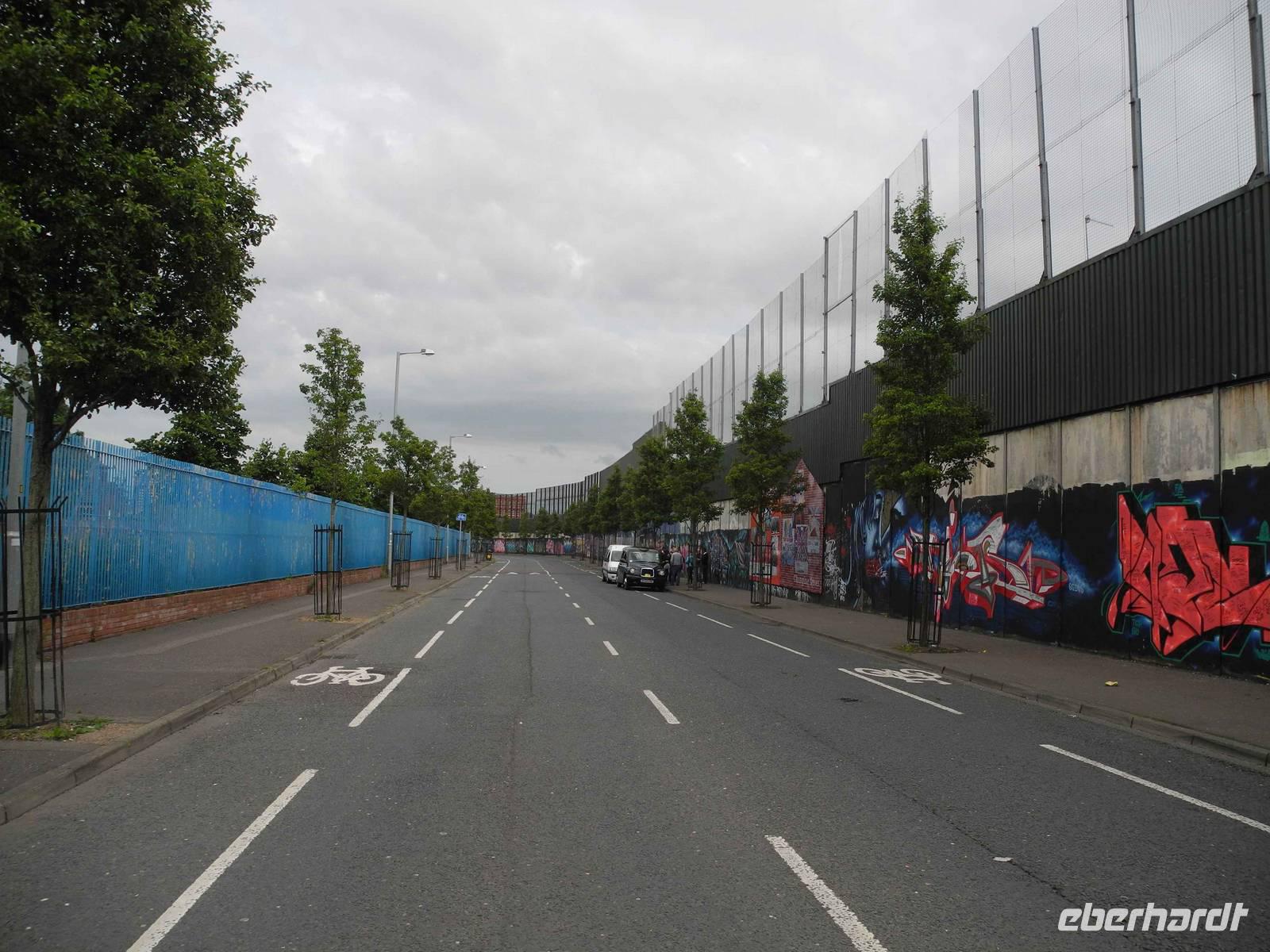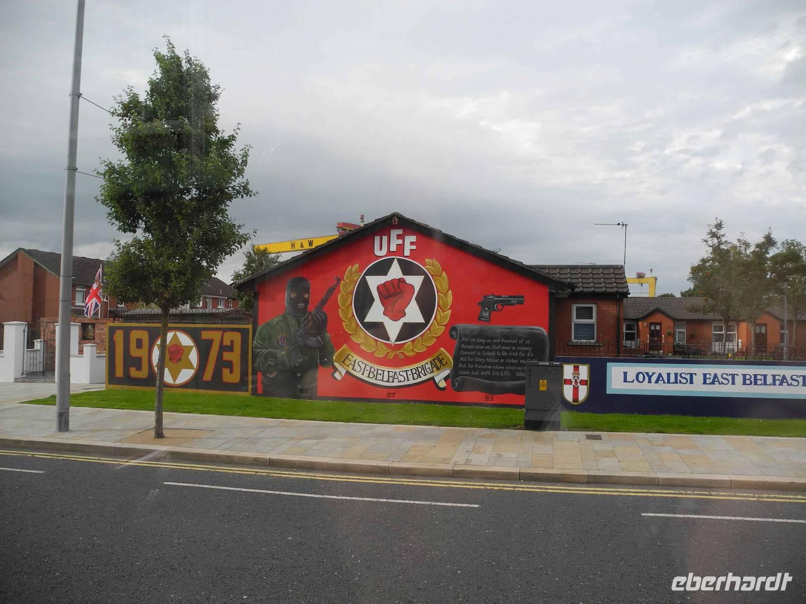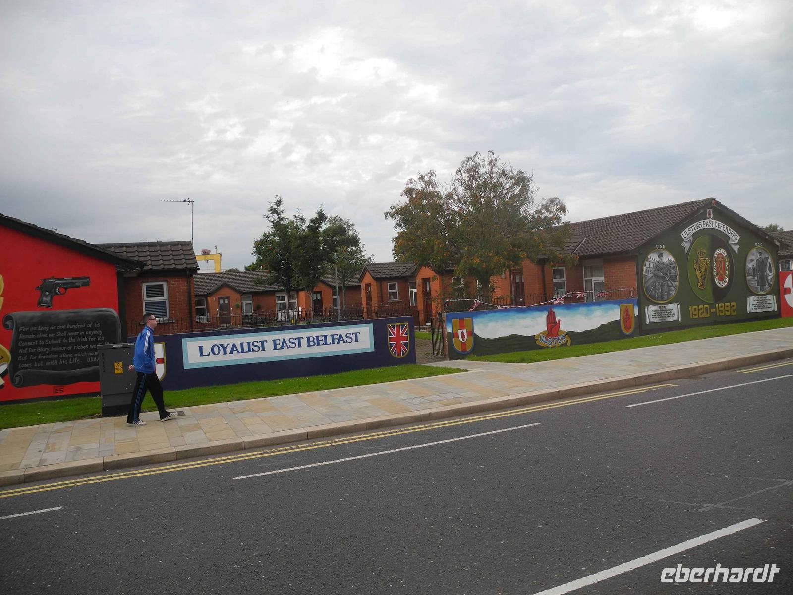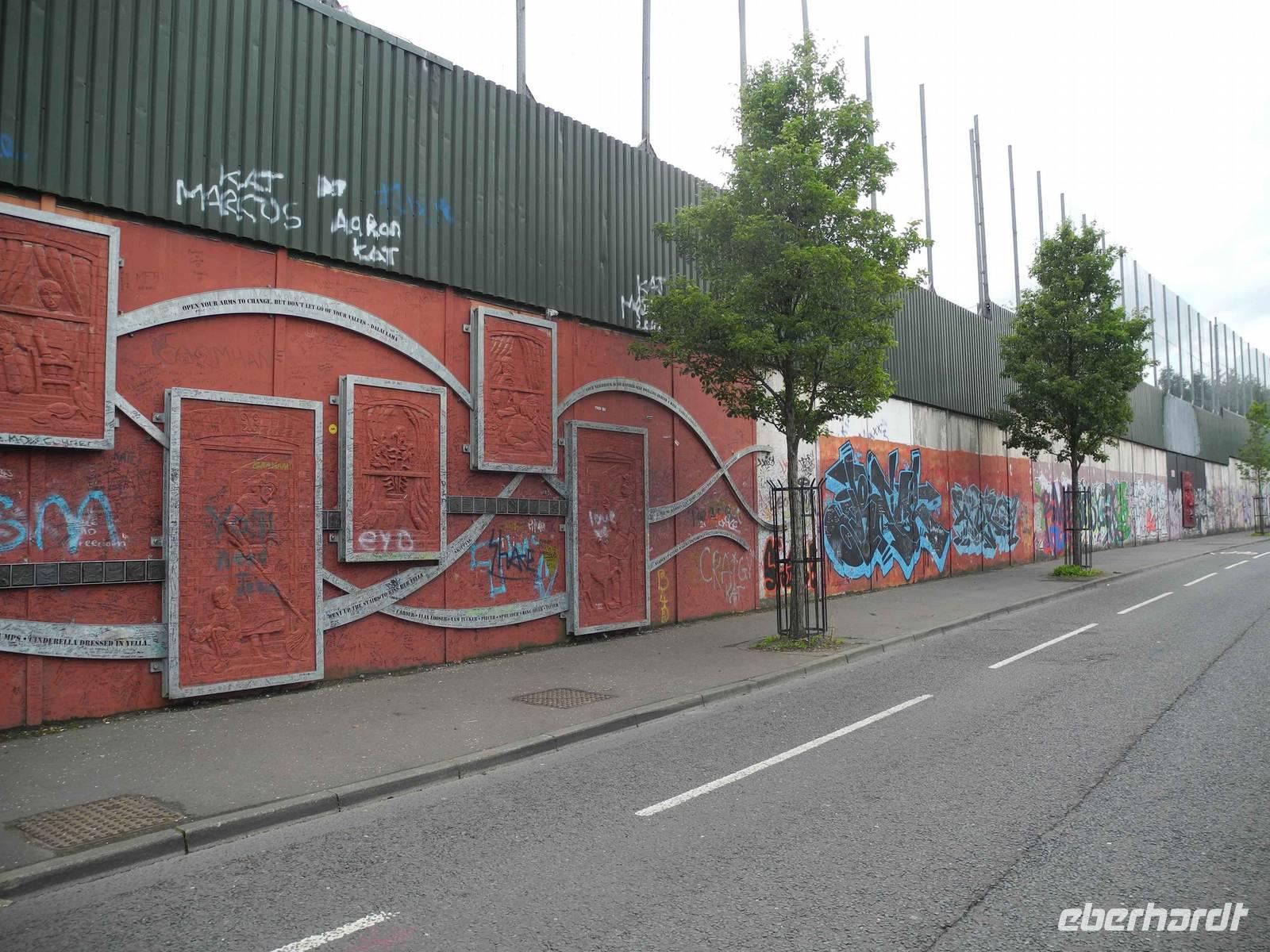 Beim Abschied winken uns die kleinen Rennfahrer zu und wir müssen ihnen versprechen, dass wir ihnen einige unserer Fotos zuschicken werden (was wir natürlich auch tun!).Weiter geht es nach Belfast, wo wir zunächst unsere Zimmer beziehen, bevor uns der örtliche Reiseleiter Willie mit auf eine Stadtrundfahrt durch seine Heimatstadt mitnimmt.Wir sind sehr beeindruckt von der Belfast gleichzeitig aber auch bewegt durch die noch immer spürbare Kluft in der Bevölkerung, die durch erkennbare Machtbekundungen der einzelnen Streitparteien, sei es durch Wandbemalungen, englische Flaggen, Gitter oder Mauern, deutlich wird.