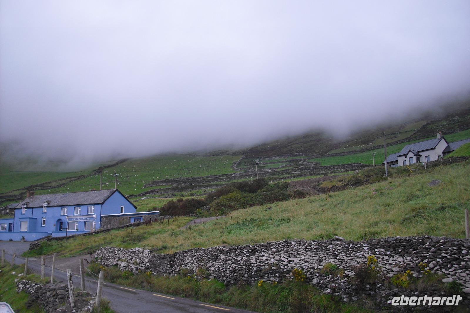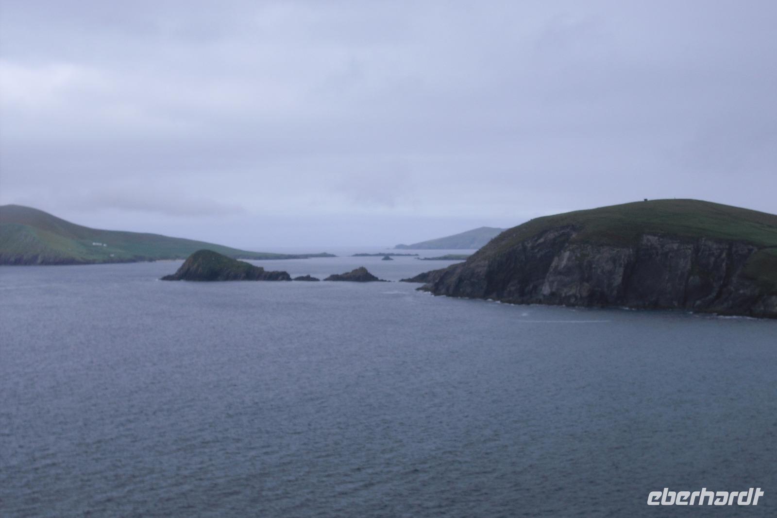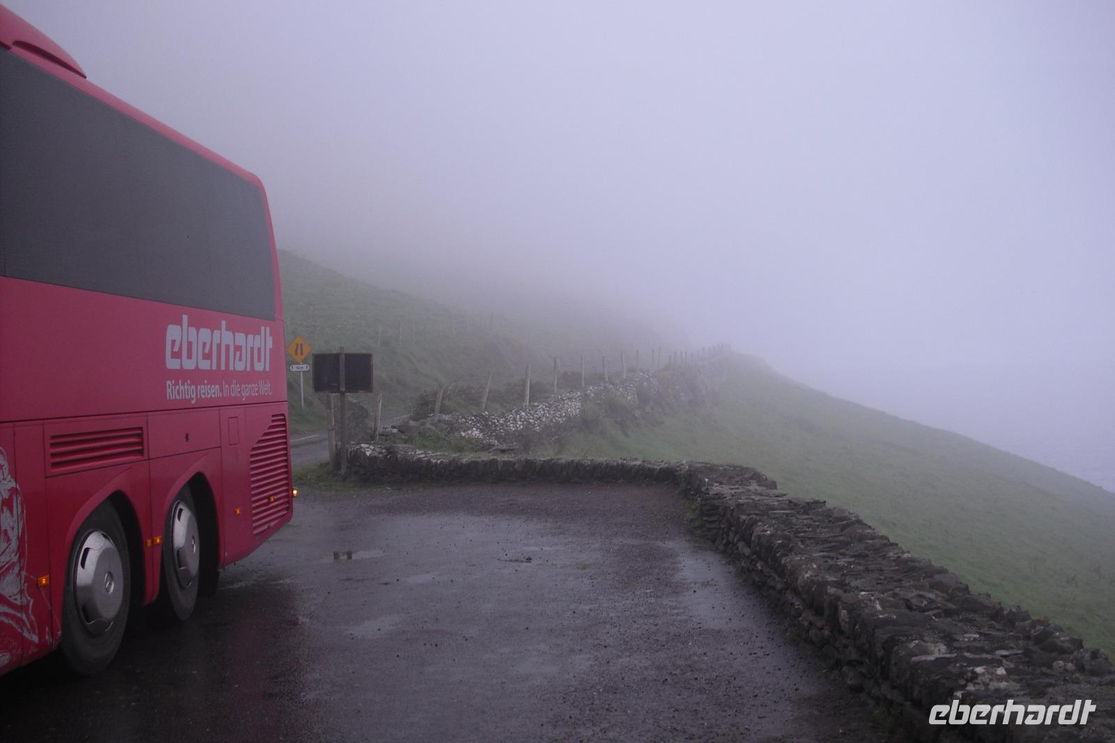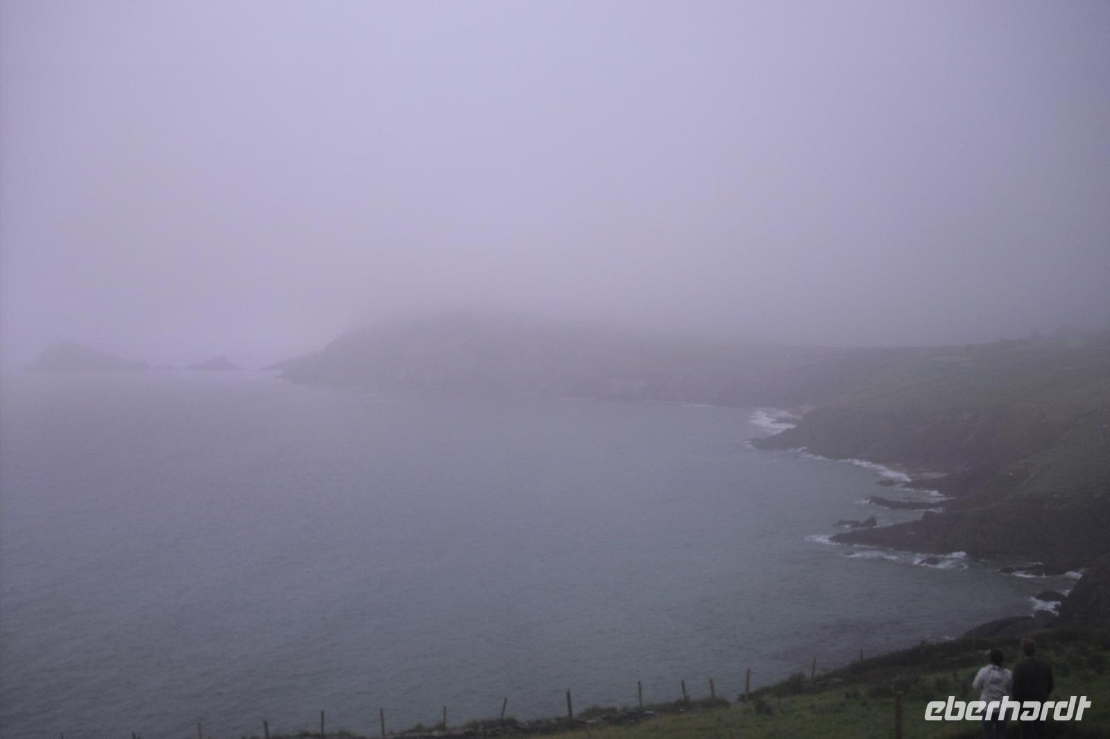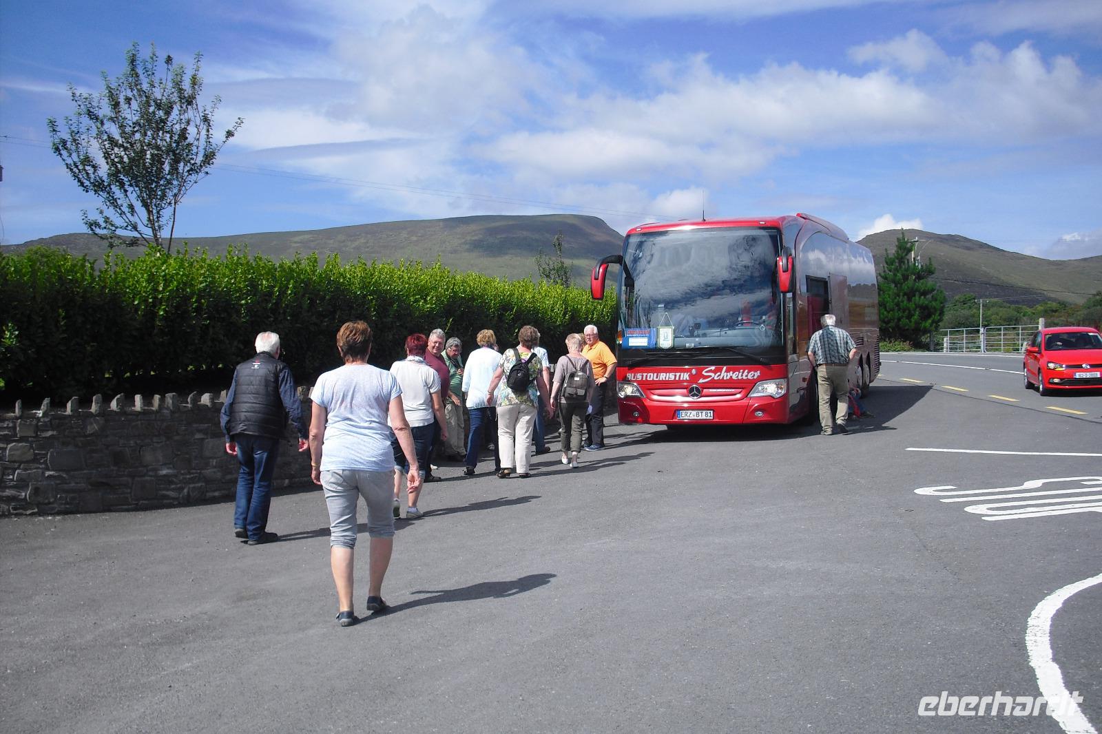 Deutlich kleiner als die Iveragh-Halbinsel (Ring of Kerry am Vortag ) besuchten wir auf unserer Tagestour die Dingle-Halbinsel. Sie erstreckt sich als Gebirgszunge ca. 50 km in den Atlantik, ist einsam, karg, gewaltig und von den ständig wechselnden Stimmungen des Atlantik geprägt. Und genau das sollten wir an diesem Tag erleben, ja bestaunen. Diese atemberaubende Landschaft mit dichten Fuchsienhecken, mit ganzen "Feldern" der Montbretia und den weitläufigen Torfflächen mit einem Teppich aus Heidekraut überzogen, zog uns in ihren Bann. Schon ein erster Fotostopp bot ein Naturschauspiel. Eine neblige Wand hob sich, die Sonne versuchte sich durchzukämpfen und es baute sich ein Regenbogen auf. Beim zweiten Fotostopp lag eine Nebeldecke über uns, aber eine fantastisch klare Sicht hatten wir über die Dingle-Bucht bis zur Iveragh-Halbinsel hinüber. Unglaublich! Nach einem Servicestopp in Dingle fuhren wir entlang des Slea Head Drive und Kersten hatte alle Mühe, mit dichtem Nebel und der engen, felsigen Fahrstraße sowie dem Gegenverkehr auszukommen. Wie er auch das wieder machte, einfach toll. Wir fühlten uns in seinen Fahrerhänden jederzeit sicher. Am Slea Head View Point machten wir einen weiteren Fotostopp und sahen ......nichts! Ein nächster Fotostopp wurde gegenüber der Blasket Insel gemacht, im Nebel. Nur zwei einsame Ladies saßen in ihren Autos und boten wassergeschützt Kuchen und Schmuck an. Und eine zeigte uns auf ihrem mobile phone, wie die Sicht zur Blasket Insel bei schönerem Wetter ist. Zahlreich entstanden Fotos vom Foto und .... und ... und es passierte Unglaubliches! Der Nebel riß auf und aller zehn Sekunden bot sich die Blasket Insel in klarerer Kontur dar. Nun konnte jeder Reisegast noch ein Originalfoto machen. Nach einem Serviceaufenthalt im Blasket Centre sind wir dann nach Dingle gefahren und haben den Ort ausführlich erkundet. Er lebt natürlich vom Tourismus und das merkten wir auch an der Menschenmenge. Bunte Häuserfassaden, Souvenierläden, zahlreiche Pubs sowie jede Menge Fotomotive entdeckten wir auf der Pirsch durch den Ort. Die Rückfahrt zum Hotel wählten wir über Inch Beach. Hier sind ganz mutige Gäste im Wasser des Atlantik baden gegangen. In unserem Hotel angekommen gab es heute ein früher angesetztes Abendessen, ein großer Teil unserer Reisegruppe besuchte später das Irish National Theatre-Siamsa Tire. Auf dem Programm dieses Abends stand für uns Fado Fado. Eine faszinierende Darbietung irischen Lebens in verschiedenen Jahreszeiten und die Erinnerung, daß sich alles im Leben, was wir kennen,lieben und feiern, im Zyklus wiederholt.