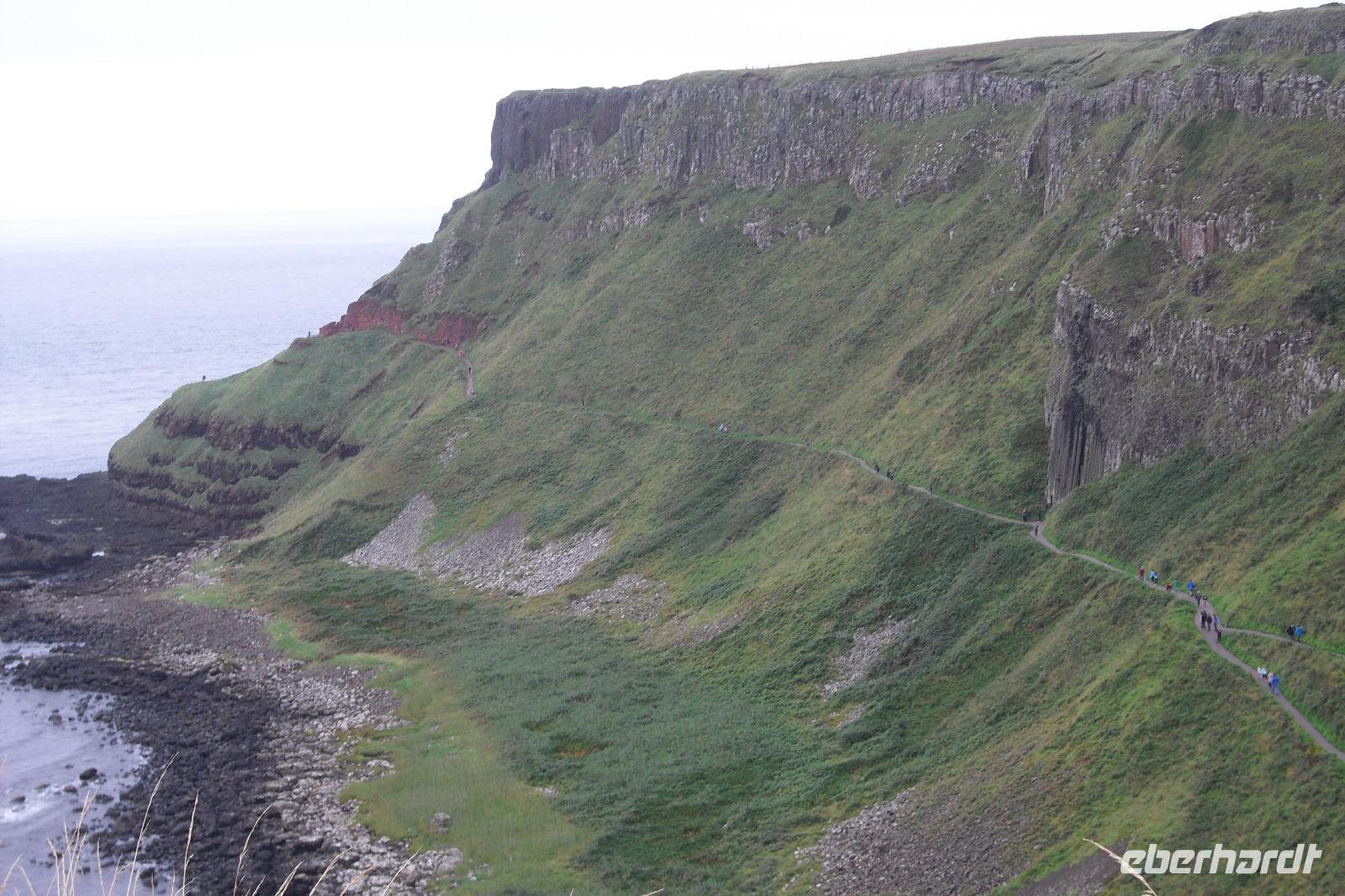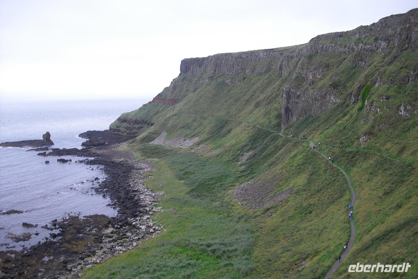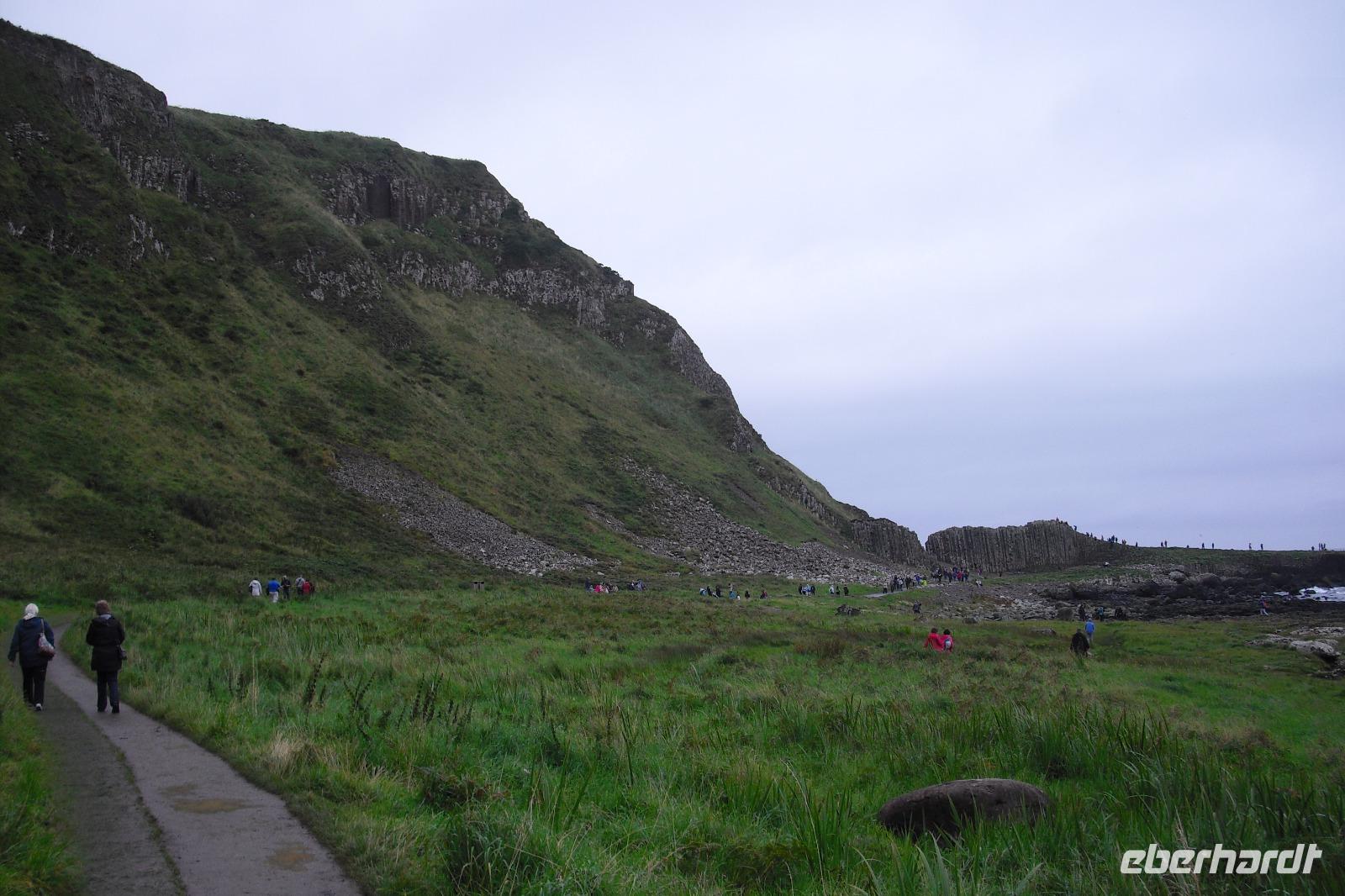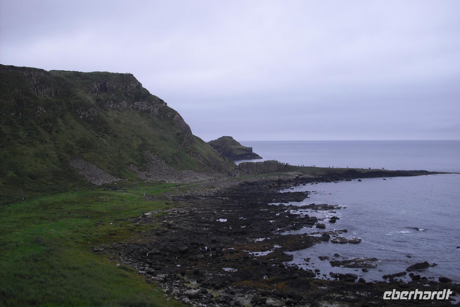 Regnerisch begann der Tag, es ließ dann aber nach und hörte sogar ganz auf. Nach dem Frühstück besuchten wir den über Jahrhunderte hinweg bedeutenden Stützpunkt der Normannen und später der Engländer-Carrickfergus. Hier landete auch Wilhelm von Oranien 1690 und begann seinen Feldzug um die englische Krone. Noch heute ist Carrickfergus Castle imposant. Es ist die größte und besterhaltenste Festungsanlage Nordirlands. Es begann wieder stärker zu regnen und die Antrimküstenstraße versteckte alle ihre Schönheiten zwischen Larne und Ballycastle in graue Nebelschleier. Belohnt wurde unsere Zuversicht dann am Giant´s Causeway. Auf dem Weg dorthin machten wir eine kleine Servicepause in Ballycastle, ein kleines Marktzentrum im nordöstlichsten Zipfel der irischen Insel und unsere Mittagspause verbrachten wir in Bushmills. Angekommen am Giant´s Causeway - des Riesen Damm - wurden wir mit Audio-Guides ausgerüstet und konnten entsprechende Erklärungen an verschiedenen nummerierten Objekten bekommen. Mehr als eine halbe Million Besucher jährlich zieht diese bekannteste Naturschönheit Nordirlands an und steht seit 1986 auf der UNESCO Liste des Weltkulturerbes. Faszinierend diese etwa 40000 meist sechseckigen Basaltsäulen. Wissenschaftliche Untersuchungen ergaben, daß diese Gesteinsformationen vor über 60 Millionen Jahren entstanden sind. Vom Besucherzentrum aus konnten wir bei akzeptablem Begleitwetter ausgiebige Spaziergänge unternehmen und dieses Schauspiel der Natur bewundern. Am Nachmittag besuchten wir noch Derry. Die Stadt hat eine lange und bewegte Geschichte, hier ganz kurz: 546 gründete der Heilige Colum Cille ein Kloster; das Kloster wurde mehrfach von den Wikingern zerstört; vermutlich an dieser Stelle steht heute die protestantische Kirche; nach der legendären Flucht der Grafen sprach James I. 1613 die Stadt Londoner Gilden zu; die englische Herrschaft war damit endgültig gefestigt und Derry wurde in Londonderry umbenannt; die mächtigen Stadtmauern entstanden und sind die längsten Stadtbefestigungen der Britischen Inseln. Auf einem Teil der Stadtmauer sind wir entlanggelaufen. Nach dem Aufenthalt in Derry fuhren wir mit unserem Bus, wie schon an den Vortagen souverän und sicher von unserem Kersten gelenkt, nach Letterkenny. Wir bezogen das Hotel für zwei Nächte, hatten also einen "gepäckfreien" Tag. Nach unserem Abendessen zeigte der Reiseleiter uns noch einen Pub mit Live-Musik. Viele nahmen das Pubangebot an, auch unsere Fairy. Wir landeten in Letterkenny in Mc Ginley´s Bar und kein Teilnehmer hat es bereut. Die Stimmung, die Musik und mittendrin Fairy mit der exellenten Stimme und dem Spiel auf der Gitarre, der Laden war begeistert - wir auch! Was für ein Abschluß dieses Tages - unglaublich !!!