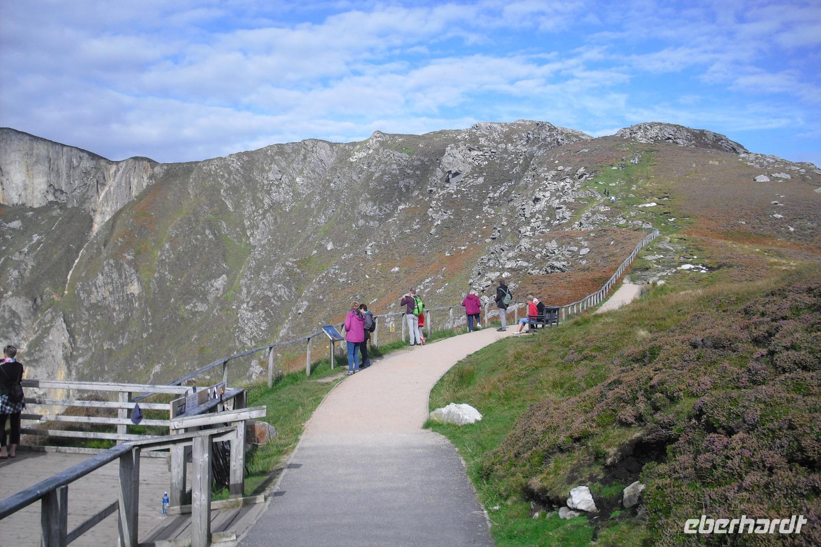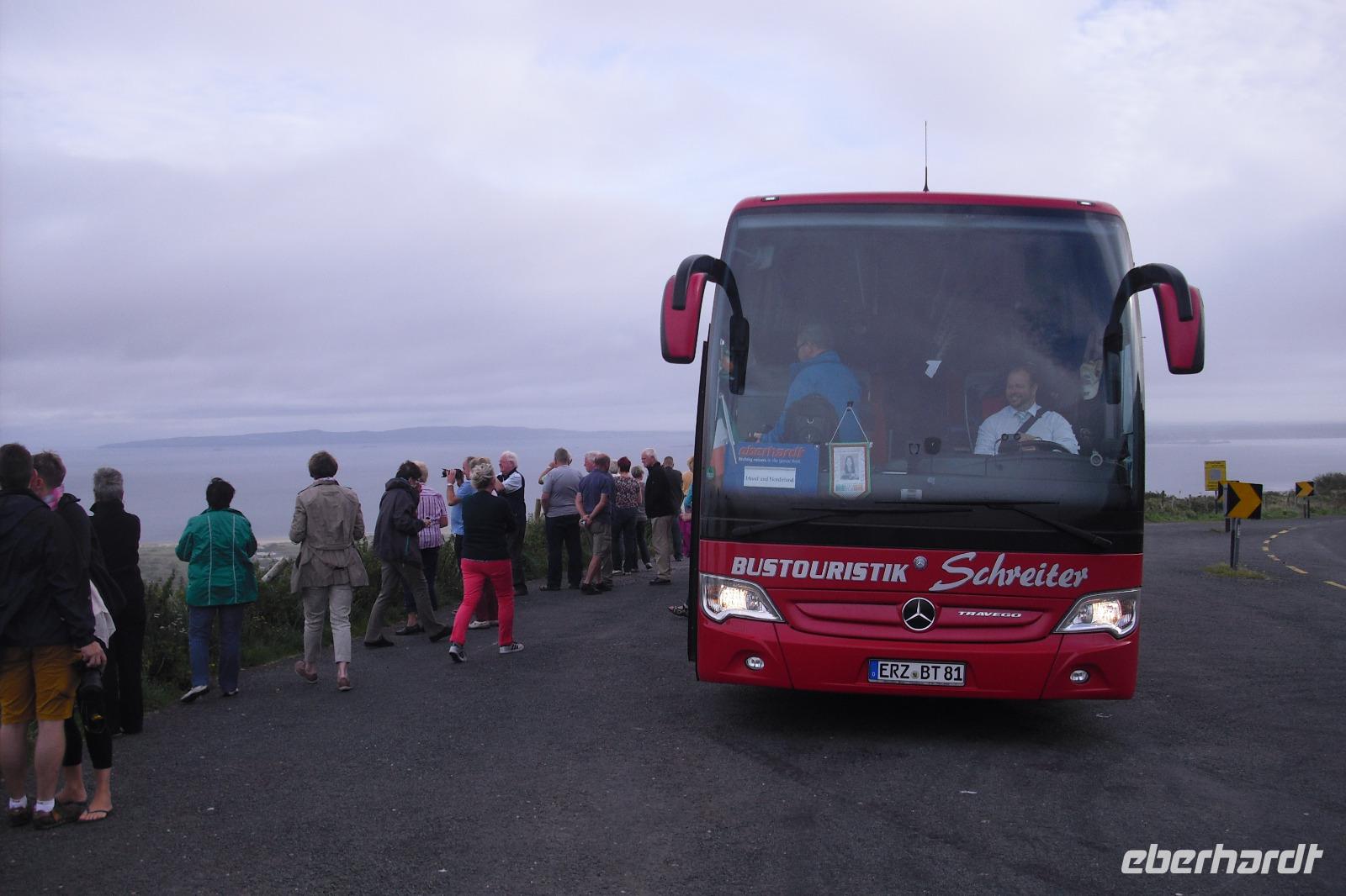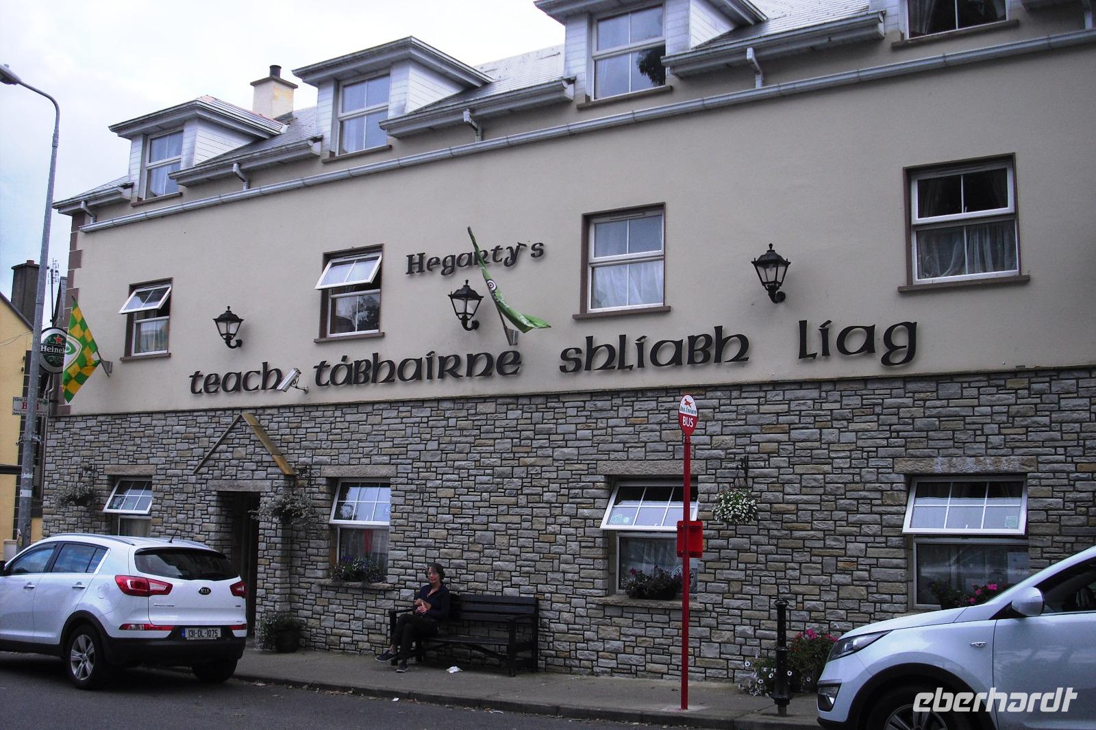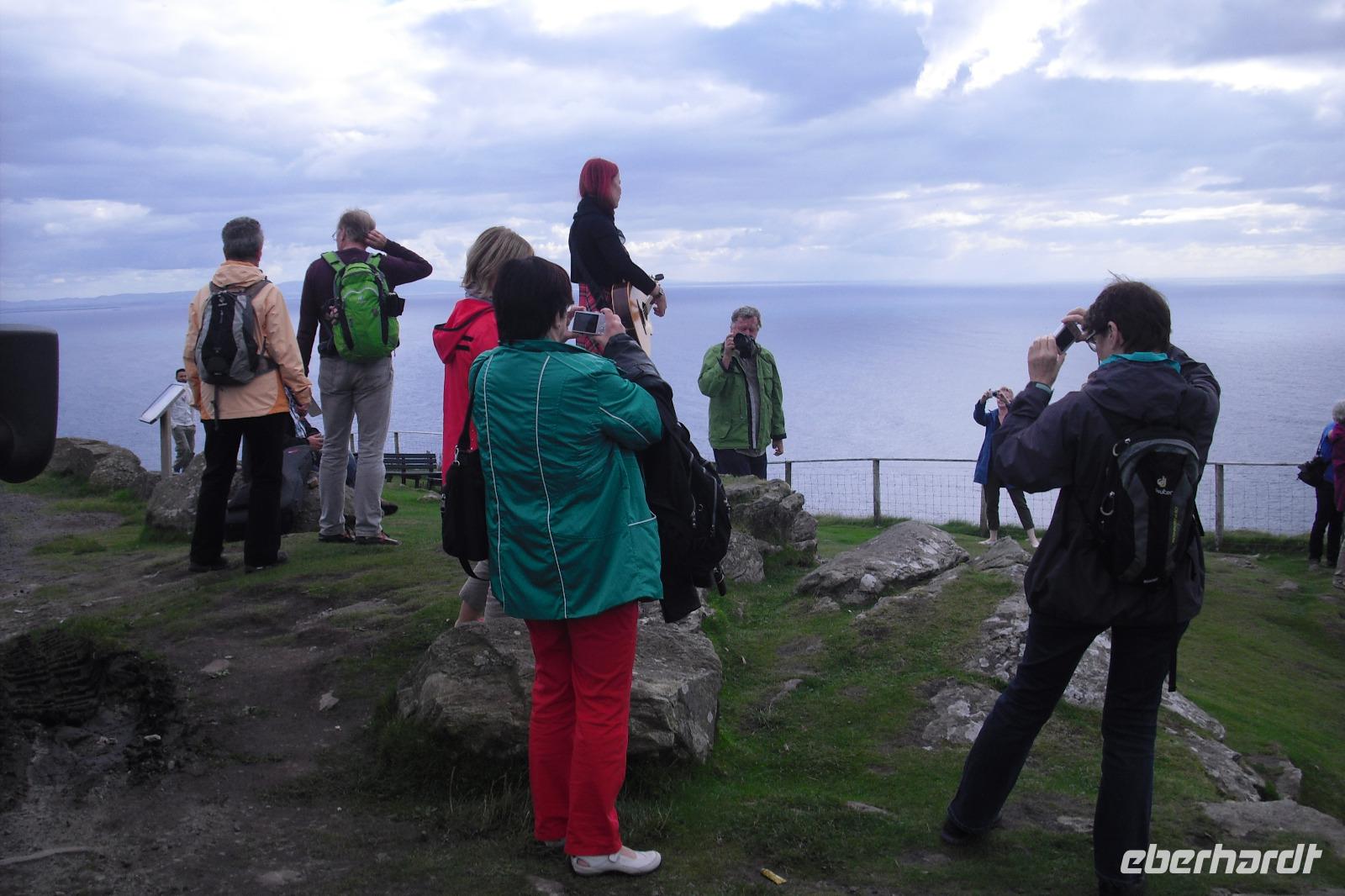 Am heutigen optionalen Ausflug in den Glenveagh Nationalpark, zum Glenveagh Castle und durch die wunderschöne Landschaft Donegals nahmen fast alle Gäste teil und so brachen wir gleich nach unserem Frühstück auf. Ein herrliches Wetter begleitete uns den ganzen Tag. Als erste Aktivität im Nationalpark führte man uns in ein kleines Kino im Besucherzentrum und stellte uns deutschsprachig die Geschichte des abgeschiedenen Tales, die des Schlosses und seiner Gärten sowie die Flora und Fauna der Region in einem kurzen, gut gemachten Film vor. Dann fuhren wir mit einem Minibus bis zum Schloß und hatten eine Führung. In vielen der Räume sahen wir noch das Mobiliar des letzten Eigentümers Mr. Mcllhenny. Er übergab 1981 das Schloß und die Gärten an den irischen Staat als Geschenk. Eine wahre Pracht sind die vor mehr als 100 Jahren erstmals entworfenen Gärten. Auch Wanderungen waren möglich und ein großer Teil der Gäste entschied sich beim Rückweg zum Besucherzentrum gegen den Minibus. Mit Fotostopp und einer Tankeinlage für den Bus fuhren wir anschließend zum Atlantik. Es konnte gebadet werden. Beim nächsten Fotostopp am Glengesh-Pass ersang sich unsere Fairy an einem Imbisskiosk einen Kaffee und machte dem Betreiber und uns eine große Freude. Da das Wetter mitspielte bot sich an diesem Tag der Besuch der Slieve League (603 m Höhe) in Donegal an. Es war einfach fantastisch, was uns die Natur und dazu die Musik von Fairy an den Slieve League bot, unglaublich ! Nach diesem wunderschönen Aufenthalt fuhren wir zum Abendessen in die Sleave League Lodge nach Carrick, wo im Anschluß noch Musik von Fairy geboten wurde. Und wie wir alle mitmachten, großartig. Aber auch dieser schöne Tag mußte mal ein Ende haben, deshalb fuhren wir mit unserem Bus zurück zum Hotel in Letterkenny. Einige hatten noch nicht genug und landeten nochmals im Pub des Vorabends.