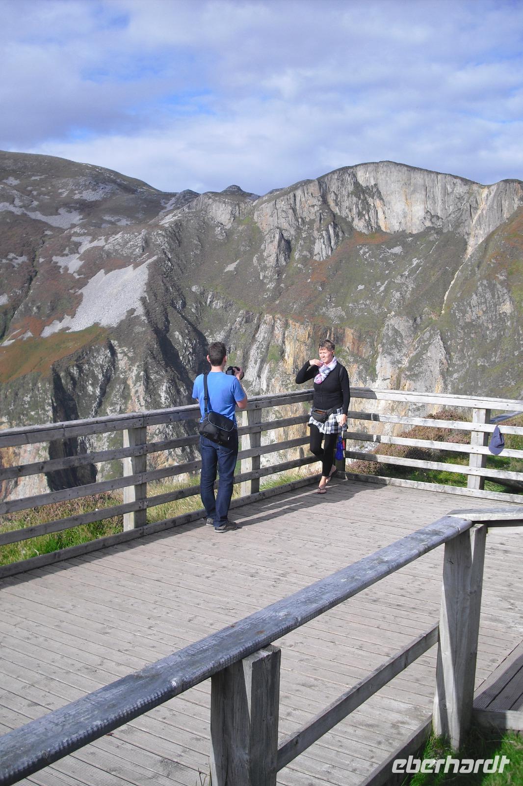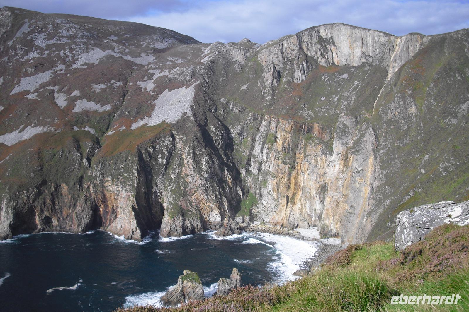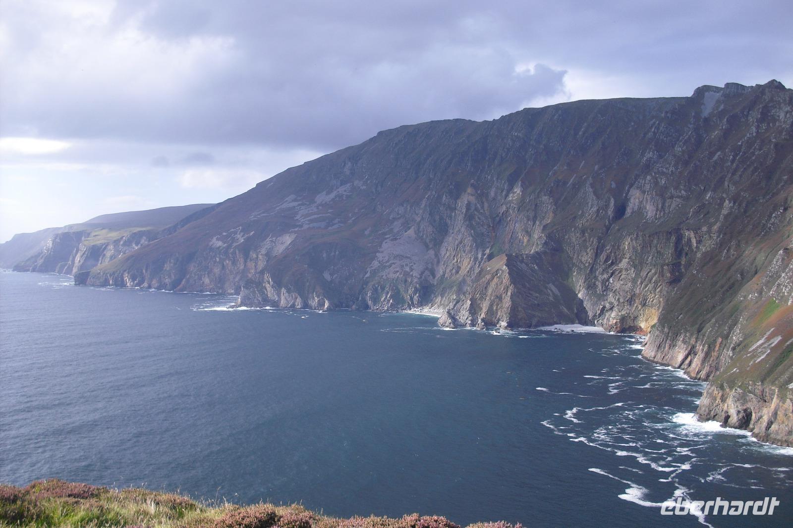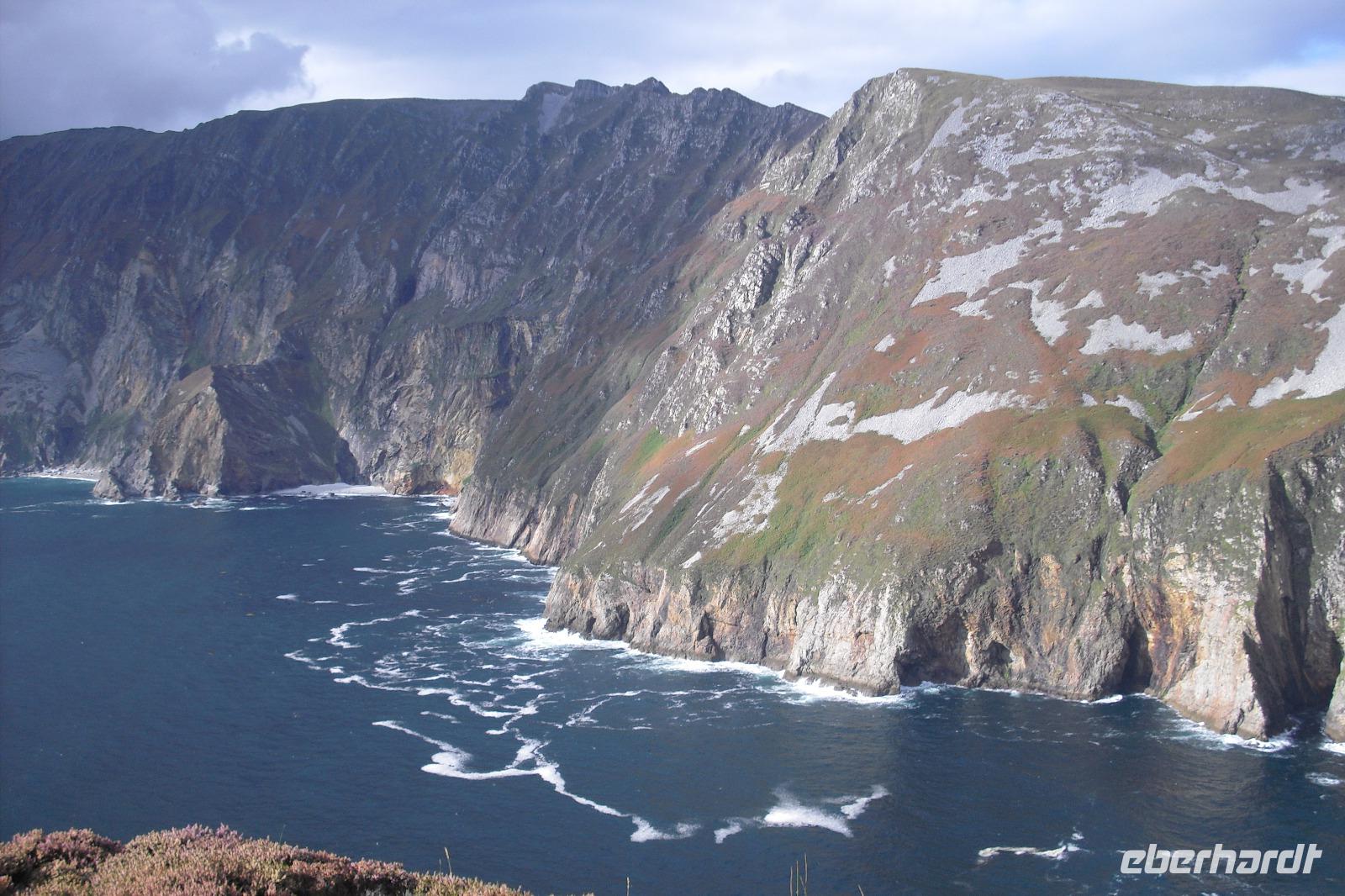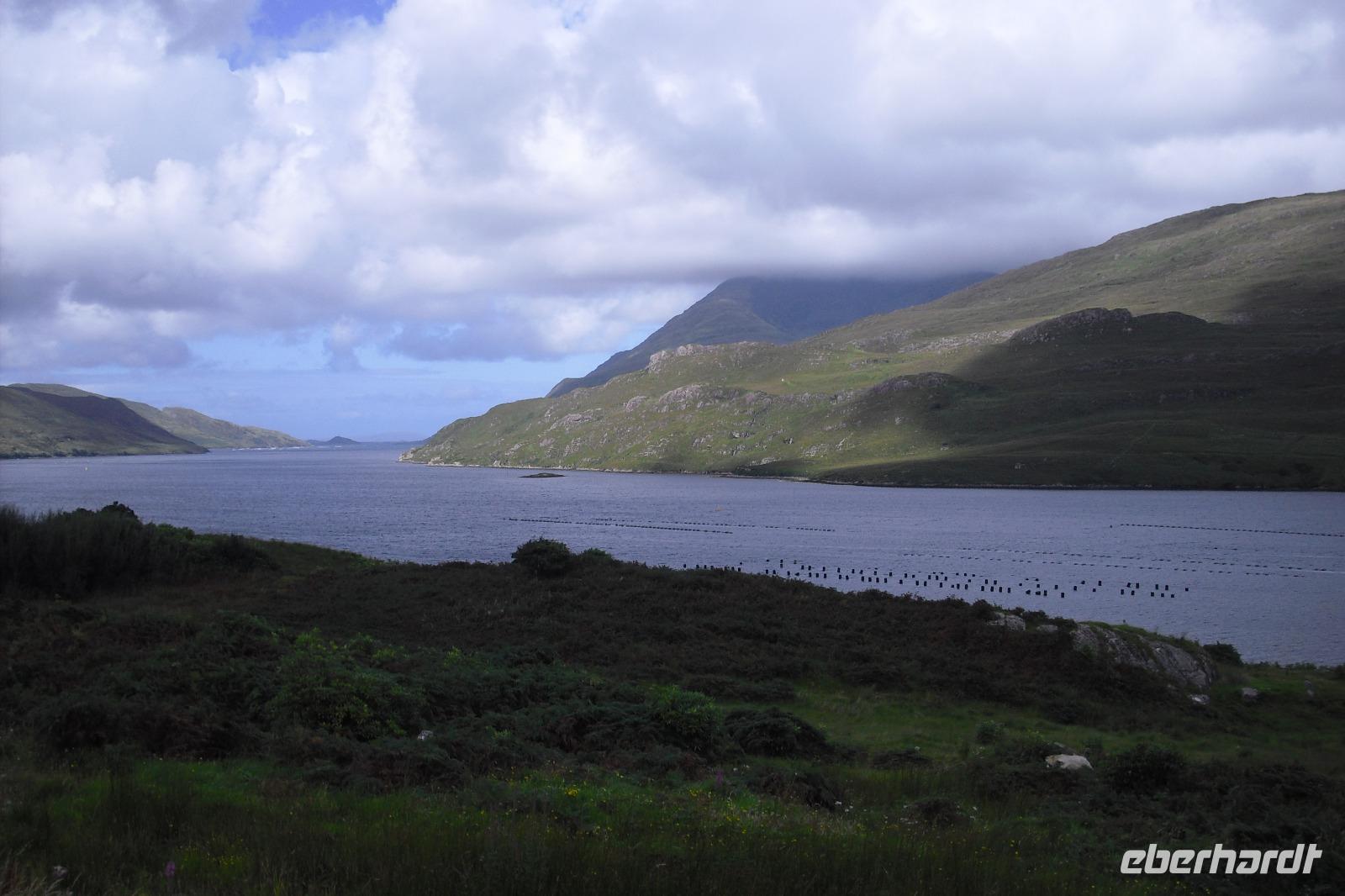 Am heutigen optionalen Ausflug in den Glenveagh Nationalpark, zum Glenveagh Castle und durch die wunderschöne Landschaft Donegals nahmen fast alle Gäste teil und so brachen wir gleich nach unserem Frühstück auf. Ein herrliches Wetter begleitete uns den ganzen Tag. Als erste Aktivität im Nationalpark führte man uns in ein kleines Kino im Besucherzentrum und stellte uns deutschsprachig die Geschichte des abgeschiedenen Tales, die des Schlosses und seiner Gärten sowie die Flora und Fauna der Region in einem kurzen, gut gemachten Film vor. Dann fuhren wir mit einem Minibus bis zum Schloß und hatten eine Führung. In vielen der Räume sahen wir noch das Mobiliar des letzten Eigentümers Mr. Mcllhenny. Er übergab 1981 das Schloß und die Gärten an den irischen Staat als Geschenk. Eine wahre Pracht sind die vor mehr als 100 Jahren erstmals entworfenen Gärten. Auch Wanderungen waren möglich und ein großer Teil der Gäste entschied sich beim Rückweg zum Besucherzentrum gegen den Minibus. Mit Fotostopp und einer Tankeinlage für den Bus fuhren wir anschließend zum Atlantik. Es konnte gebadet werden. Beim nächsten Fotostopp am Glengesh-Pass ersang sich unsere Fairy an einem Imbisskiosk einen Kaffee und machte dem Betreiber und uns eine große Freude. Da das Wetter mitspielte bot sich an diesem Tag der Besuch der Slieve League (603 m Höhe) in Donegal an. Es war einfach fantastisch, was uns die Natur und dazu die Musik von Fairy an den Slieve League bot, unglaublich ! Nach diesem wunderschönen Aufenthalt fuhren wir zum Abendessen in die Sleave League Lodge nach Carrick, wo im Anschluß noch Musik von Fairy geboten wurde. Und wie wir alle mitmachten, großartig. Aber auch dieser schöne Tag mußte mal ein Ende haben, deshalb fuhren wir mit unserem Bus zurück zum Hotel in Letterkenny. Einige hatten noch nicht genug und landeten nochmals im Pub des Vorabends.