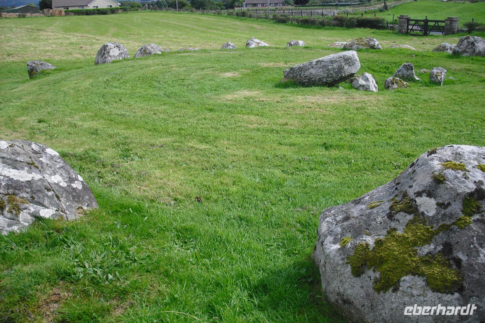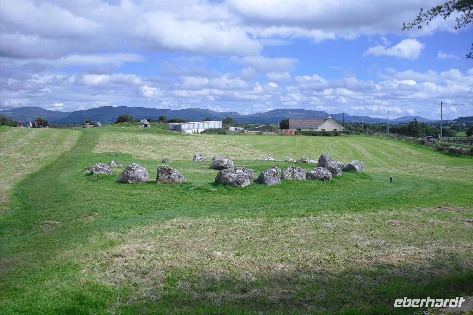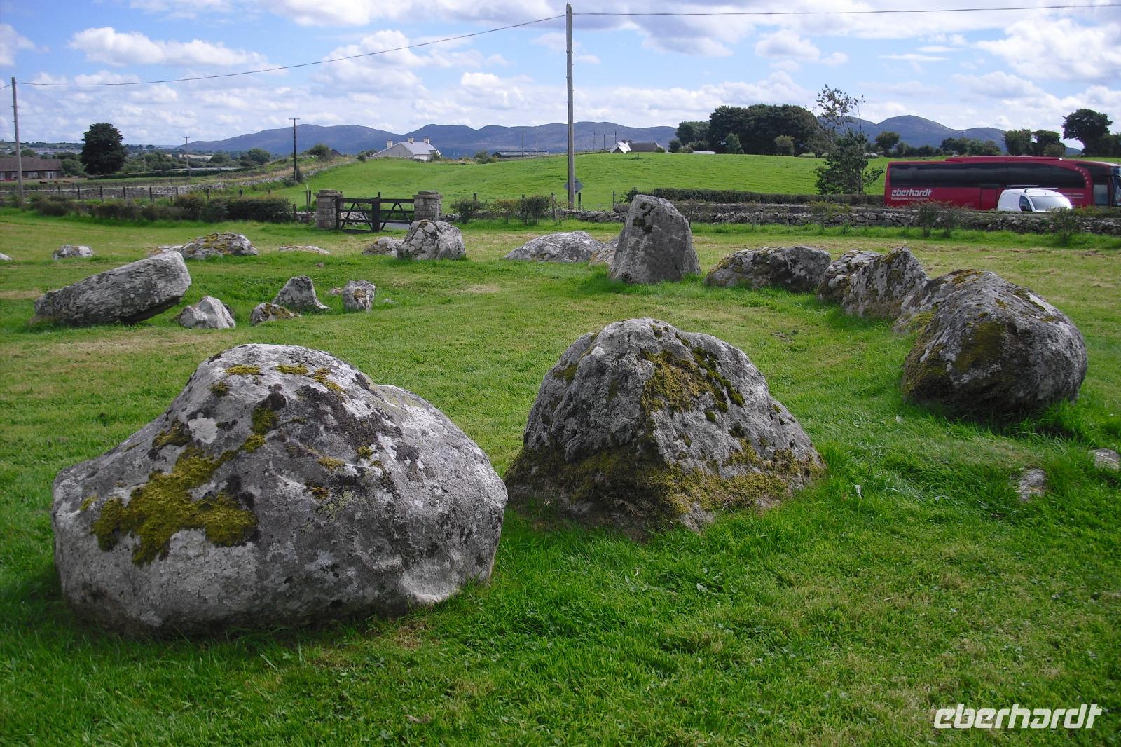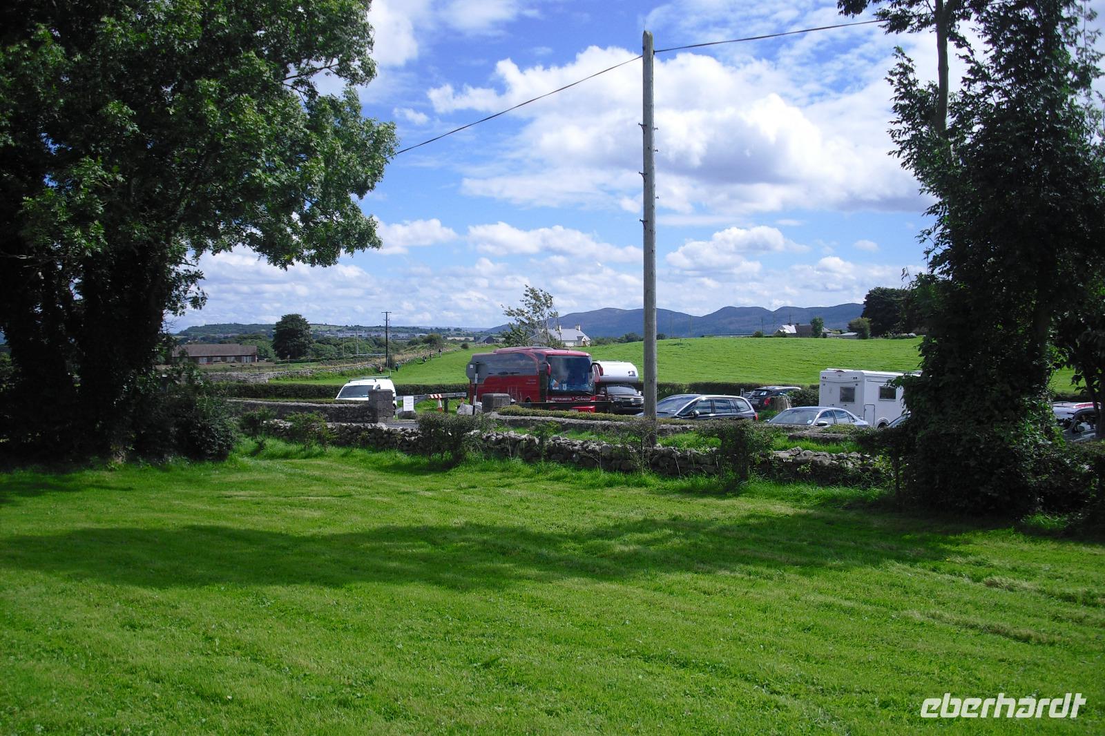 Erneut brach wettermäßig und auch sonst ein herrlicher Tag an, zunächst mit dem Frühstück und dann die Abfahrt nach Donegal. Hier machten wir eine Pause, besorgten dieses oder jenes - z.B.Briefmarken. Die kleine farbenfrohe Ortschaft am Eske River war einst Stammsitz des O´Donnell Clans und noch heute kann das Castle besichtigt werden. Die Burg wurde um 1474 gebaut, Teile im Laufe der Jahrhunderte zerstört oder umgebaut. Lediglich ein kleiner Turm am Westende ist noch Teil der alten Burg. Imposant auch die Ruinen einer alten Abtei. Hier schrieben Mönche 1632-1636 die berühmten "Annals of the Four Masters", eine Geschichte der Welt bis zum Jahr 1616. Unsere Kenntnisse über das alte Irland verdanken wir diesen Aufzeichnungen. Vorbei am Grab von W.B. Yeats in Drumcliff unter dem Ben Bulben fuhren wir nun durch Sligo zu den megalithischen Gräbern von Carrowmore. Dieser Friedhof gehört zu 4 großen irischen Friedhöfen der sogenannten Ganggrab-Tradition. Die anderen sind das Boyne Valley Centre, Loughcrew und Dowth. Heute findet man in Carrowmore ungefähr 30 Gräber in unterschiedlichem Zustand. Viele wurden im Laufe der Zeit dadurch zerstört, daß man sie als Steinbruch benutzte. Es gibt heute drei Haupttypen von Gräbern - Dolmen, kleinere Ganggräber und Steinkreise mit zentralen Grabkammern. Wir nahmen uns angemessen Zeit, um die historische Bedeutung des Friedhofes einordnen zu können.