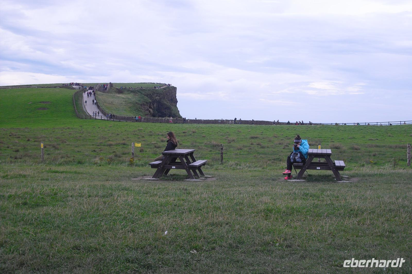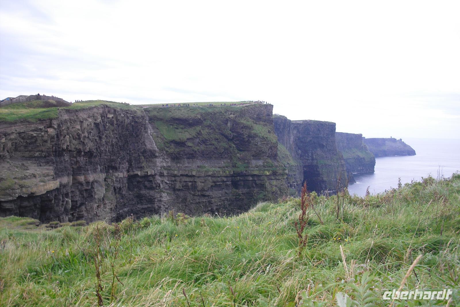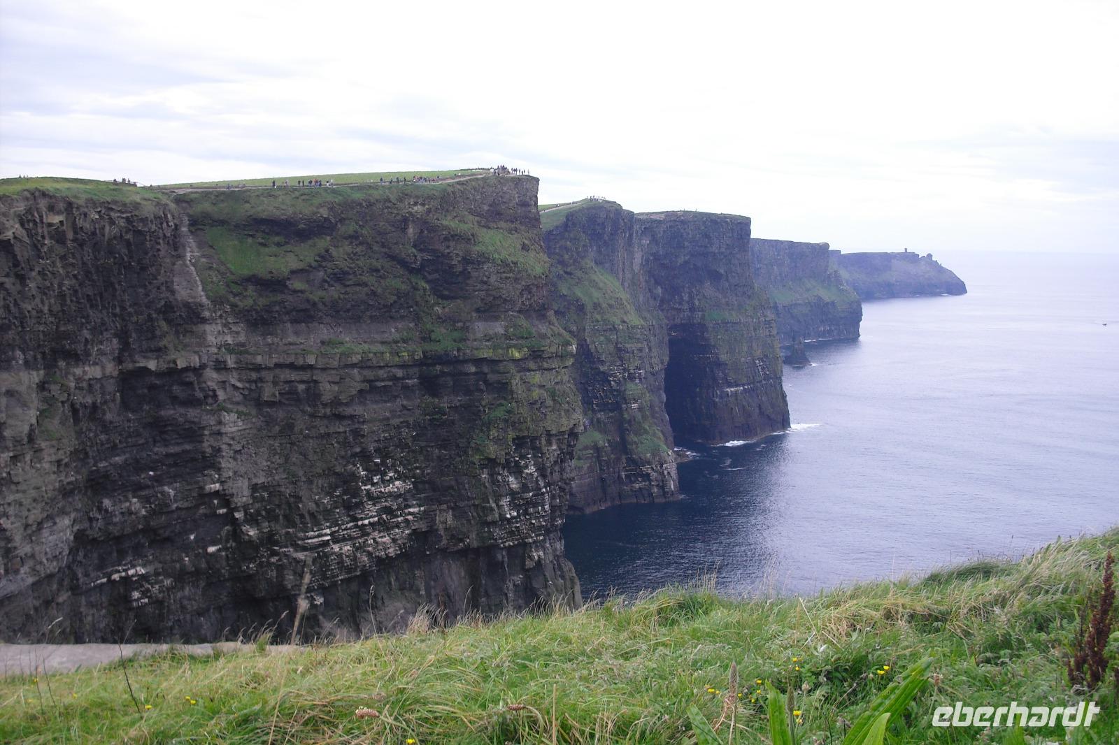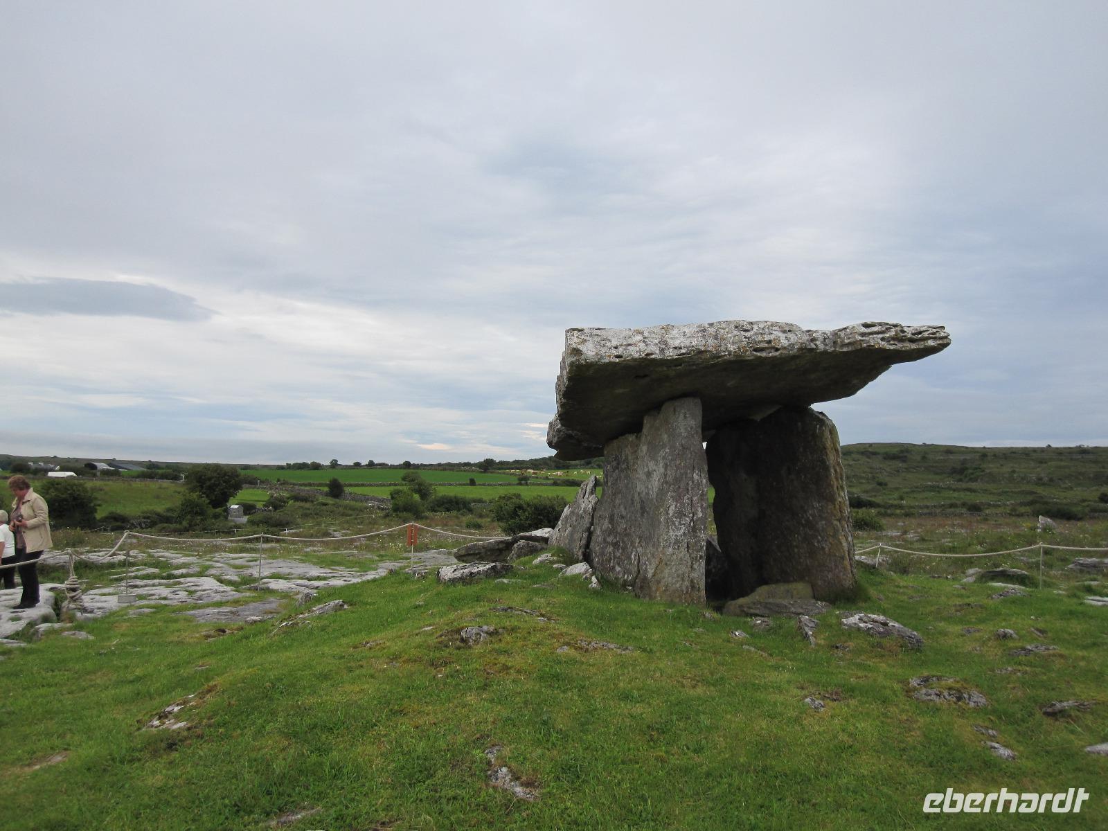 Als erstes bekamen wir unser letztes Frühstück im Lady Gregory Hotel. Heute am Vormittag wollten wir die steinreichste Gegend von Irland kennenlernen - The Burren (gael.großer Stein). Das ist eine weitläufige Kalksteinlandschaft, in die sich in den vergangenen Jahrhunderten Wege eingegraben haben und auf der durch Erosion bizarre Gesteinsbilder entstanden. Der Burren war in der Frühgeschichte Irlands bewohnt, woran Dolmen und Ringforts erinnern. Wir besuchten den Poulnabrone Dolmen. In dieser Region existiert auch eine einzigartige Flora, das ist aber ein Thema für eine mögliche weitere Reise nach Irland. Unter dem Slieva Elva, der höchsten Erhebung des Burren zieht sich auch ein riesiges Höhlensystem entlang. Teile sind der Öffentlichkeit zugänglich. Über Kilfenora und durch Lisdoornvarna fahrend erreichten wir zur Mittagszeit den Höhepunkt jeder Irlandreise - The Cliffs of Moher. Über ca. 8 km Länge und über 200 m hoch erstrecken sich die Klippen über dem Atlantik. Wir nahmen uns angemessen Zeit, dieses weitere Naturschauspiel zu genießen.