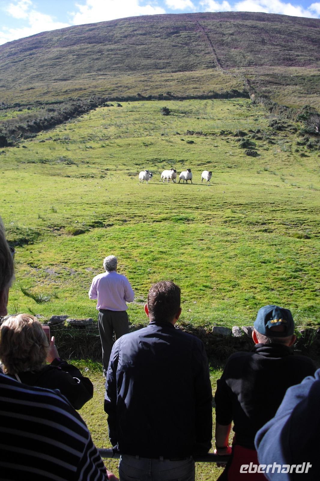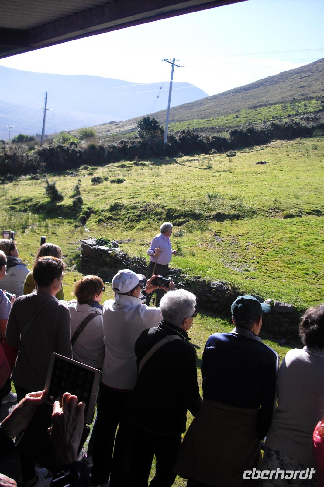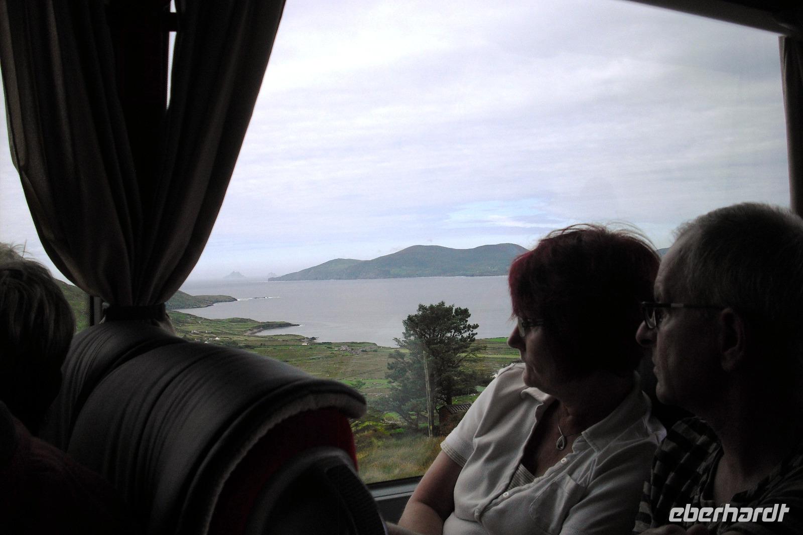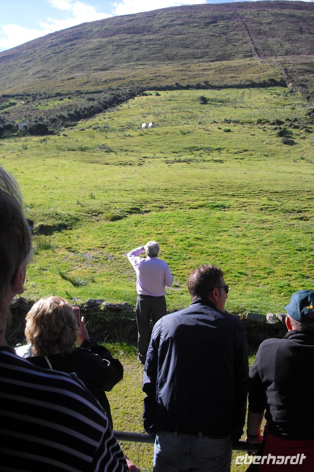 Zunächst, wie an jedem anderen Tag auch, unser Frühstück im Hotel. Wir starteten nach Killarney um Kathrin zu treffen, die Reiseleiterin für die Tagestour. Sie war und ist sehr kompetent mit ihren Aussagen und zeigte uns die schönsten Flecken, bei schönstem Wetter und bester Stimmung. Zur Stimmung trug, wie auch immer wieder an den Vortagen, unsere Fairy natürlich auch bei. Wir besuchten eine Schafsvorführung, wir erlebten in Waterville noch ein wenig vom Chaplin-Festival, wir bekamen unser Mittagessen mit Panoramablick, wir verweilten in Castle Cove am Strand mit Musik und (mindestens) Delfinen, wir konnten in Sneem ein leckeres Eis schlecken, wir genossen bei Musik und schönem Wetter den Blick auf die Muckross Seen vom Ladie´s View, wir bummelten durch die Gärten von Muckross House und beendeten die Tour mit einem Panoramablick auf die Macgillycuddy´s Reeks. Was bitte noch mehr? Das wäre nicht auszuhalten! Im Hotel angekommen erhielten wir wieder zügig das Abendessen und anschließend verzauberte uns Fairy mit ihrer Stimme und ihrem Instrument im Princess Room unseres Hotel. Selbst österreichische Touristen lauschten gebannt. Was für ein toller Tag - unglaublich.
