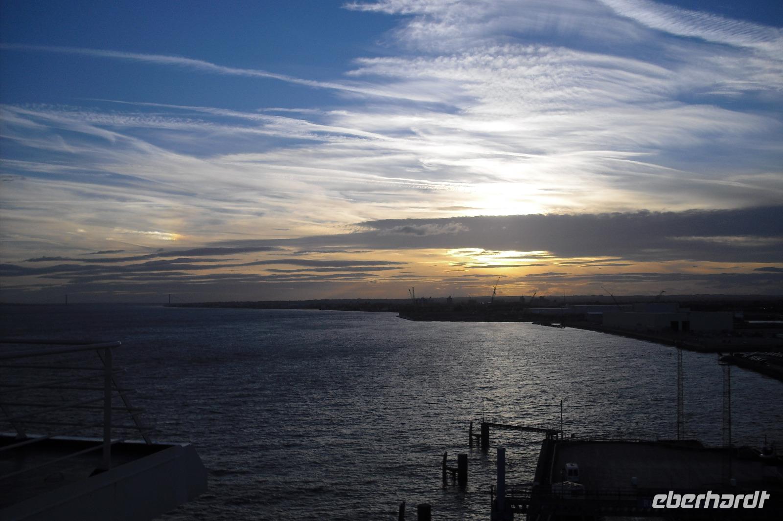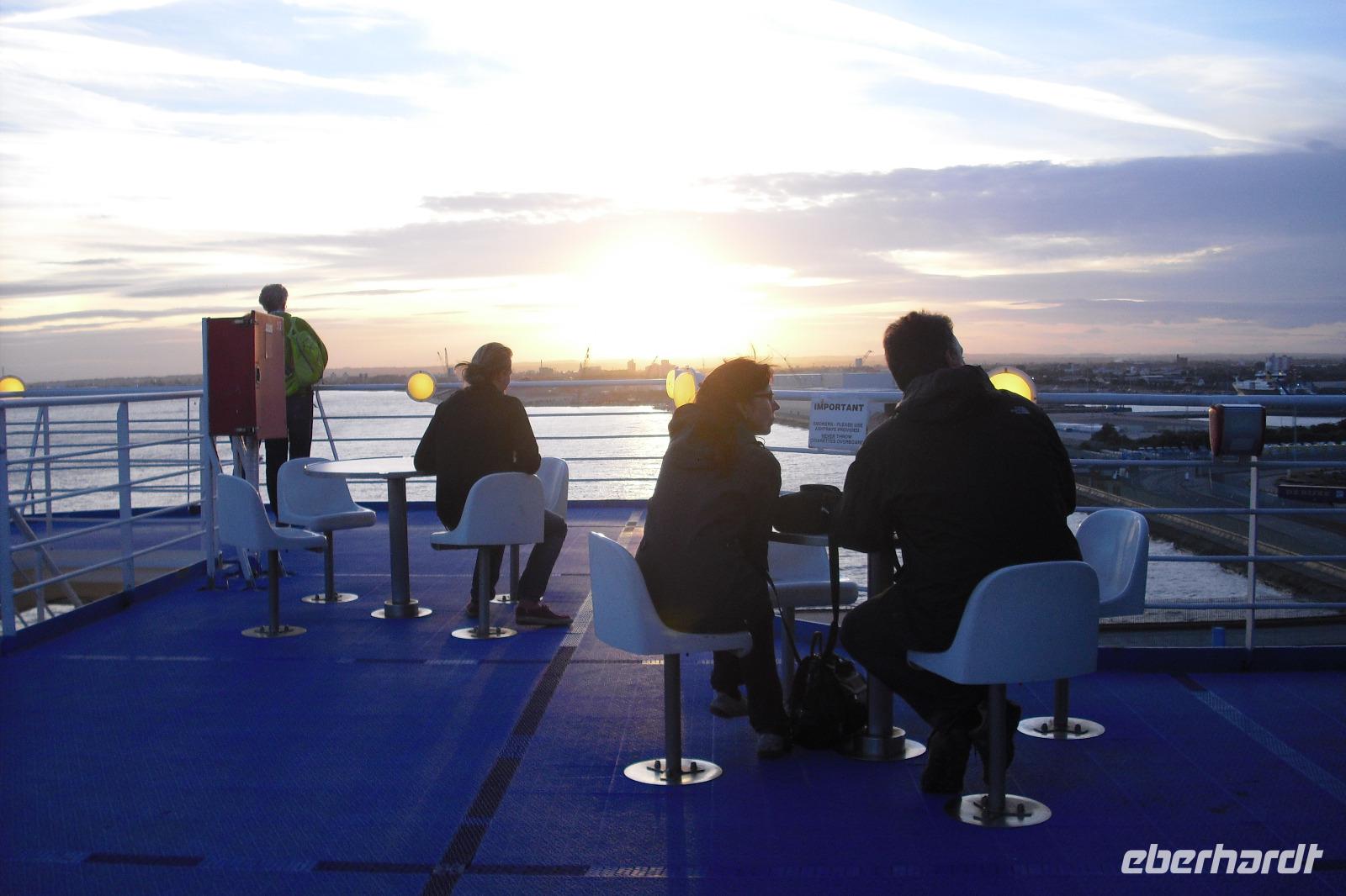 Eine ruhige Fährpassage brachte uns planmäßig nach Holyhead in Nordwales und hier in Nordwales, genauer in Caernarfon, machten wir noch einmal eine schöne längere Pause. Hier, wo 1969 Prinz Charles als Fürst von Wales eingesetzt wurde(als 21.Prince of Wales seit 1301). Wir bummelten durch die Gassen, machten noch einige Fotos, kauften noch ein wenig ein und hörten später, daß es bei Eberhardt Travel eine Wales-Reise im Angebot gibt, die sich lohnt zu buchen. Um unsere Fähre in Hull zu erreichen, machten wir uns nun in die Spur. Mit einer nochmals eingelegten Servicepause erreichten wir den Fährhafen, gingen nach der Kontrolle an Bord der Pride of Rotterdam, fanden die Kabinen und konnten Abendessen gehen oder auch auf dem Außendeck einen herrlichen Sonnenuntergang erleben. Für einige Gäste wurde es nach unglaublich intensiven Eindrücken in Irland eine kurze Nacht auf der Fähre.