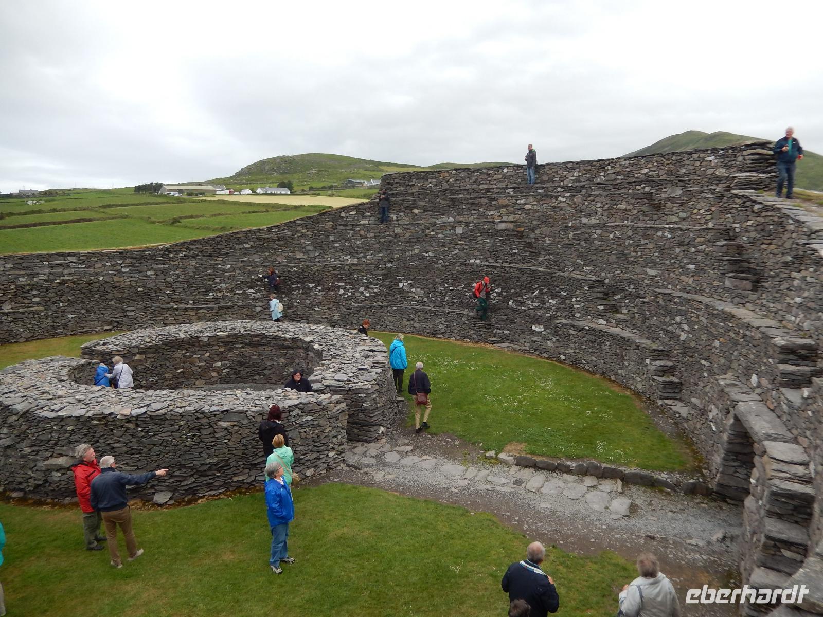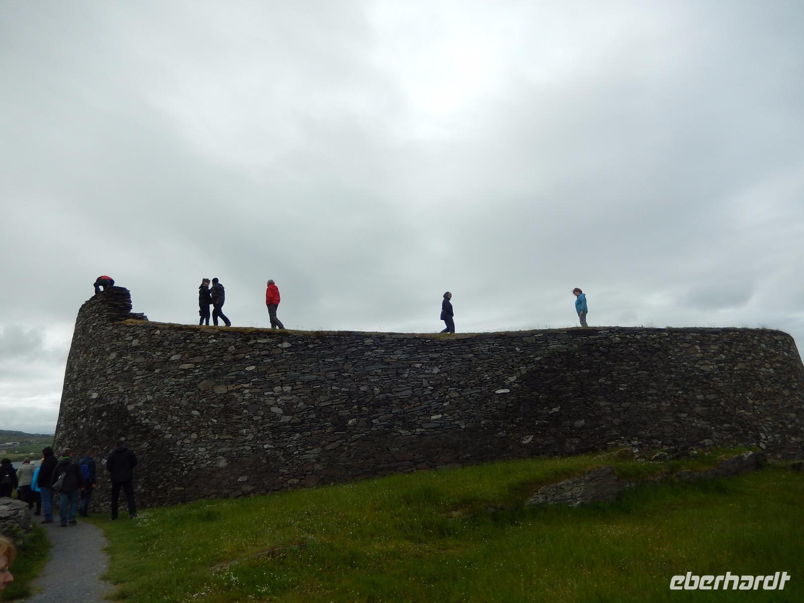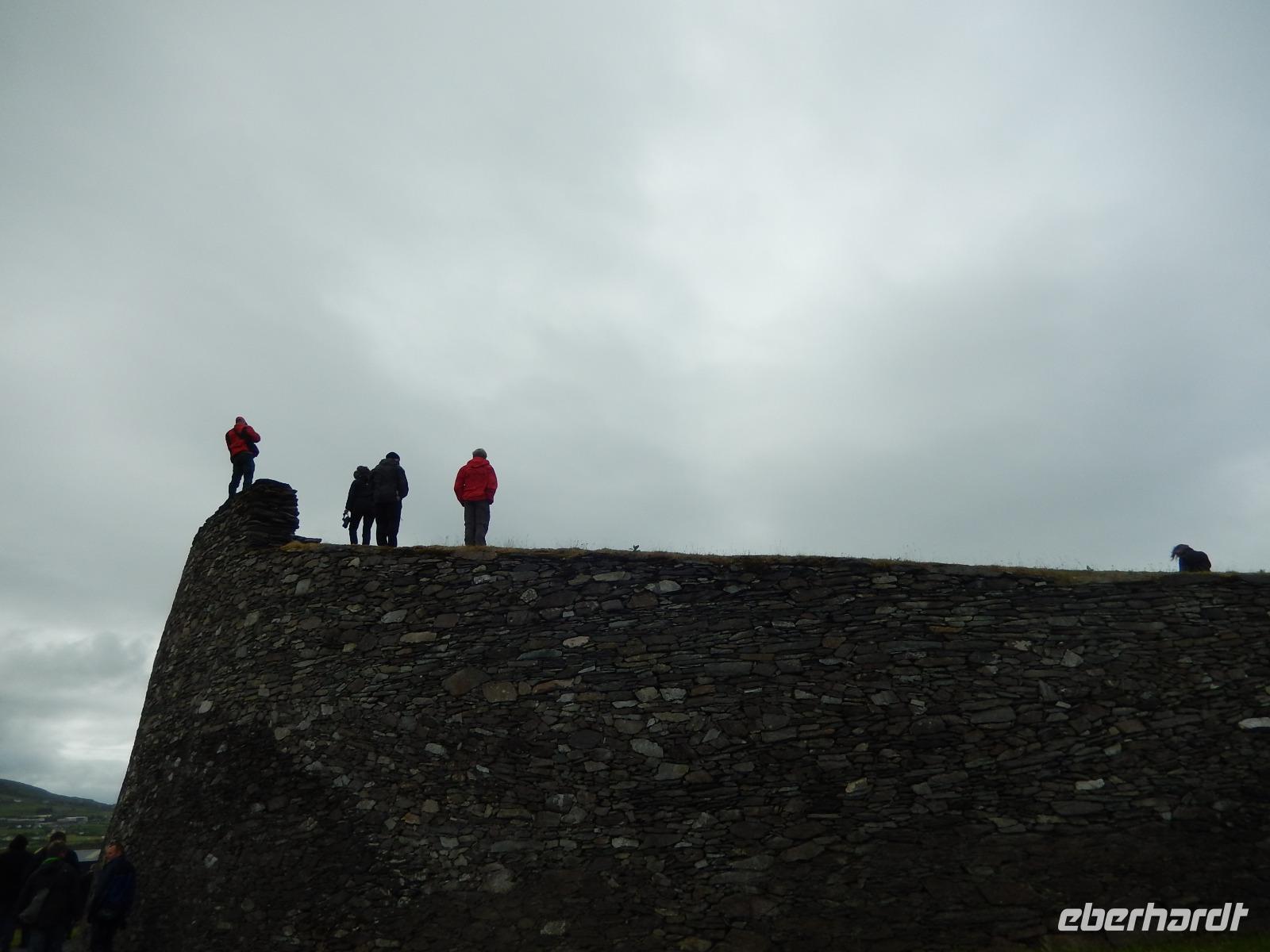 Unter anderem „eroberten" wir mit ihm das Cahergall Stone Fort, ein restauriertes eisenzeitliches Ringfort. Einige wagten sich für ein gutes Fotomotiv bis hinauf auf die 4m hohen Mauern. Jan hatte uns mit diesem Fort einen beeindruckenden Moment irischer Geschichte in wundervoller Landschaft und in völliger Einsamkeit ausgewählt- dafür sind wir ihm alle sehr dankbar, denn diese Attribute machen für die meisten von uns Irlands besonderen Reiz aus.