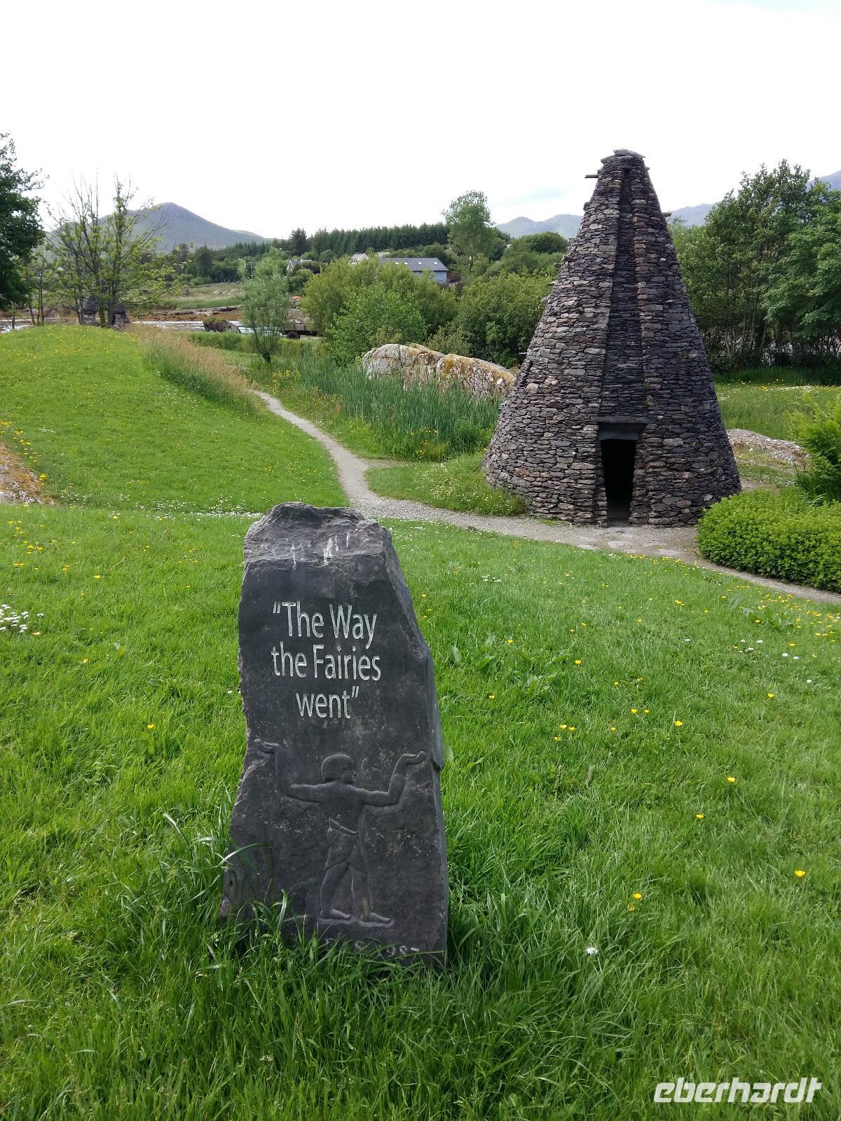 Im Folk Park finden sich viele historische Wohnstätten der Iren mit der jeweils typischen Inneneinrichtung; so konnten wir eintauchen in das ursprüngliche Leben der Menschen. Der Geruch von Torffeuer, das früher in jeder Behausung brannte, lag über dem Folk Park. Hühner und anderes Getier liefen frei herum oder war in Gattern, umspannt von Flechtwerk, untergebracht. Im Feendorf kann man sich in eine bienenkorbartige Feenbehausung begeben und dort- so die Sage- alle schweren Gedanken bei den guten Feen lassen. Eine historische Einkaufsstraße lädt mit liebevoll eingerichteten Geschäften zum Bummeln ein, hübsche Lokale verführen zur Einkehr. Vieles gibt es im Folk Park zu entdecken- jeder nahm seinen eigenen Weg und am Ende trafen sich alle voller neuer Eindrücke wieder am Bus.