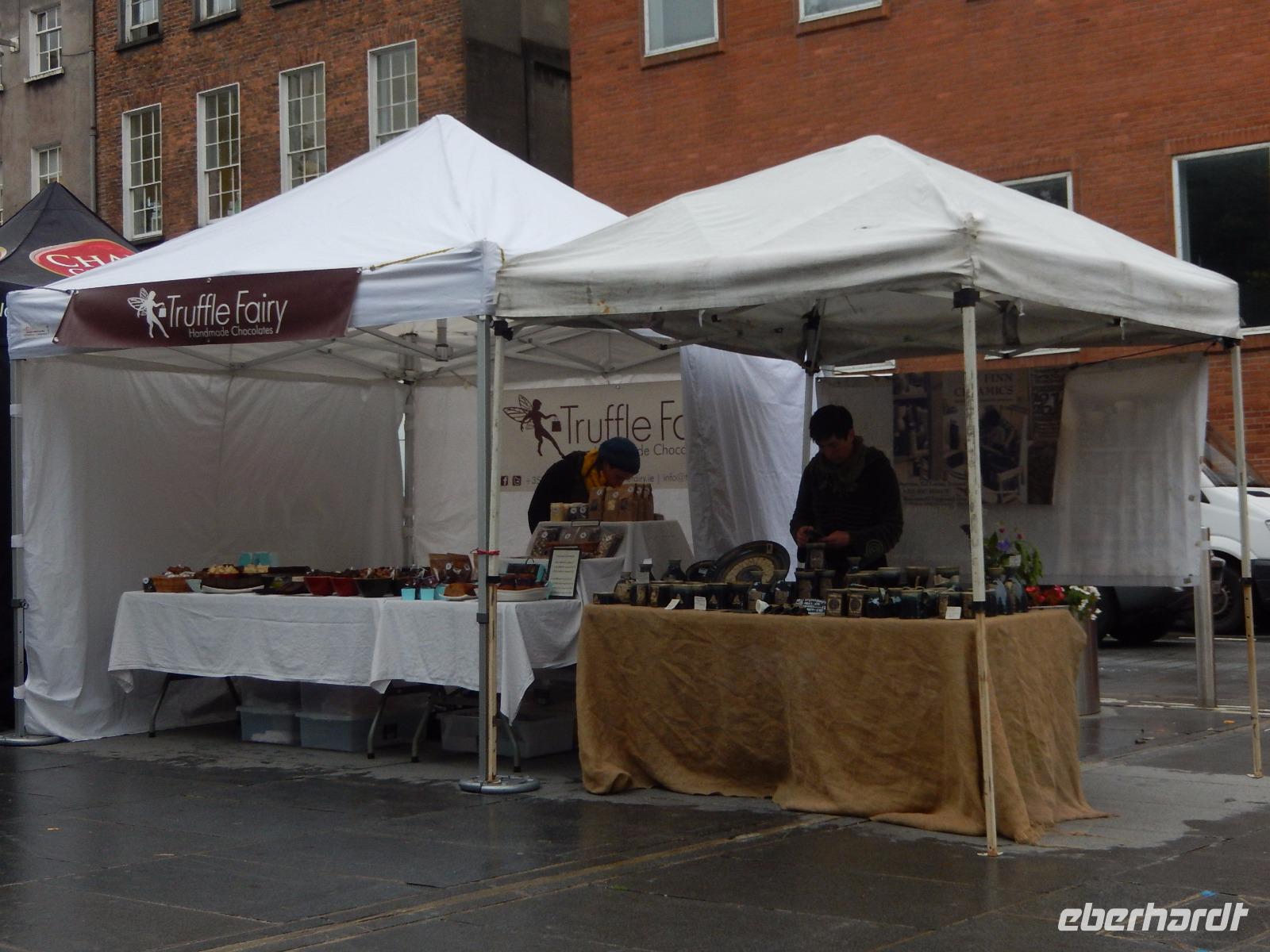 Doch erst einmal blieb in Kilkenny, dessen herrlichen mittelalterlichen Stadtkern samt Castle wir sogleich bewunderten, etwas Zeit. Manch einer schaute sich auf dem kleinen Markt unterhalb des Castles um- dort gab es viel zu entdecken, zu bestaunen und zu probieren: da war ein Stand mit Frischfisch und Meeresfrüchten (man hätte sofort einen Grill aufbauen wollen), eine Trüffelfee verkaufte süße Delikatessen, frisches Brot in allen Varianten gab es, frische Milch (die schmeckte, wie wir es sonst nur in alten Büchern nachlesen können), selbstgemachte Pasteten (Pies) in allen Variationen, handgetöpferte Tassen (gekauft, damit man sich beim Morgenkaffee an die schöne Zeit in Irland erinnern kann- da beginnt der Tag doch gleich mit besten Erinnerungen)...... und wer sich dort etwas Zeit nahm, mit echtem Interesse, der bekam von allen Ständen Kostproben gebracht, weil die Freude der Iren über Sympathie für ihre Lebensart, und ihr Stolz auf ihre Produkte so groß sind, dass sie einen einfach teilhaben lassen, uns ihr Irland riechen, schmecken, mit allen Sinnen erleben lassen wollen. So bot der Markt auch die unerwartete Möglichkeit zu erleben, wie offen und freundlich die Iren auf ihre Besucher zugehen, das Gespräch suchen, teilen und sich mitteilen.