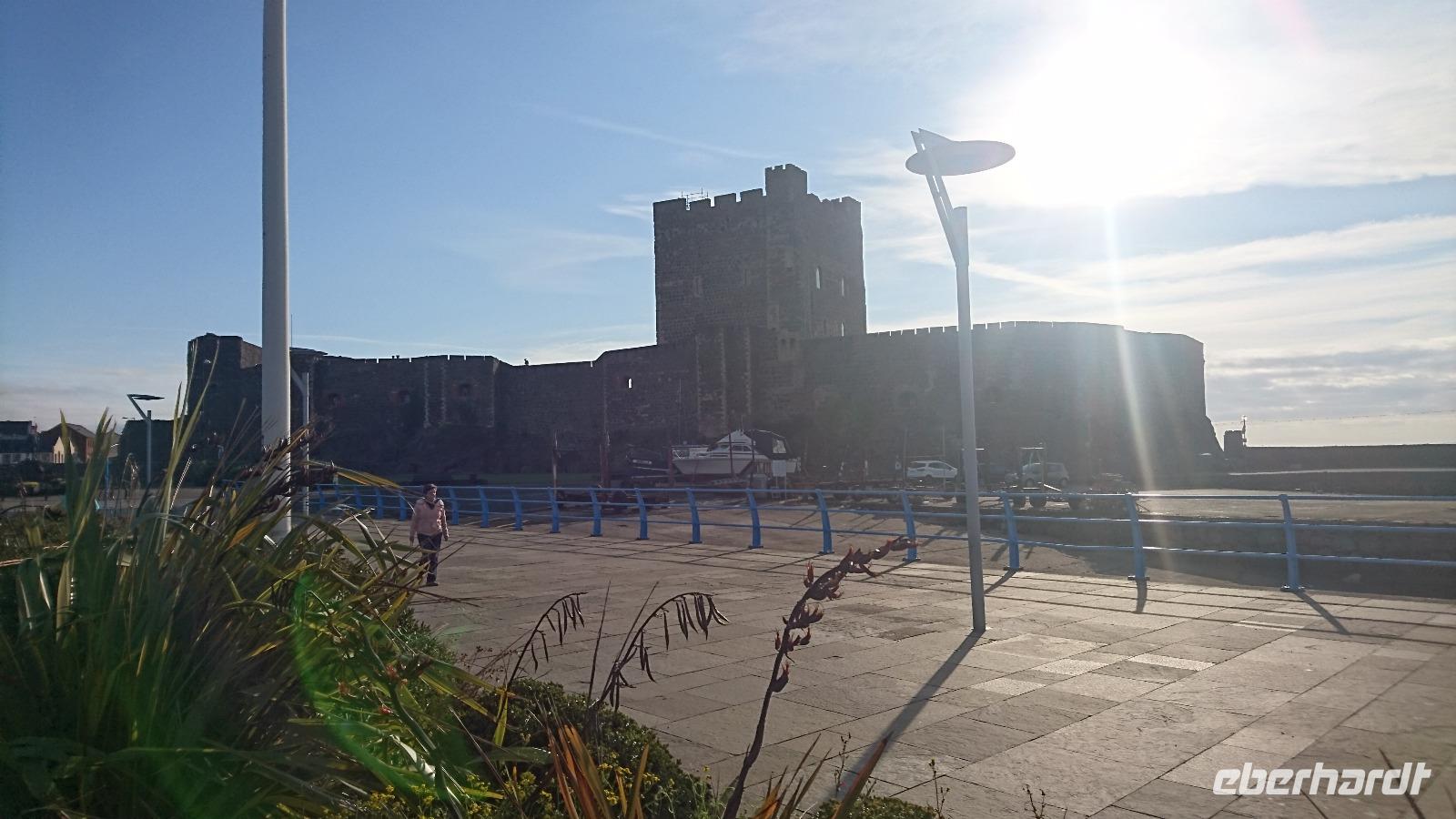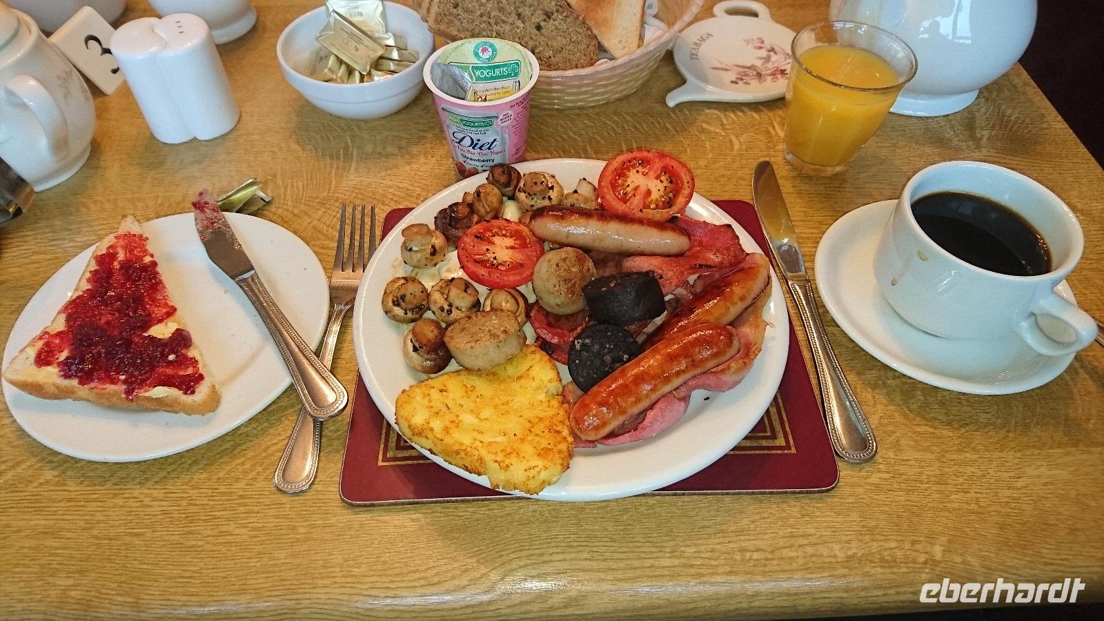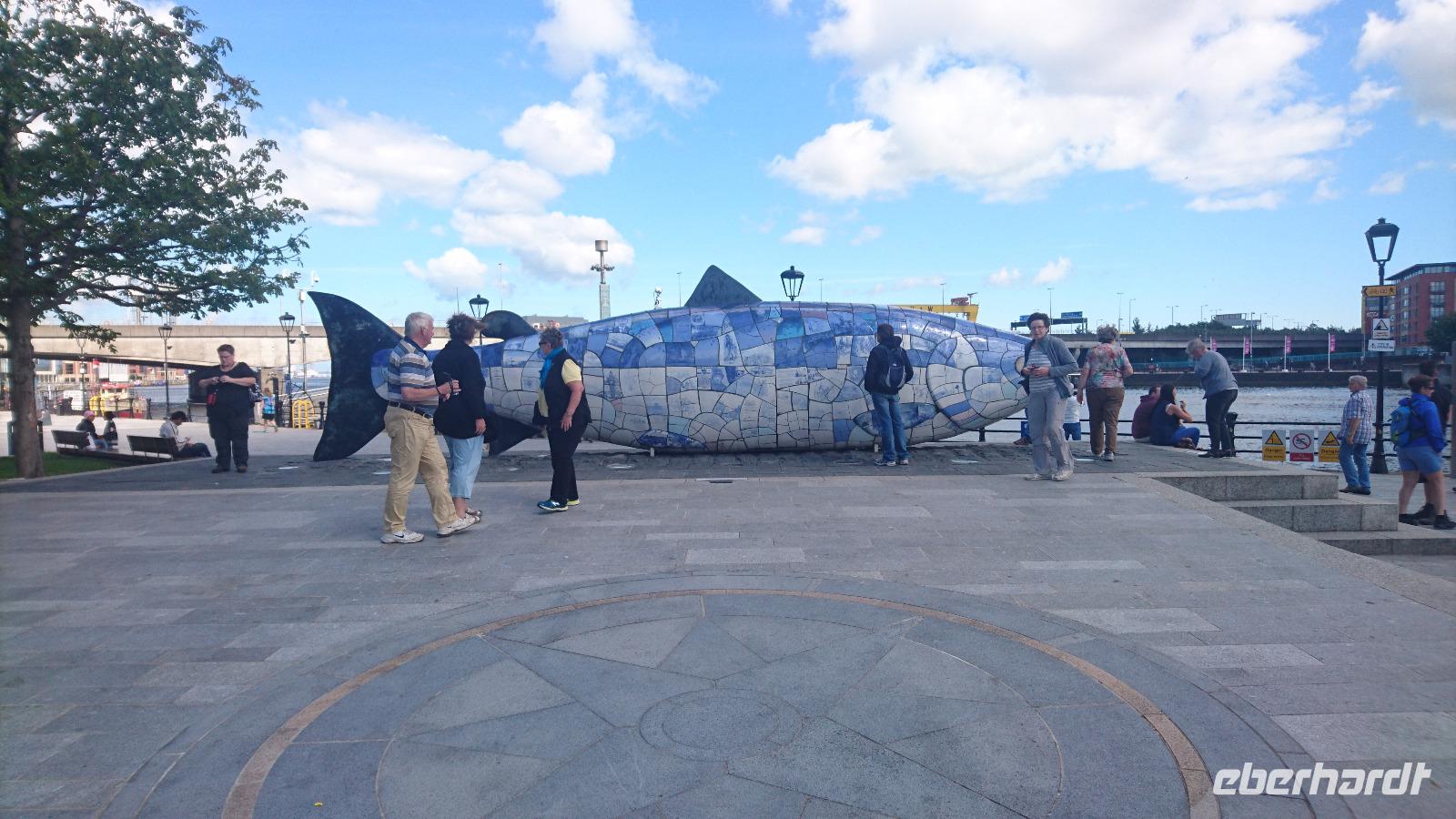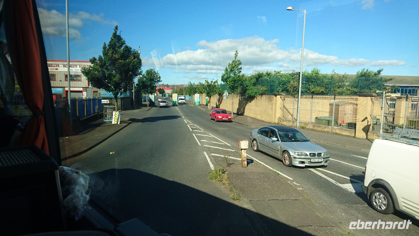 Freundlich, aber laut wurden wir durch eine Lautsprecherdurchsage am Morgen in unseren Kabinen geweckt. Das Frühstück war also zubereitet und wir würden pünktlich in Kingston upon Hull anlegen. Somit stand unserer Weiterreise quer durchs aktuelle Brexit-Land wohl nichts im Wege. Stefan sammelte uns später in der Showbar und weitestgehend gemeinsam gingen wir von Bord, erlebten eine einfache, aber genaue Passkontrolle an der Britischen Grenze und trafen kurz darauf auf unseren bereits ausgeschifften Bus vor dem Terminal. Hier lauschten wir der Nationalhymne des Vereinigten Königreiches, sahen die Union Jack und die Flagge von England und erlebten, wie Jürg unseren großen, neuen, blauen Bus nicht nur die ersten Meter auf der linken Straßenseite, sondern auch sicher durch die Kreisverkehre im Hafengebiet von Hull lenkte. Dann ging es immer nach Westen, vorbei an der ein wenig San-Francisco-Feeling verbreitenden Huber Bridge, gen Leeds, später nach Manchester und südlich von Liverpool gen Chester. Hier lauschten wir erst den Beatles, dann bald der inoffiziellen Walisischen Nationalhymne und sahen die Flagge von Wales. Auf der Küstenstraße von Nordwales boten sich uns bereits schöne Ansichten und bald zum Mittag erreichten wir Holyhead und damit den Fährhafen gen Dublin neben dem Edinburgh Castle. Wieso? Wir waren doch nicht in Schottland, oder? Ein Pub am walisischen Fährhafen trug den Namen der gigantischen Burg in Schottlands Hauptstadt und wir lachten herzlich über dieses Zusammenspiel, ehe wir samt Bus auf die Ulysses der Irish Ferries rollten, dort in den Passagierräumen einen Platz fanden und später über die Irische See fuhren. Am zeitigen Abend erreichten wir den Hafen von Dublin, hörten die Nationalhymne des Landes, sahen seine Flagge und rollten an der Irischen Hauptstadt vorbei nach Navan. Während dieses Tages flogen unsere Fluggäste bereits nach Irland und im Hotel in Navan trafen wir zum Abendessen erstmals alle zusammen. Doch alle erlebten wir viel an diesem Tag der Reise und gingen bald im einfachen, funktionellen Hotel schlafen.