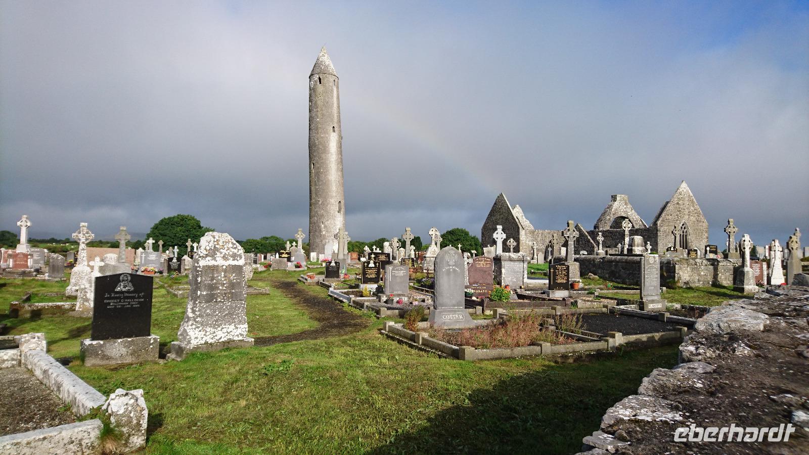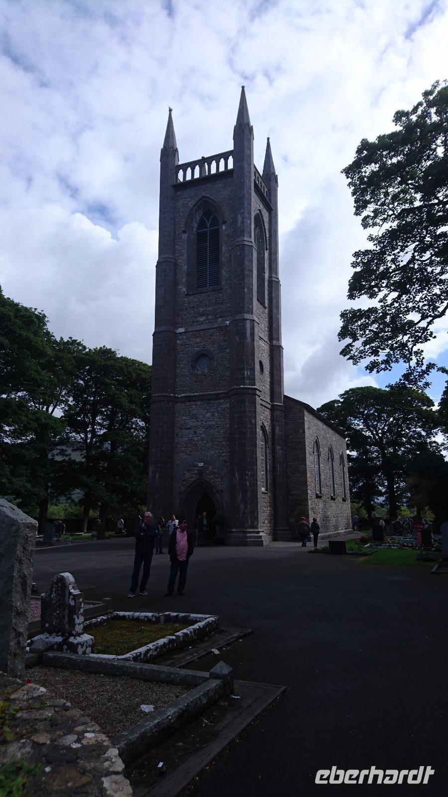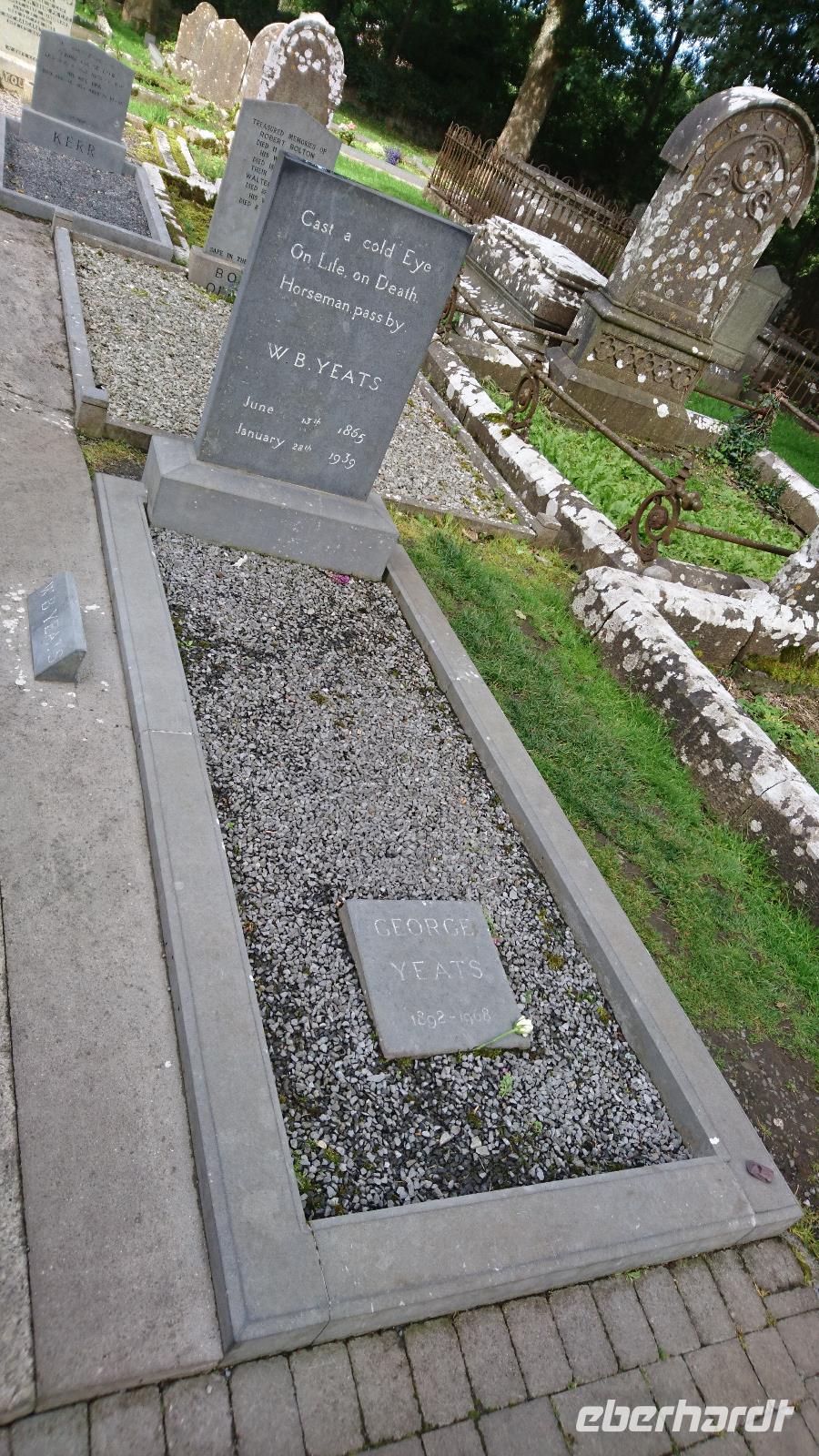 Wild Atlantic Way. WWW sahen wir gestern schon oft am Wege. Nun sollten wir darauf gen Süden fahren. Bei etwas Regen verließen wir Letterkenny und sahen später eine einsame Burg auf einem Felsen stehen. Battenberg, Mountbatten, das sagte uns etwas. Stefan berichtete uns von jenen taten der IRA gegen diese Familie in Irland, aber auch von seinen Erlebnissen 2015, als der Prince of Wales und seine Frau Camilla erstmals seit damals wieder Irland besuchten und seinen Reiseplan gehörig durcheinanderbrachten. Heute geschah so etwas nicht und wir genossen die Aussichten am Mullagmore Head, besuchten den Friedhof in Drumcliff, wo der irische Dichter W.B. Yeats begraben wurde und ein Rundturmfragment angeblich erst zusammenstürzen soll, wenn der klügste Mensch der Welt daran vorbeiginge. Na ja, wir fuhren vorbei, darum stürzte er nicht ein. Das keltische Hochkreuz sahen wir uns hier jedoch trotzdem an. Dann ging es noch viel weiter zurück in der Geschichte. In Carrowmore besichtigten wir Gräber aus dem Megalith-Zeitalter. Stefan führte uns über das Gräberfeld und wusste Vieles aus der aktuellen Erforschung jener Kultur zu berichten, ehe wir nach einem von Jürg und Stefan servierten Carrowmore-Imbiss weiter nach Sligo zu einem kleinen Stadtbummel fuhren. Danach war es vielleicht Zeit, etwas gegen die Sünden zu tun. Der wichtigste Wallfahrtsort Irlands lag an unserer Strecke und wir machten dort Station. Eine Kirche, die bis zu 10.000 Menschen fassen kann, Weihwasser, welches aus Wasserhähnen tropft und eine für uns wichtige riesige Toilettenanlage waren zu besichtigen. All dies entstand, weil es im 19. Jh. Eine von der Katholischen Kirche bestätigte Marienerscheinung in Knock gab und wir wunderten uns schon ein wenig über die Dimensionen. Sogar ein Flughafen entstand unweit von Knock, um die irisch-stämmigen Gläubigen aus aller Welt zu bestimmten kirchlichen Feiertagen zu empfangen. Nun ja, wir kamen mit dem Bus und fuhren bald weiter, an Galway vorbei und in den Coole Park der Lady Gregory, die einst vielen Republikanern Unterschlupf gewährte. Ihr Haus steht nicht mehr, aber Rotwild gibt es noch im sehr schön gestalteten Park. Der legendäre Autograph Tree mit Unterschriften wichtiger Künstler und Persönlichkeiten in seiner Rinde steht im schönen ummauerten Garten des Parks. Wir sahen uns all dies an und fuhren dann weiter nach Gort ins Lady Gregory Hotel. Hier betteten wir uns müde und glücklich über den vergangenen Tag und seine schönen Erlebnisse nach dem Abendessen zur Ruhe.