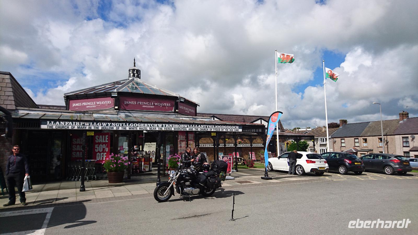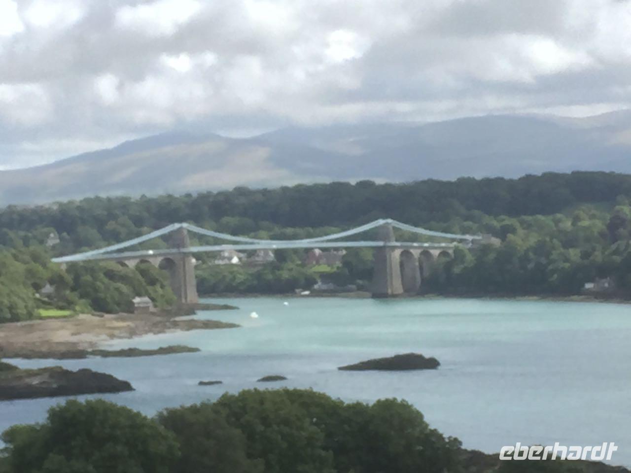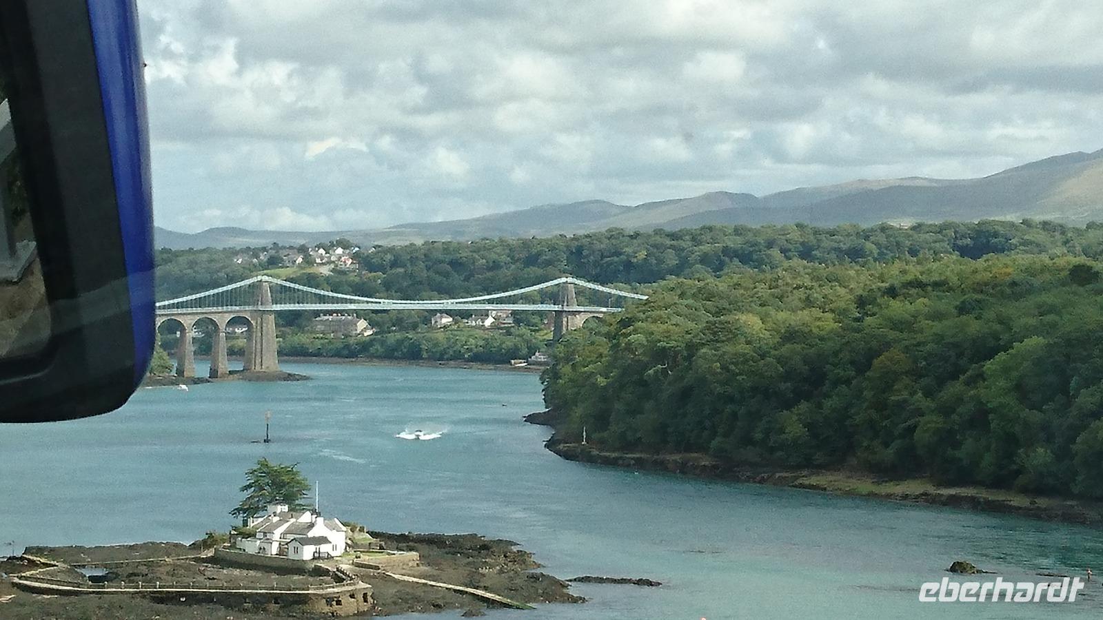 Verabschiedet hatten wir uns alle bereits, denn zeitig am Morgen ging es bereits für die Busgäste, Jürg und Stefan los und gen Dubliner Hafen. Das Hotelpersonal bot uns darum extra noch ein kleines zeitiges Frühstück an und bald schon waren alle Koffer nach Ausstiegen am kommenden Tag in Thüringen und Sachsen sortiert und verladen, rollten wir schließlich in den Hafen und da wieder auf die uns bereits bekannte Ulysses. Als wir später aufs Wasser sahen, erwachte die Sonne richtig und wir fanden so herrliche Spiegelungen in der Irischen See. Zum Mittag erreichten wir Holyhead, fuhren an Land und stoppten im Ort mit dem längsten Namen, in Llanfairpwllgwyngyllgogerychwyrndrobwllllantysiliogogogoch oder dem Ort mit der Marienkirche in einer Mulde weißer Haseln in der Nähe des schnellen Wirbels und der Thysiliokirche bei der roten Höhle. Das kann sich doch kein Nicht-Walise merken! Darum kürzt man den Namen im Allgemeinen mit Llanfair PD ab. Nach einem kleinen Foto- und Shopping-Stopp ging es zur nahen Menai-Bridge. Ein herrlicher Blick zu ihr herüber bot sich uns beim Mittagessen. Später fuhren wir die bereits von der Hinfahrt bekannte Strecke weiter, rollten noch für ein paar Fotos durch die Stadt Conwy und vorbei an deren tollen Castle, später aus Wales heraus nach England und vorbei an Chester, Manchester und Leeds nach Hull. Jürg und Stefan stand der schweiß im Gesicht und sie waren sehr beruhigt, als wir noch vor 19:00 Uhr, dem Check-in-Ende, vor das Terminal der P&O rollten. Überall auf der Strecke hielten uns Freitagsverkehr und Baustellen auf und so verging die Zeit sehr schnell. Bald waren wir an Bord, genossen später Abendessen, Bier, Show und Schlaf in unseren Kabinen und ließen uns durch die bewegte See in Richtung der Niederen Lande schaukeln.