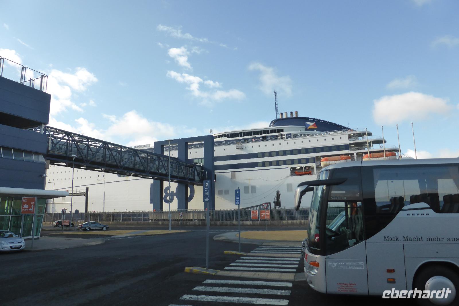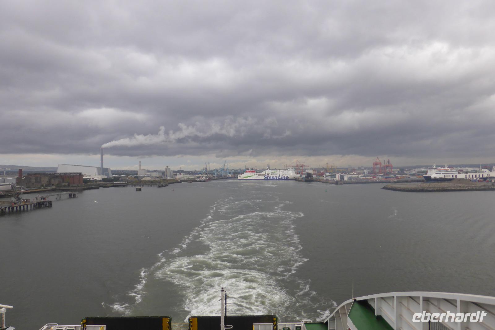 Für alle Gäste, die mit dem Bus nach Deutschland zurückfuhren, hieß es zeitig frühstücken, Koffer laden und gegen 07.00 Uhr Abfahrt zur Fähre, währenddessen unsere Fluggäste länger schlafen konnten. Die Überfahrt mit dem Schiff Ulysses über die Irische See verlief ruhig und dauerte 3,5 Stunden. Auf der Insel Anglesey in Wales angekommen, fuhren wir von Holyhead nach „Llanfair¬pwllgwyngyllgogery¬chwyrn¬drobwll¬llan¬tysilio¬gogo¬goch", einer Ortschaft mit 58 Buchstaben. Dort war Gelegenheit für letzte Souvenirkäufe und zum Mittagessen. Anschließend fuhren wir weiter in Richtung Hull. Unterwegs legten wir noch zwei Pausen an Autobahnraststätten ein und erreichten gegen 18.20 Uhr das Fährterminal in Kingston upon Hull. Nach der Zoll- und Ausweiskontrolle konnten wir an Bord gehen. Mit einem Mal zogen dunkle Wolken am Himmel auf, so dass wir die Ausfahrt des Schiffes auf dem Fluss Humber in Richtung offenes Meeres nur von den Innendecks aus wahrnehmen konnten. Auf dem Sonnendeck war es einfach zu ungemütlich.