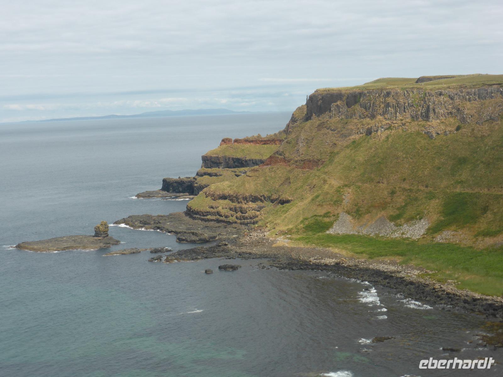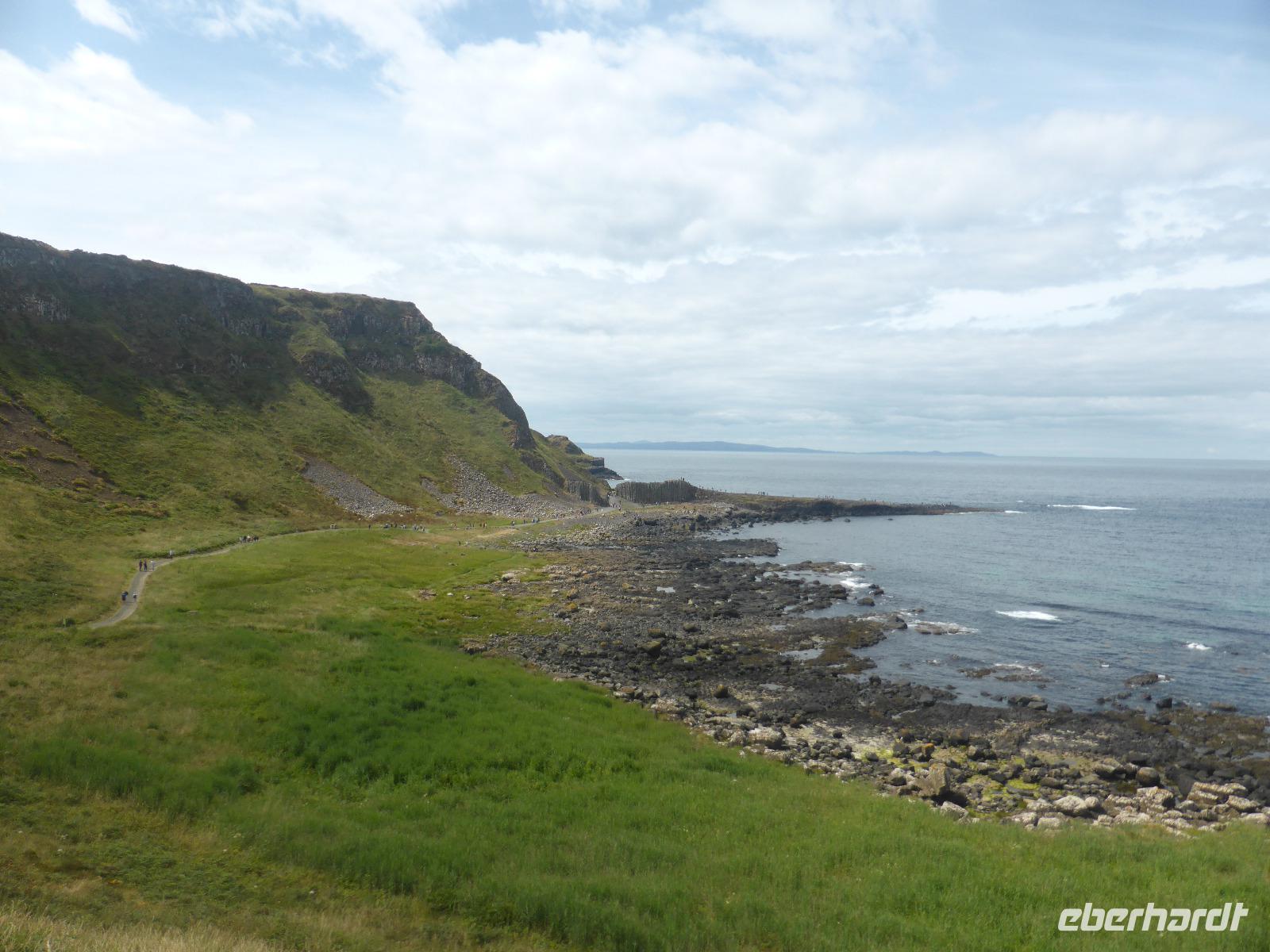 Von Carnlough aus fuhren wir zum Giant's Causeway, dem „Damm des Riesen". Die Legende des irischen Helden Fionn und des schottischen Riesen Benandonner wird im modernen Informationszentrum anhand eines Trickfilmes gezeigt. Unterhalb der Klippen stehen bis zu 40.000 und ca. 60 Millionen Jahre alte, meist sechseckige Basaltsäulen. Wie ein Damm ragen sie aus dem Meer. Wir wanderten oberhalb der Klippen entlang und genossen die fantastische Aussicht.