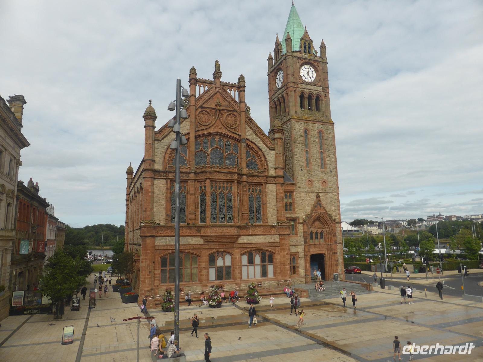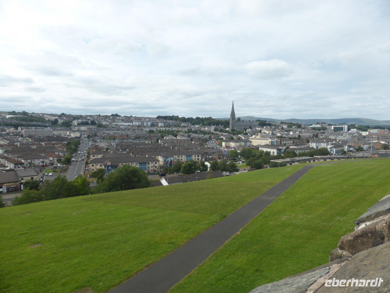 Nach der sich anschließenden Mittagspause im Besucherzentrum fuhren wir weiter nach Londonderry bzw. Derry. Die Stadt steht immer noch als Synonym für die „troubles", die Auseinandersetzungen zwischen Katholiken und Protestanten rund um den „Bloody Sunday", dem „Blutigen Sonntag", an dem am 30.Januar 1972 ein Fallschirmjäger-Regiment der britischen Armee das Feuer auf eine friedlich demonstrierende Menschenmenge eröffnete. Bis zum heutigen Tag sind die Wohnviertel nach Religionszugehörigkeit getrennt. Wir umrundeten auf der eindrucksvollen Stadtmauer das historische Stadtzentrum. Von Derry aus ging es anschließend zu unserem Hotel „Station House" in Letterkenny.