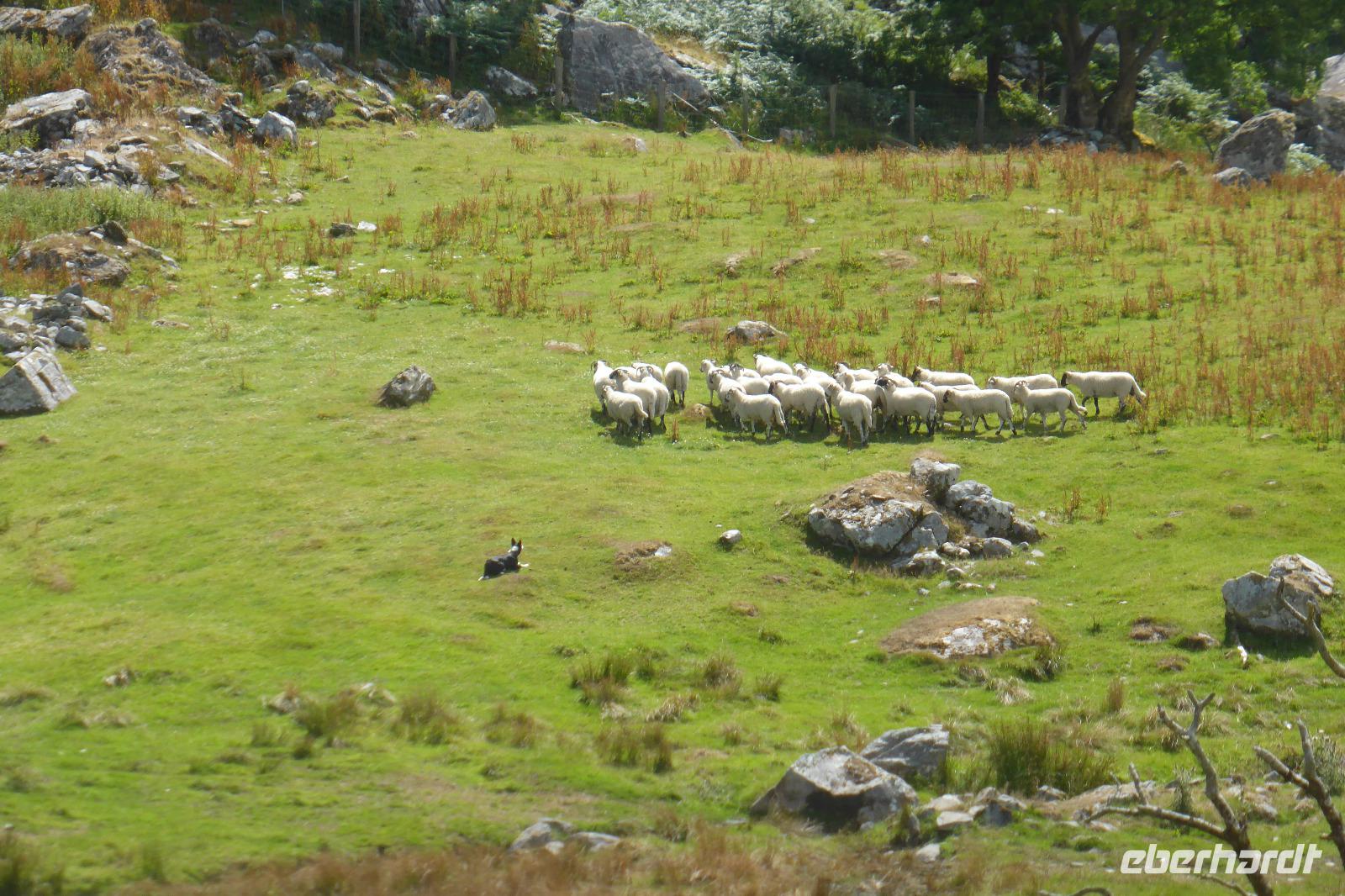 Nach dem Frühstück fuhren wir nach Killarney und begannen den Tag im Killarney Nationalpark mit einem Spaziergang zum Muckross House und zum Muckross Lake. Vom Muckross-Lake spazierten wir an exotischen Baumarten vorbei und endeten am Besucherzentrum. Die Gestalter der Park- und Gartenlandschaft hatten bei der Bepflanzung des Anwesens ein wirklich gutes Gespür. Anschließend starteten wir unsere Rundfahrt auf dem „Ring of Kerry". Nach mehreren Fotostopps am Red Fox Inn-Pub, bei „Paddy the donkey" und an der Dingle Bay kamen wir nach Waterville, wo wir unsere Mittagspause einlegten. Danach ging es hinauf zum Coomakesta Pass auf eine Höhe von 210 m. Wir hatten einen fantastischen Blick auf die Inseln vor dem Kenmare River und auf die Bucht von Waterville. Vom Pass aus fuhren wir entlang der Südseite der Iveragh- Halbinsel nach Molls Gap und von dort zu Kissane's Schaffarm. Dagmar erzählte uns vom Leben der Schafe in den Bergen und Evan führte uns mit seiner Hündin Kate vor, wie die Schafe zweimal im Jahr zusammengetrieben werden. Es ist unglaublich, wie gelehrsam Border-Collies-sind: Innerhalb weniger Minuten hatte Kate die Schafe ins Gatter getrieben, wo sie sich schwer atmend erst einmal von diesem Stress erholen mussten. In der Scheune sahen wir uns anschließend an, wie die Schafe von Hand geschoren und geimpft werden. Nicht alle Tiere scheinen froh darüber zu sein, dass ihnen das Fell abgenommen wird. Die Schluckimpfung gegen den Leberegel hingegen ließen sie regungslos über sich ergehen und es schien sogar, als ob ihnen die verabreichte Medizin schmecken würde. Nach einem weiteren Fotostopp am Aussichtspunkt Ladys View fuhren wir anschließend zu unserem Hotel in Tralee zurück. Am Abend besuchten die meisten von uns im traditionellen Siamsa Tire-Theater die Vorstellung „Fadó Fadó". Die Show übertraf wieder einmal alle Erwartungen! Anhand der Jahreszeiten wurde das Leben in einem irischen Dorf mit Schauspiel, Gesang und Tanz dargestellt.