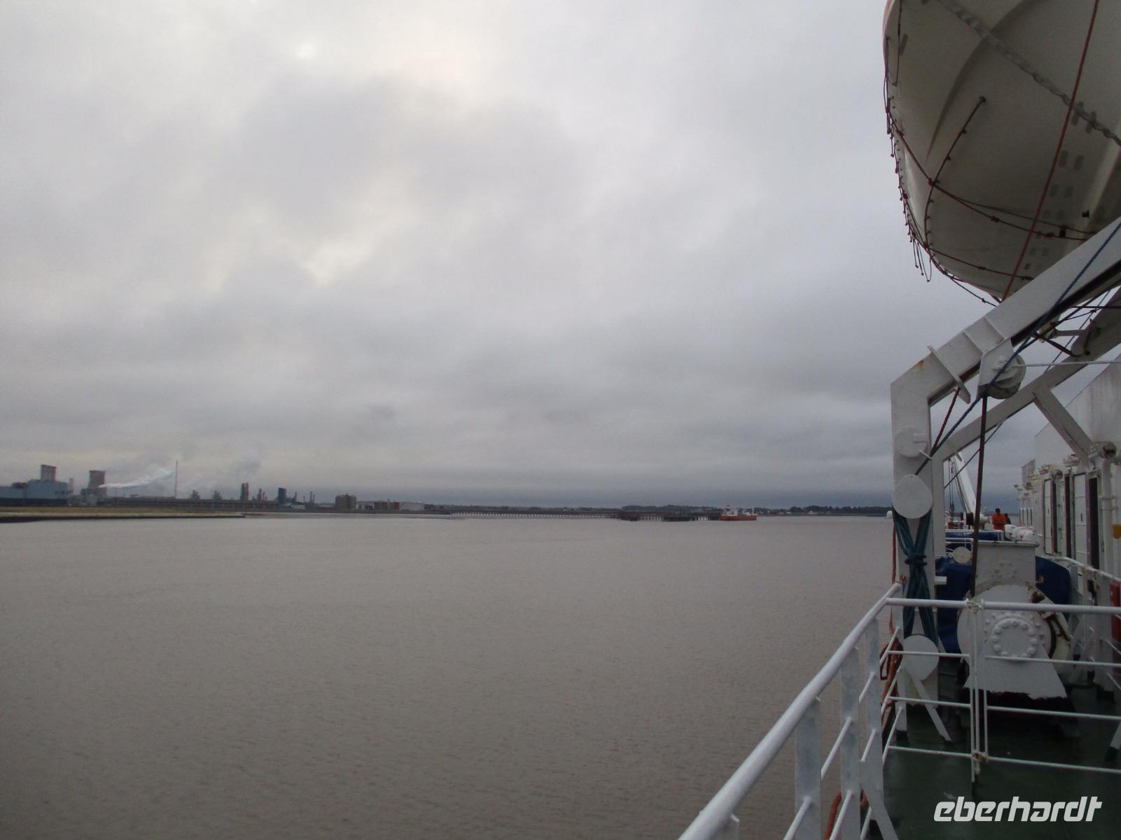 Mit etwas Verspätung verließen wir an diesem Morgen unsere Nachtfähre in Hull. Nachdem wir alle wieder wohlbehalten in unserem Bus saßen, begann unsere Fahrt durch England und Wales, um am frühen Nachmittag unsere Fähre nach Dublin zu erreichen. Glücklicherweise gab es keinerlei Verkehrsbehinderungen, so dass wir gerade noch pünktlich den Fährhafen in Holyhead auf der walisischen Insel Anglesey erreichten. Wir fuhren mit unserem Bus in ein Parkdeck des Schiffes, stiegen dort aus und verbrachten die Zeit der Überfahrt in den Besucherdecks der Fähre.