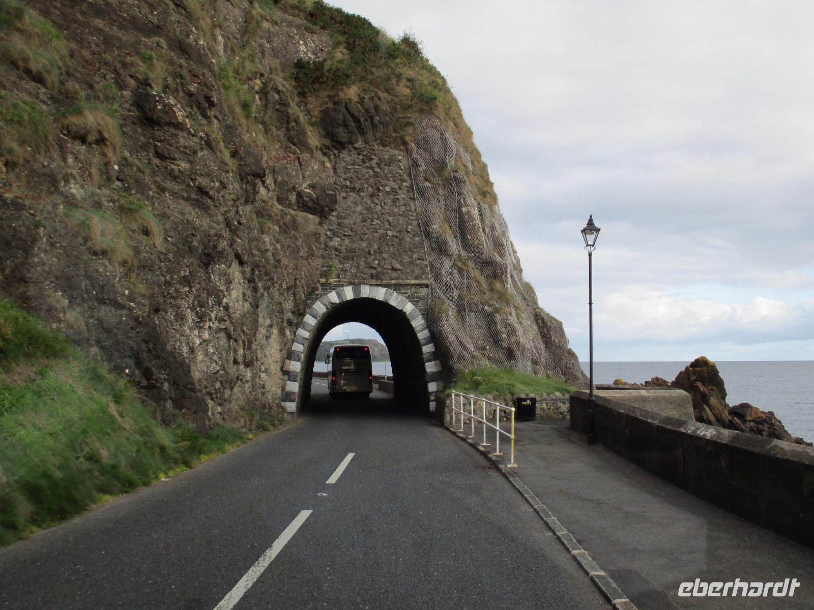 Bereits kurz nach der Abfahrt von unserem Hotel in Carrickfergus stoppte unser Bus für ein paar schöne Fotos vom Castle im Ort, das sich an einem kleinen Hafen befindet. Danach begann unsere herrliche Fahrt entlang der Antrim Coast Road. Das ist eine Küstenstraße, die uns an Sandstränden, Klippen und vom Meer umtosten Felsen entlang führt. Zur Krönung dieses besonderen Erlebnisses wurden wir mit einem Regenbogen belohnt. Wir fotografierten die beeindruckende Szenerie.
