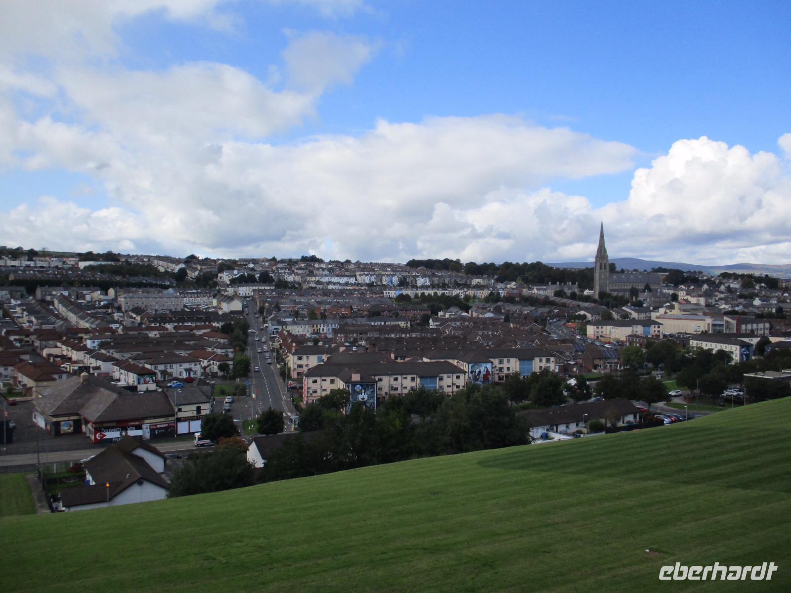 In dieser Stadt sind die blutigen Konflikte zwischen Protestanten und Katholiken noch gut in Erinnerung, zahlreiche Wandbilder und auch Monumente erinnern an diese schreckliche Zeit. Aber Derry / Londonderry heißt auch The Walled Town, weil das Zentrum komplett von einer noch intakten Stadtmauer eingeschlossen wird. Wir stiegen hinauf auf die Mauer und gingen ein Stück auf ihr entlang. Danach hatten wir noch Freizeit für Fotos vom Stadtteil Bogside und seinen Bildern an den Hauswänden oder einen Bummel durch die Stadt.